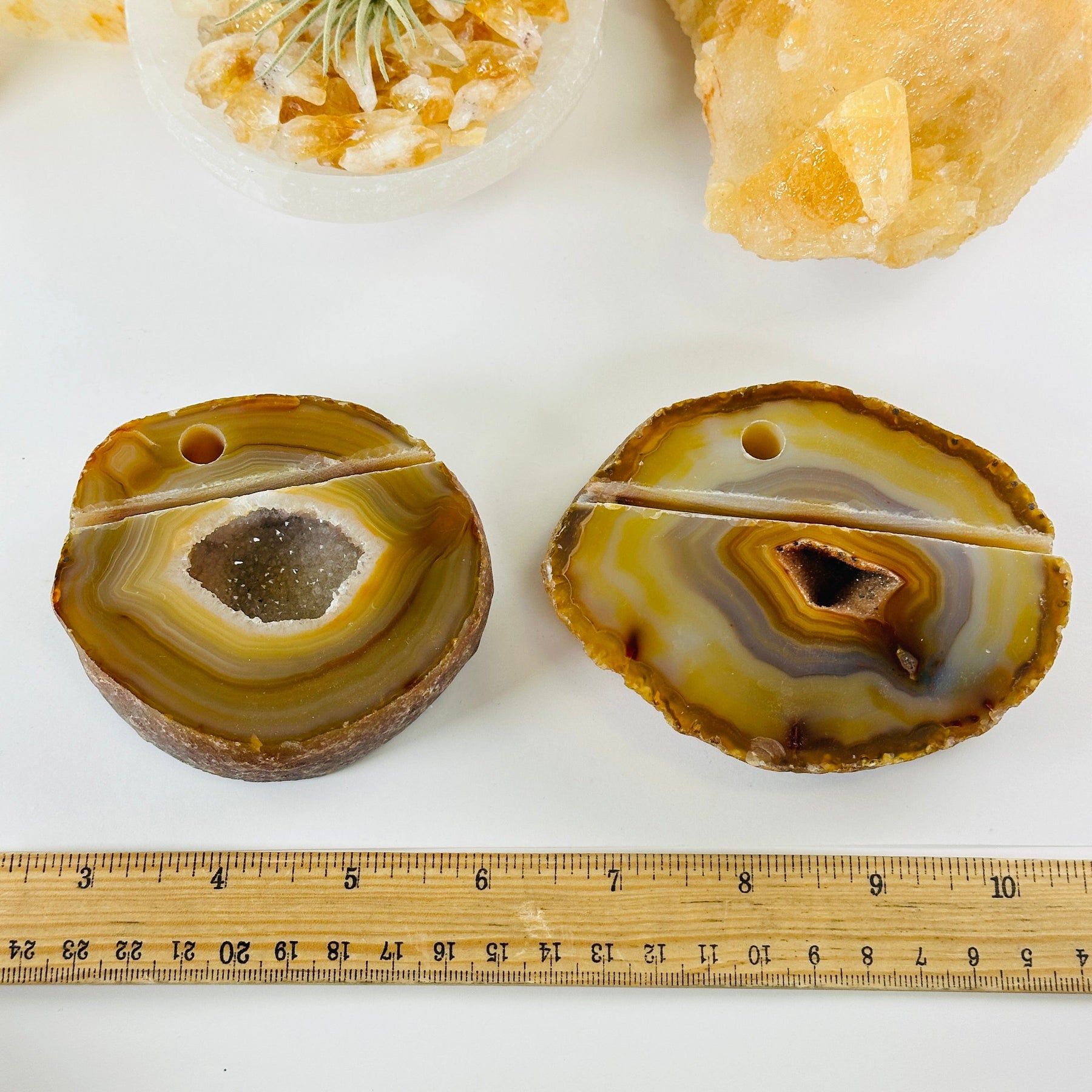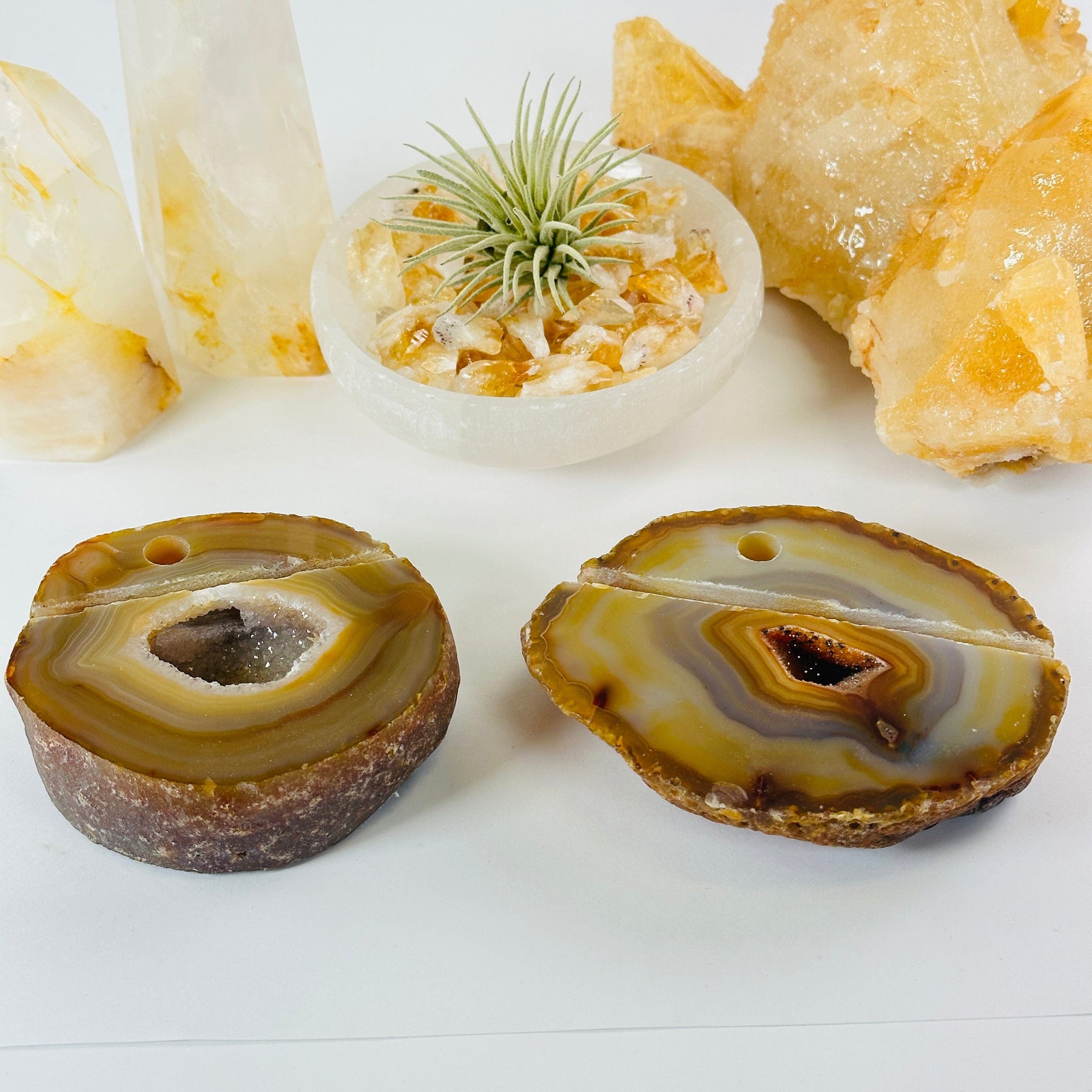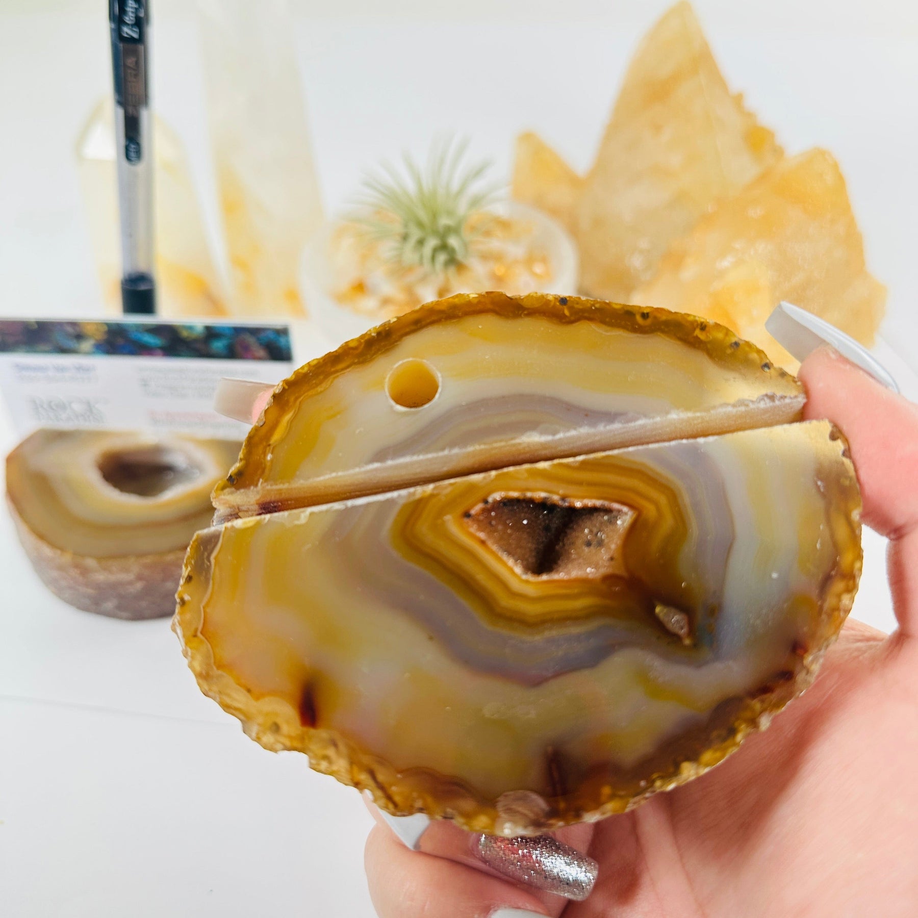 Charming brown agate geodes have been polished and carved to be able to hold business cards and a pen.