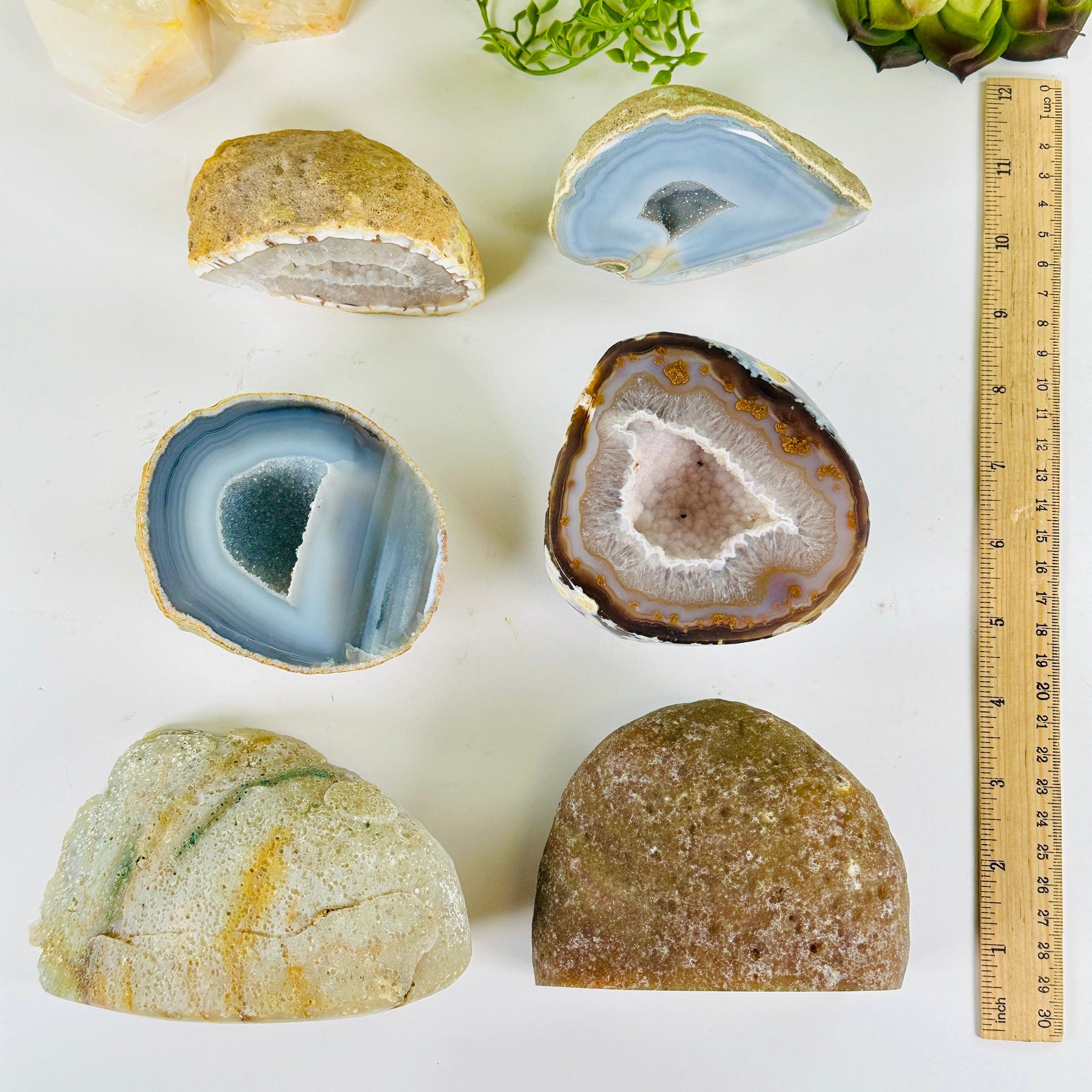 Lovely crystal stones have been sliced in half and polished to create these magnificent geode halves. With stunning small caves full of druzy crystals and agate banding surrounding them, they are sure to wow any collector and crystal lover.
