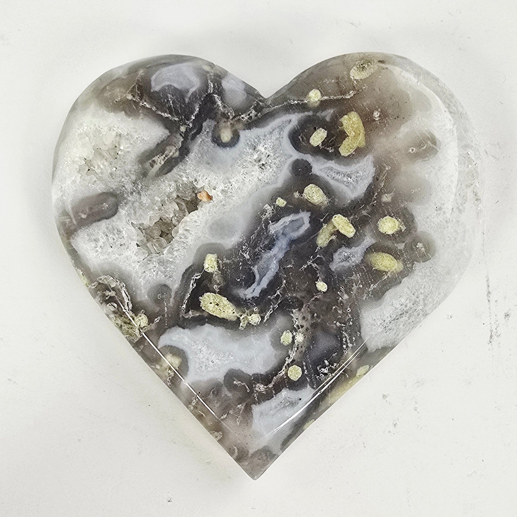 This moss agate crystal heart features pale druzy and agate banding with translucent crystals. The crystal can help bring positive energy into any room while also being a beautiful decoration.