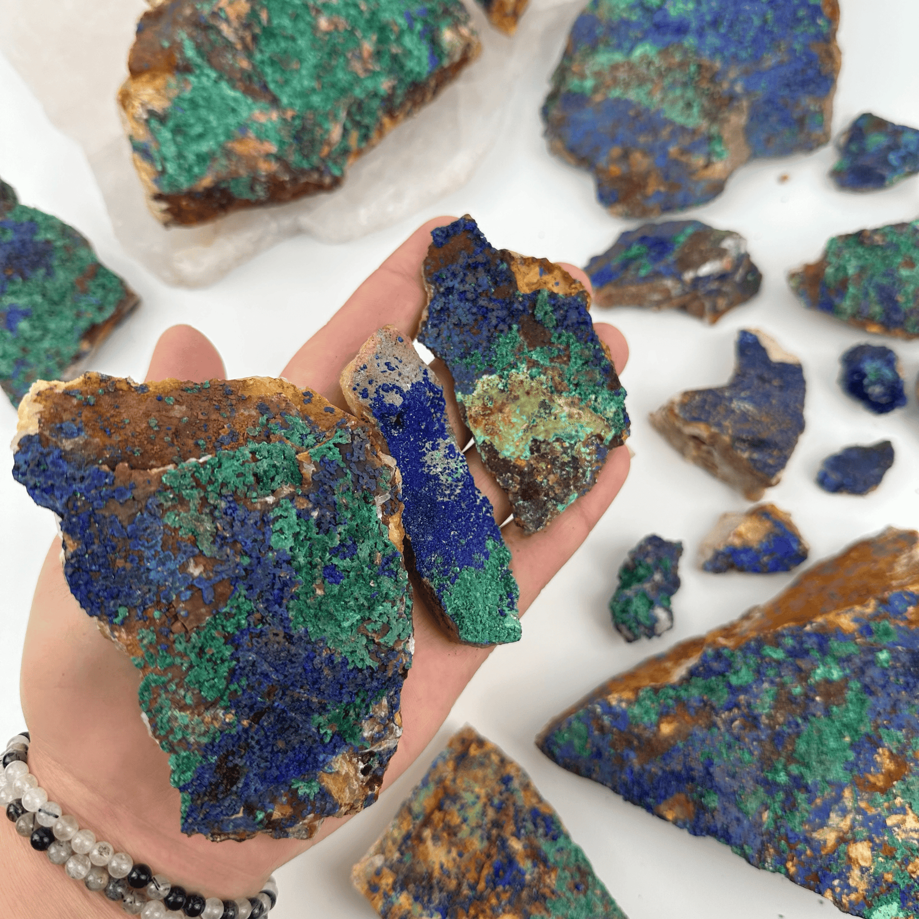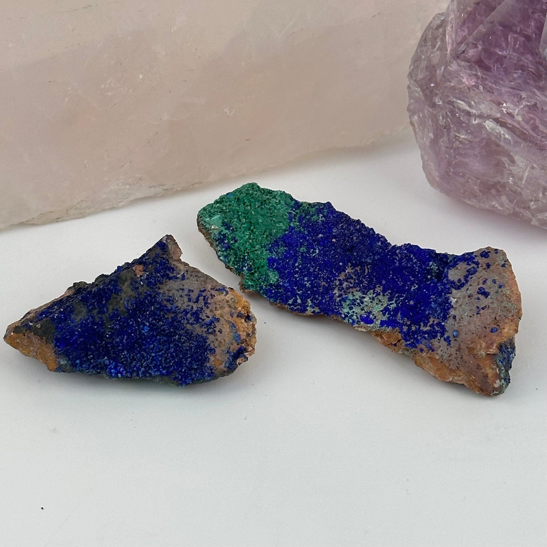 Add a rare gem to your collection with our Azurite with Malachite Stone. This stunning stone features bright blue azurite crystals beautifully intertwined with green malachite formations, making each piece unique and captivating.