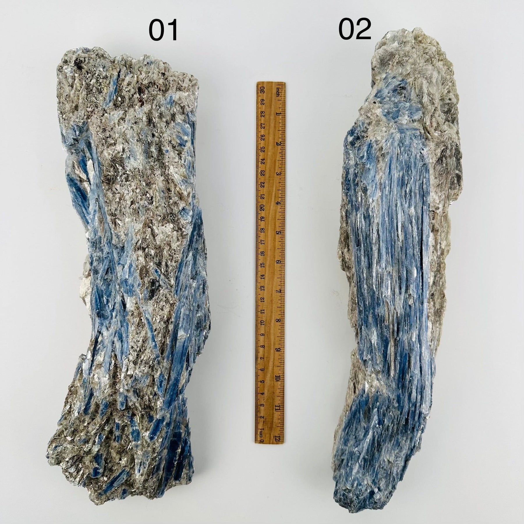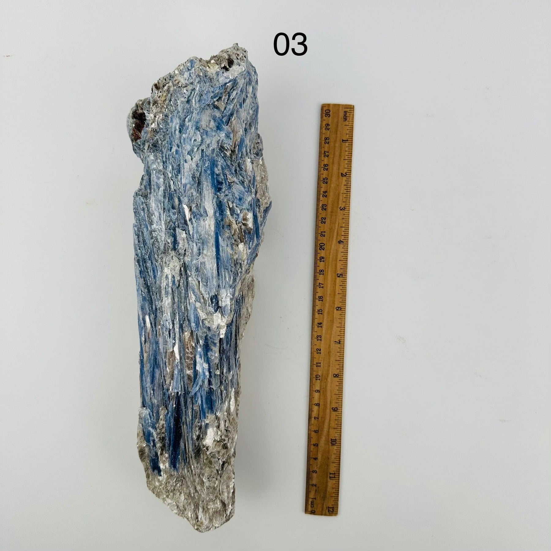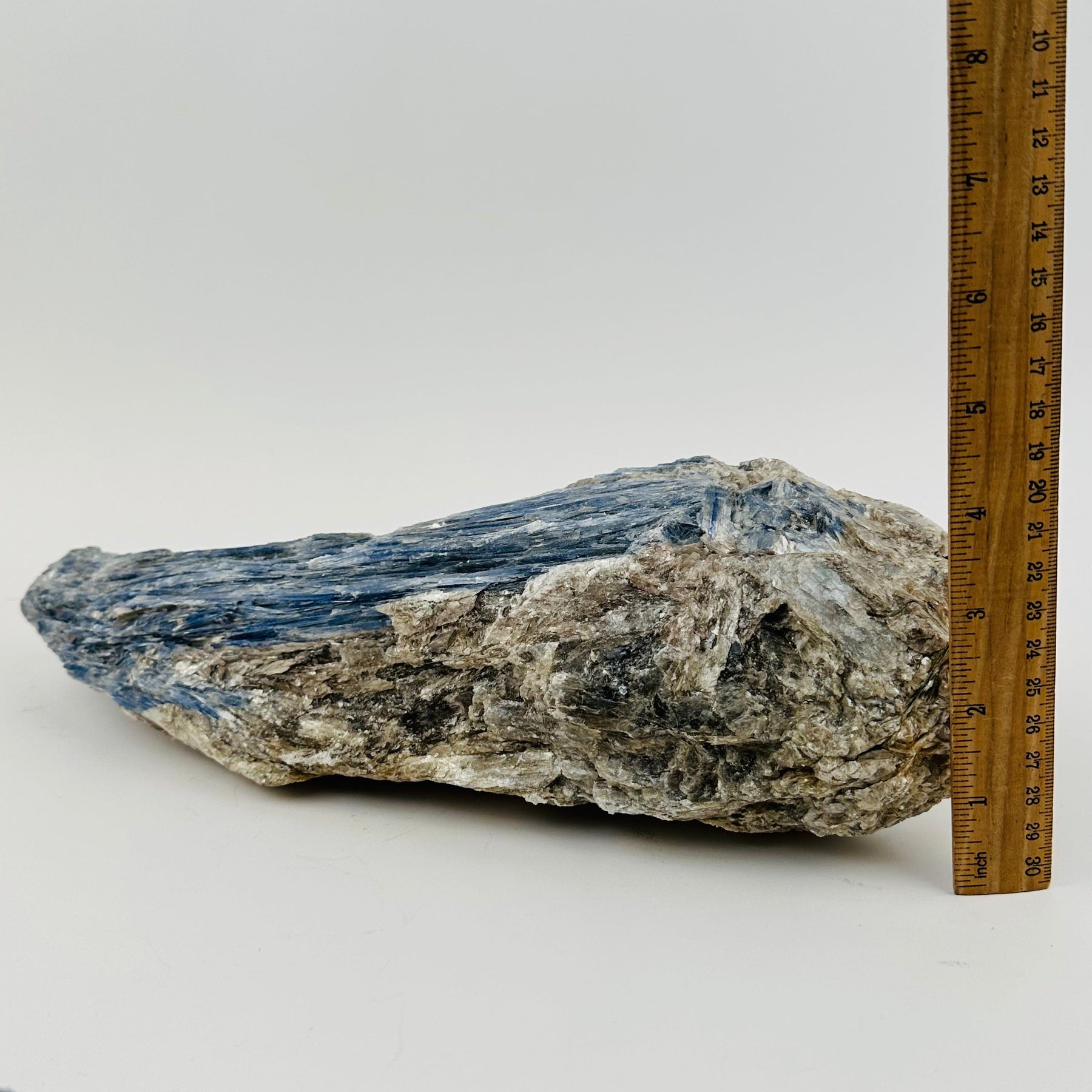 Blue Kyanite Rough Stone Crystal on Matrix displayed next to a ruler for size reference