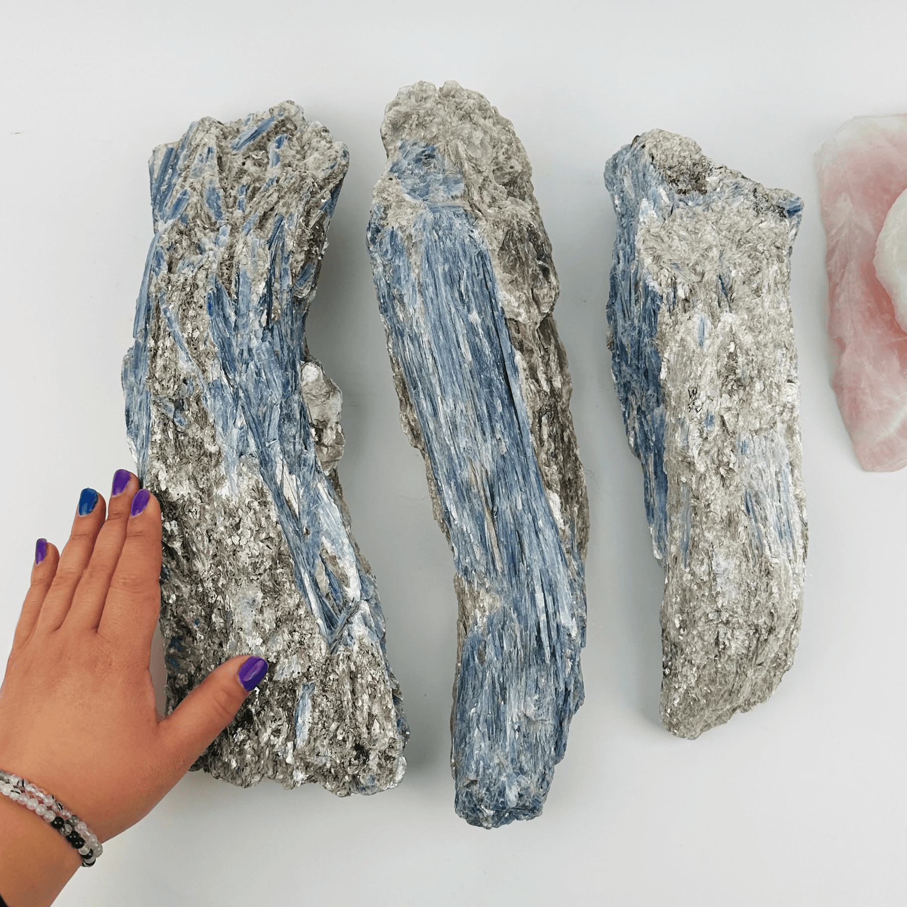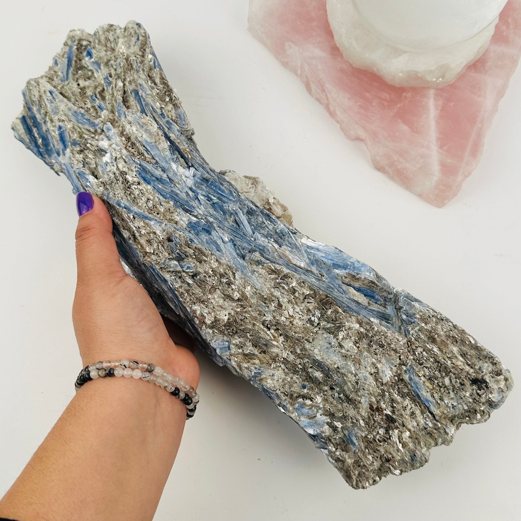 Blue Kyanite Rough Stone Crystal on Matrix displayed next to hand for size reference