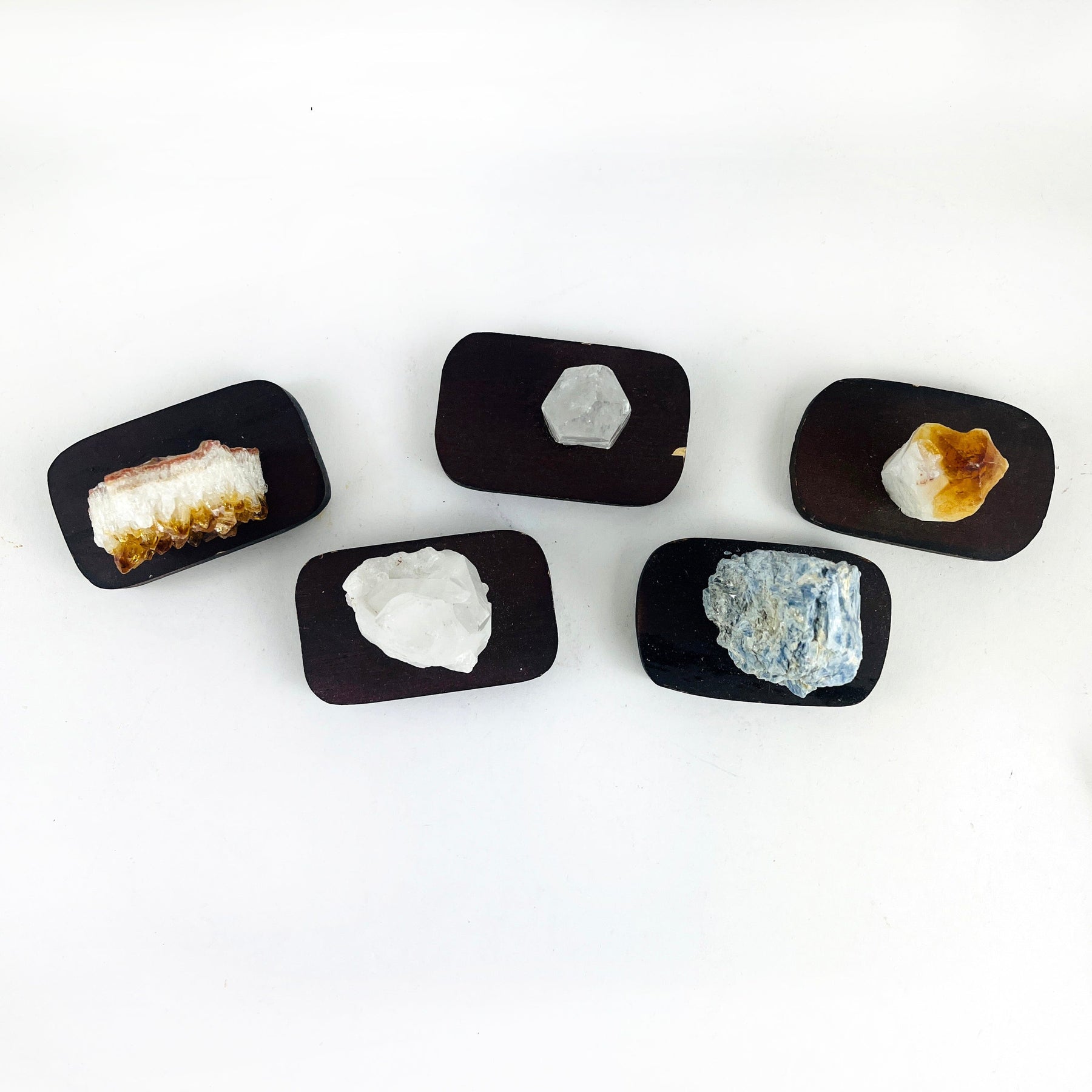 This set contains: Crystal Point, Crystal Cluster, Citrine Point, Citrine Cluster, and Blue Kyanite. Each securely displayed on a natural wooden base—ready to elevate any shelf, desk, or sacred space. It’s a complete mini collection in one beautiful piece!