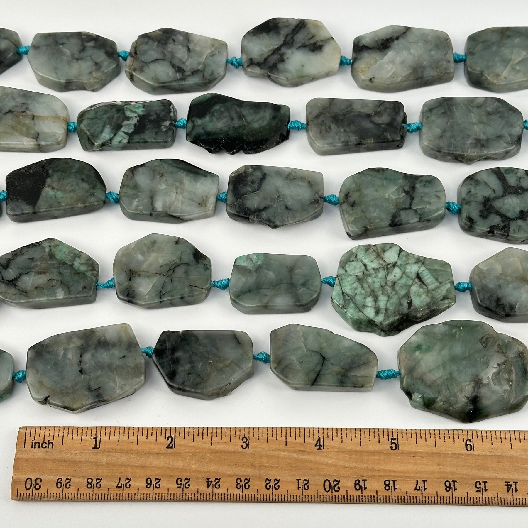 Emerald Freeform Crystal Bead Strands next to a ruler for size reference