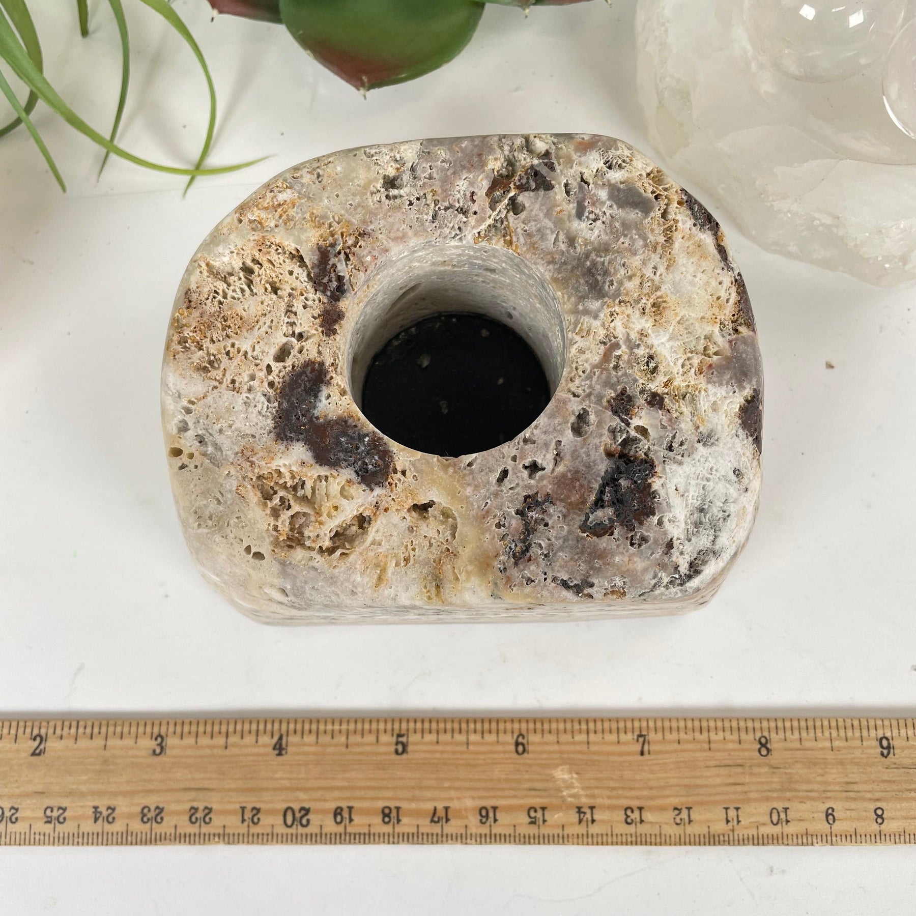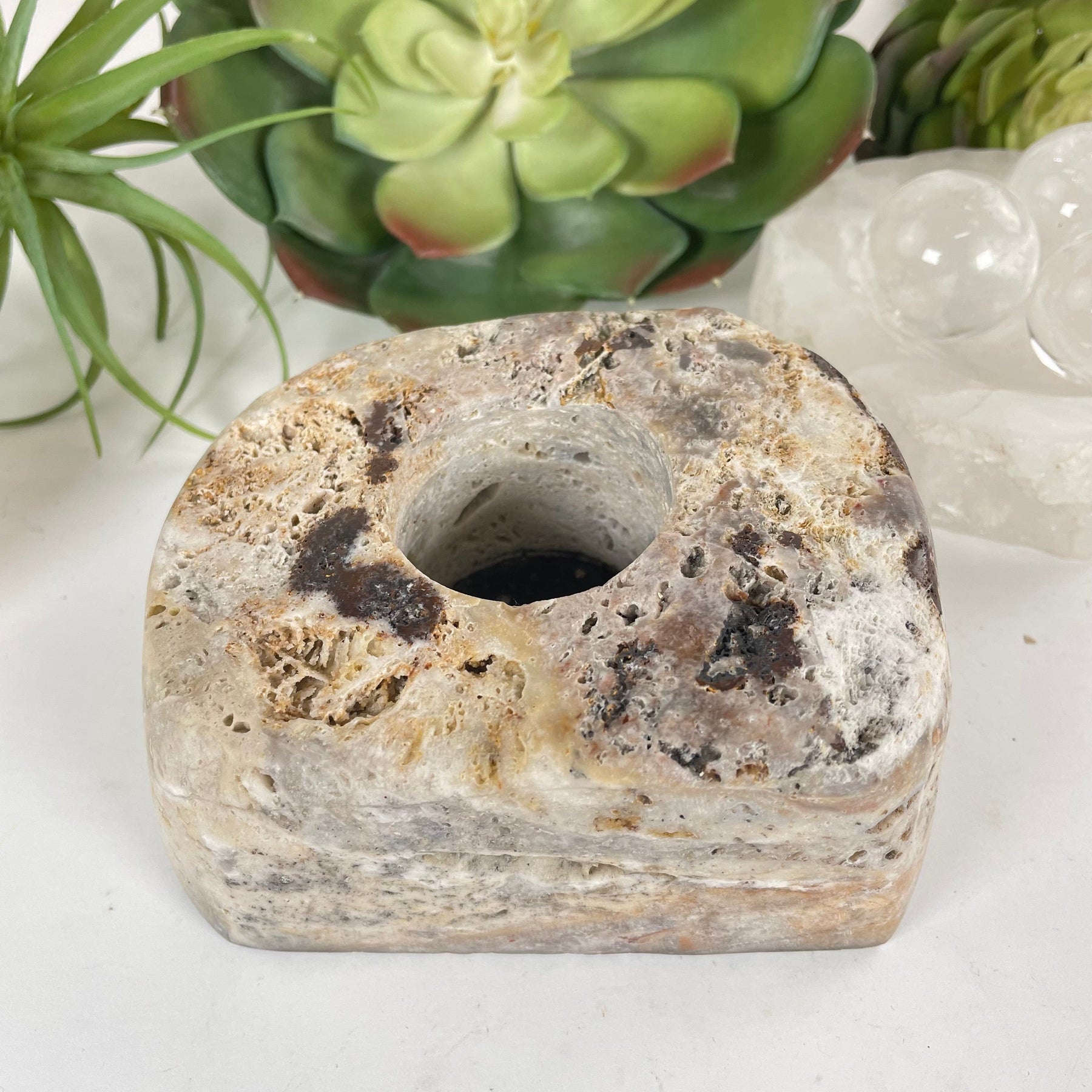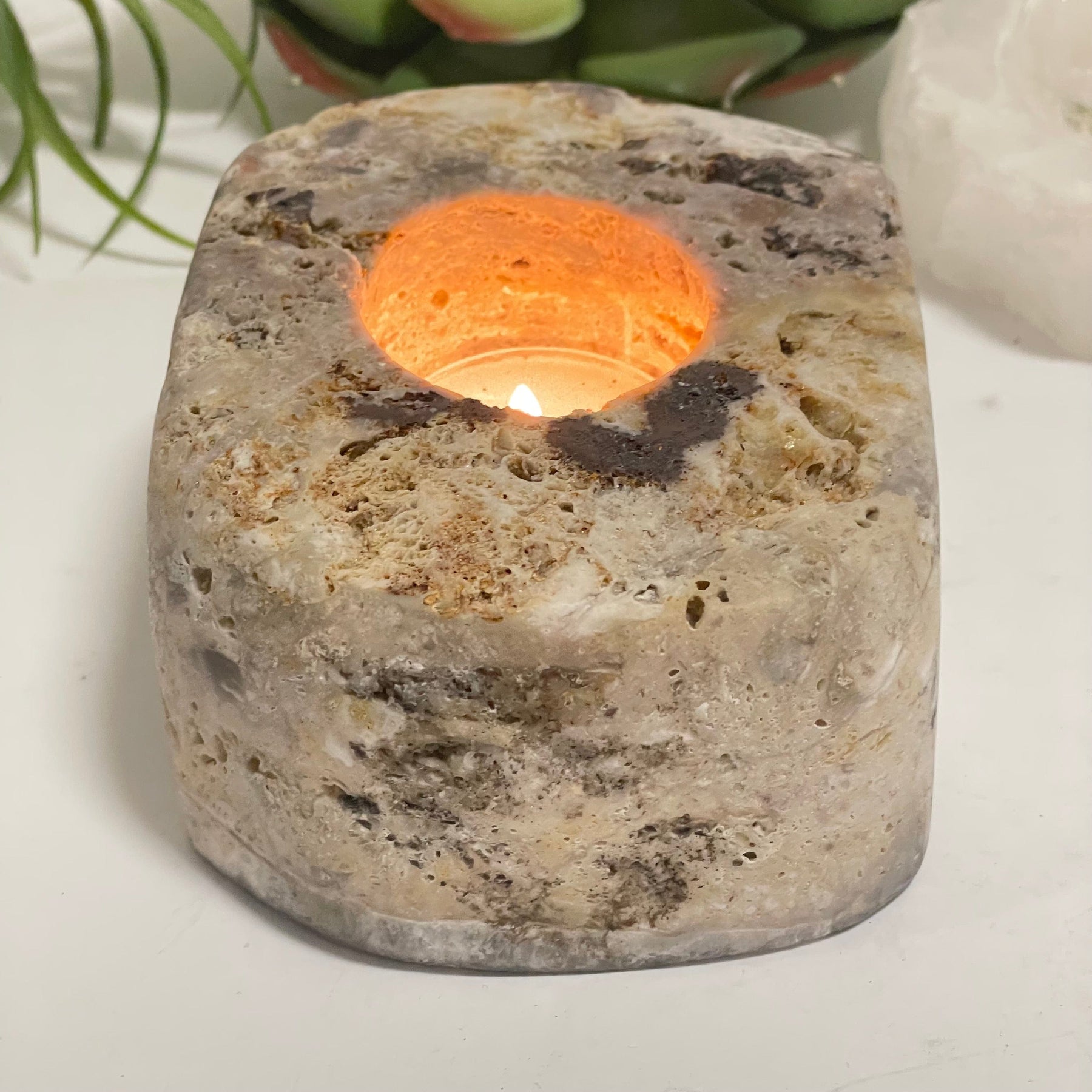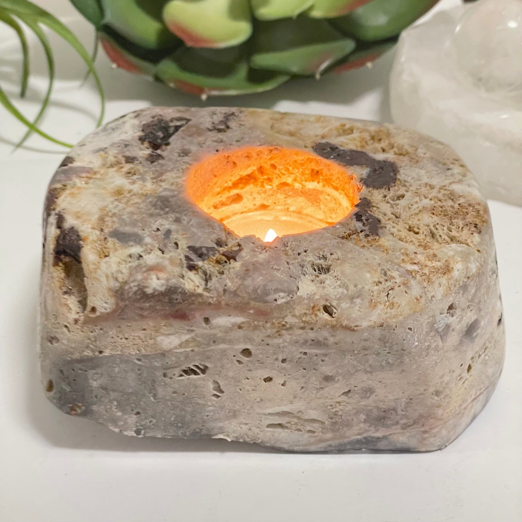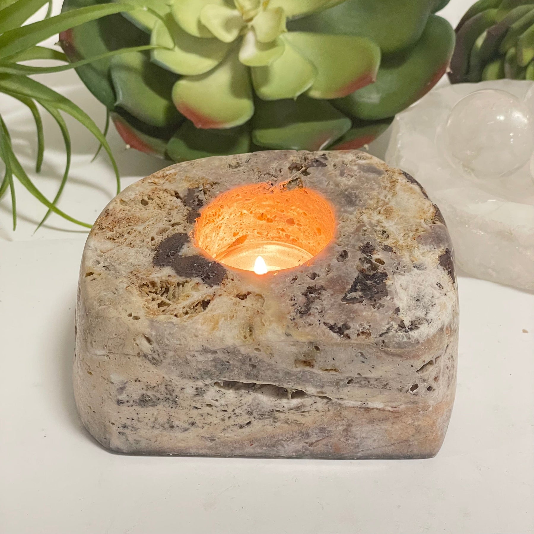 This pink amethyst candle holder has been carved into a freeform shape with a circular hole that fits a 1.5" tealight. Its smooth polished shape and tranquil light pink color will enhance any space. You can use it to light a romantic candlelit dinner, place it next to the bathtub for self-care and relaxation, or decorate any shelf space.