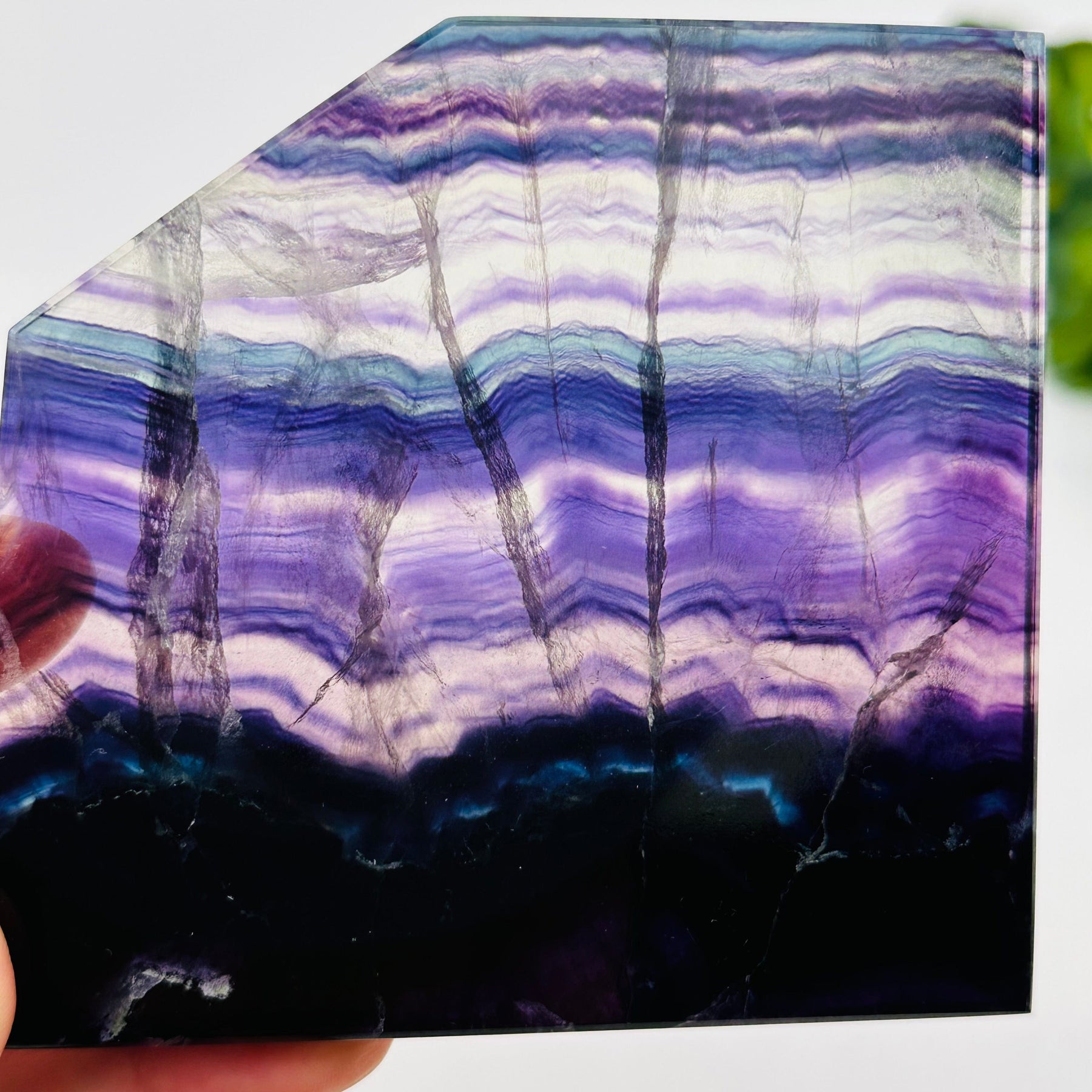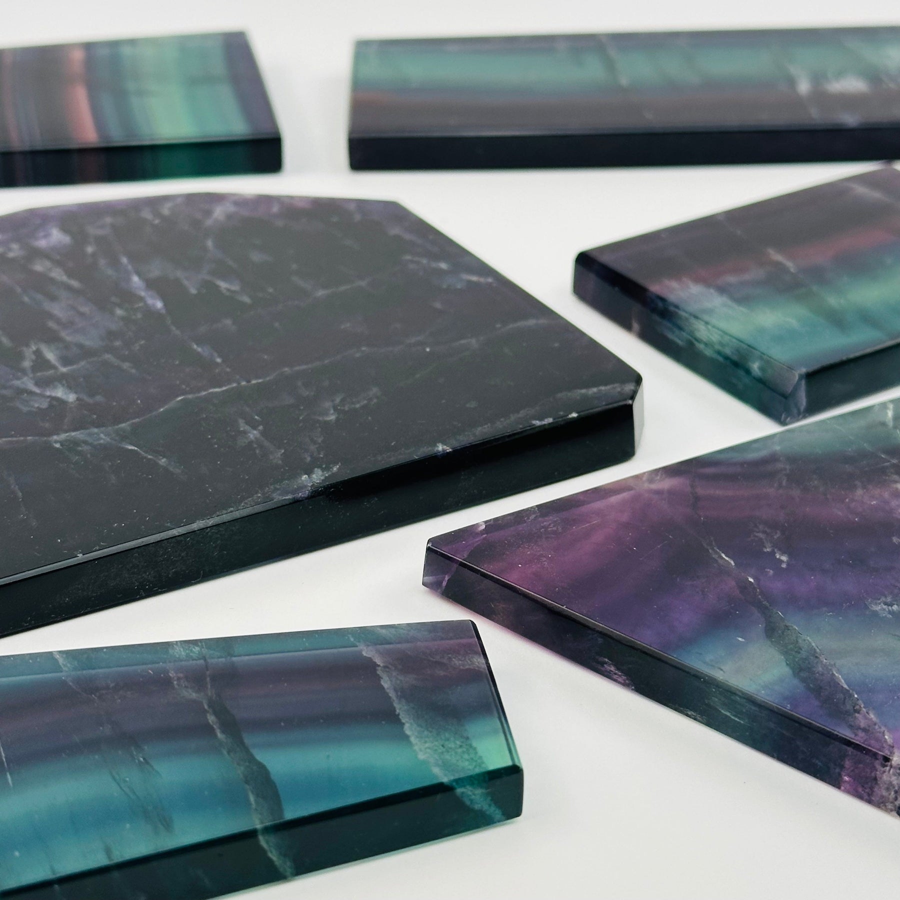 These free-formed slabs showcase mesmerizing swirls of purple, green, blue, and clear Fluorite, making each piece truly one of a kind.