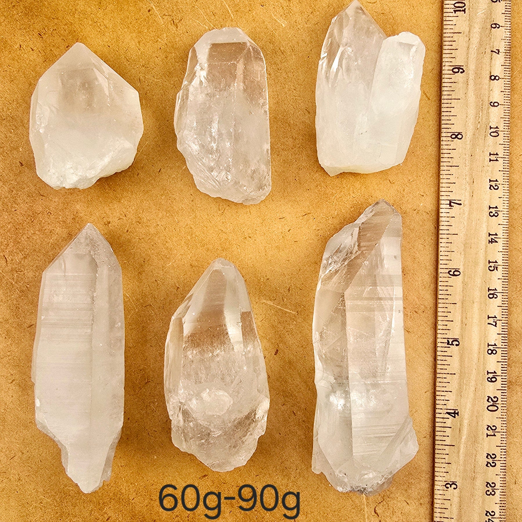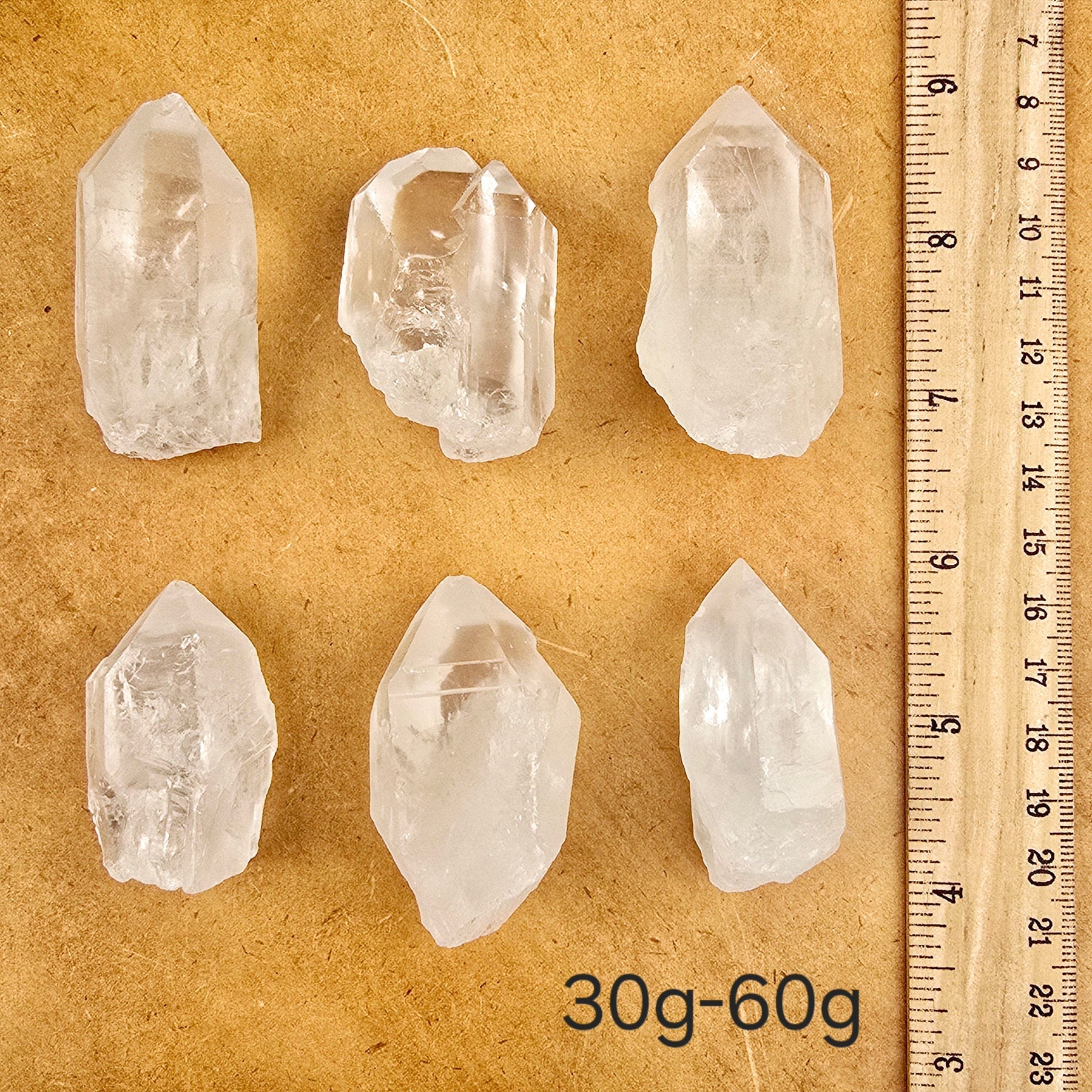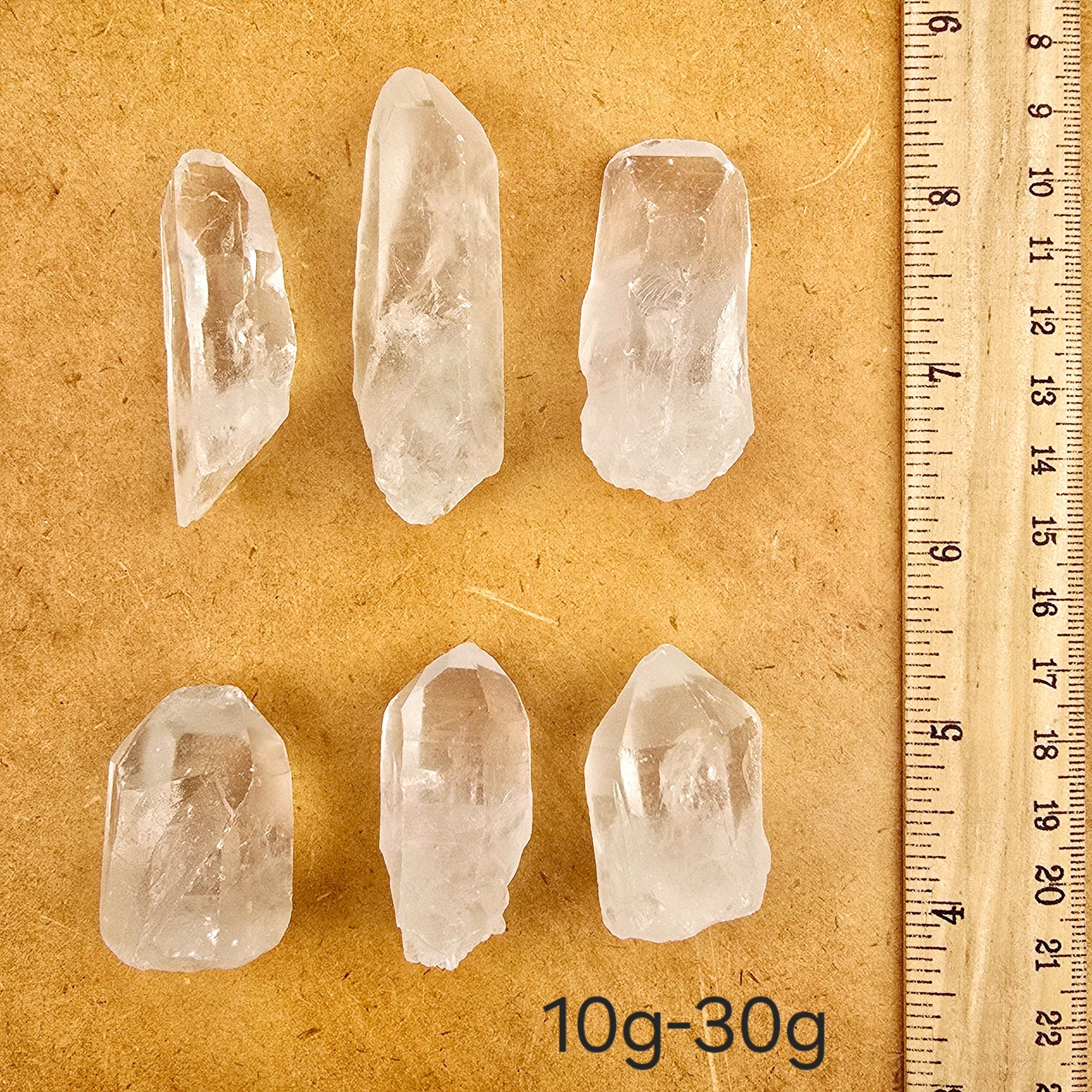 Beautiful clear crystal quartz points are extra grade quality. They are a stalwart in any crystal collection. Their versatility is highly prized. Use in crystal grids for meditation, give as a gift to someone special, or decorate and amplify any space with their beauty. Available in three weight categories: 10g-30g, 30g-60g, and 60g-90g.