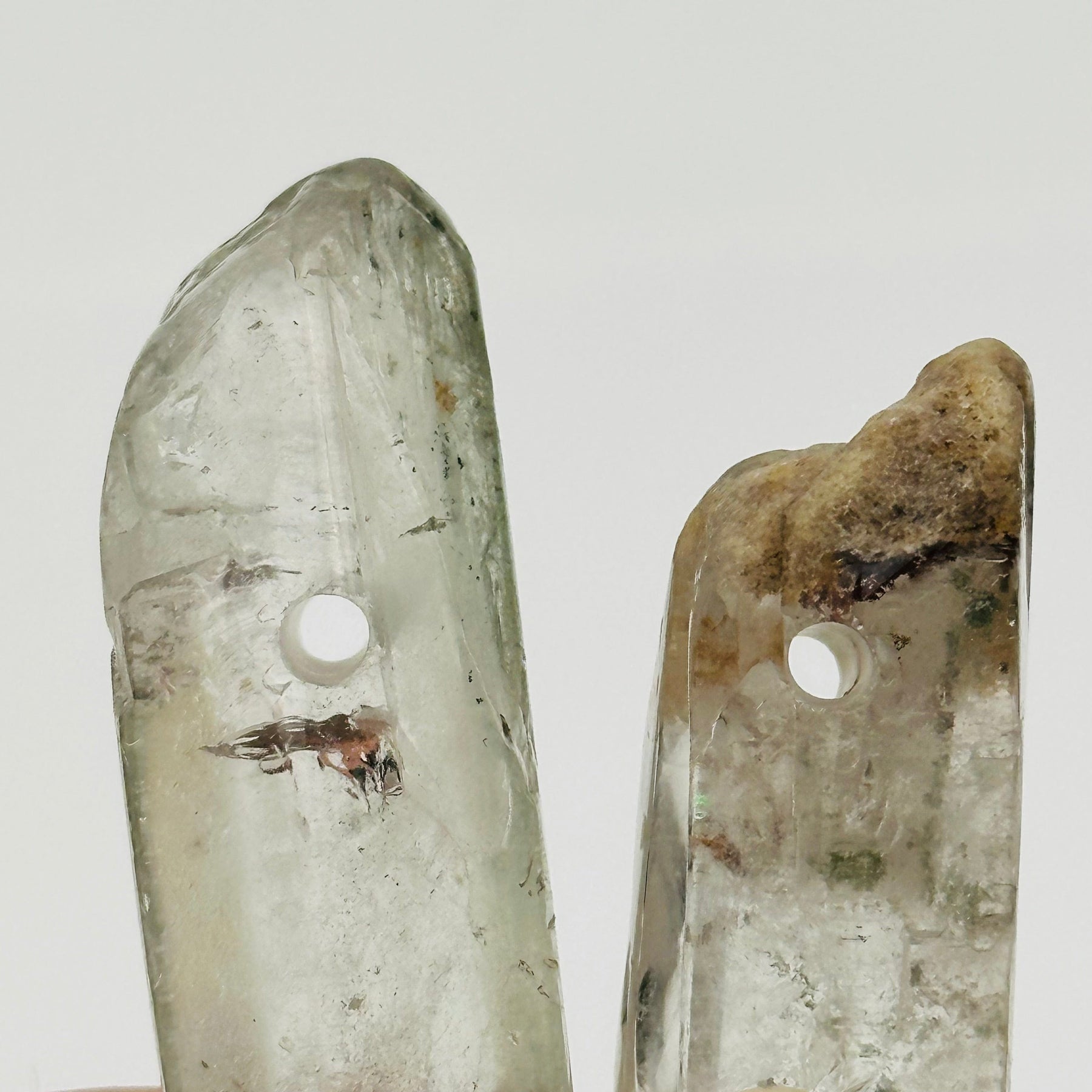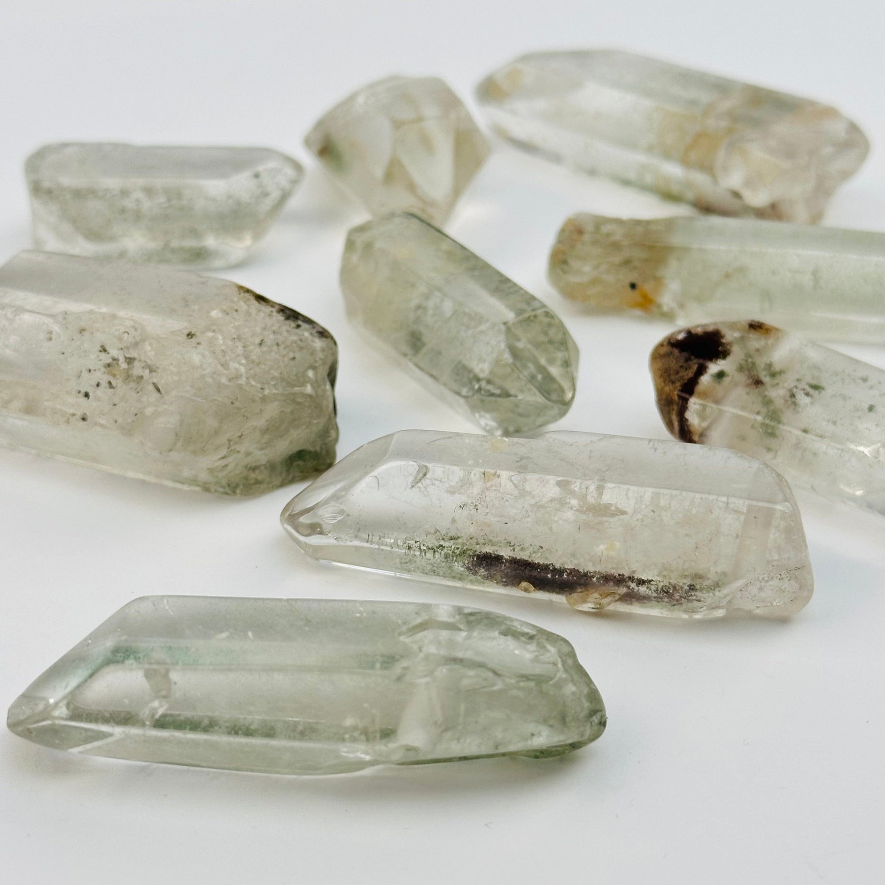 Each bead is like a miniature world—clear quartz infused with green chlorite, creating earthy, misty patterns that look like hidden gardens or enchanted forests inside the stone. No two are ever the same, making each bead a one-of-a-kind treasure.