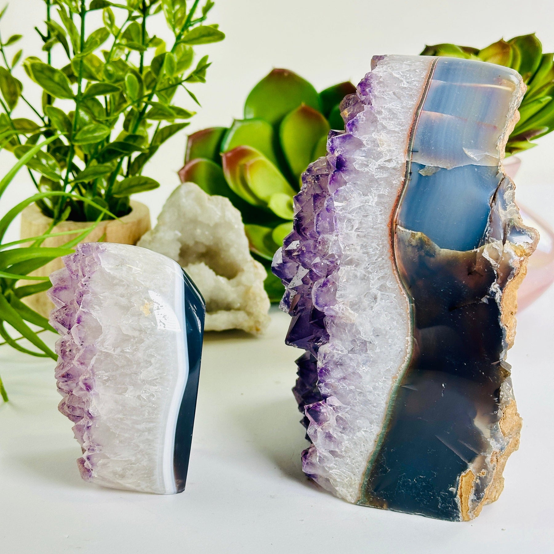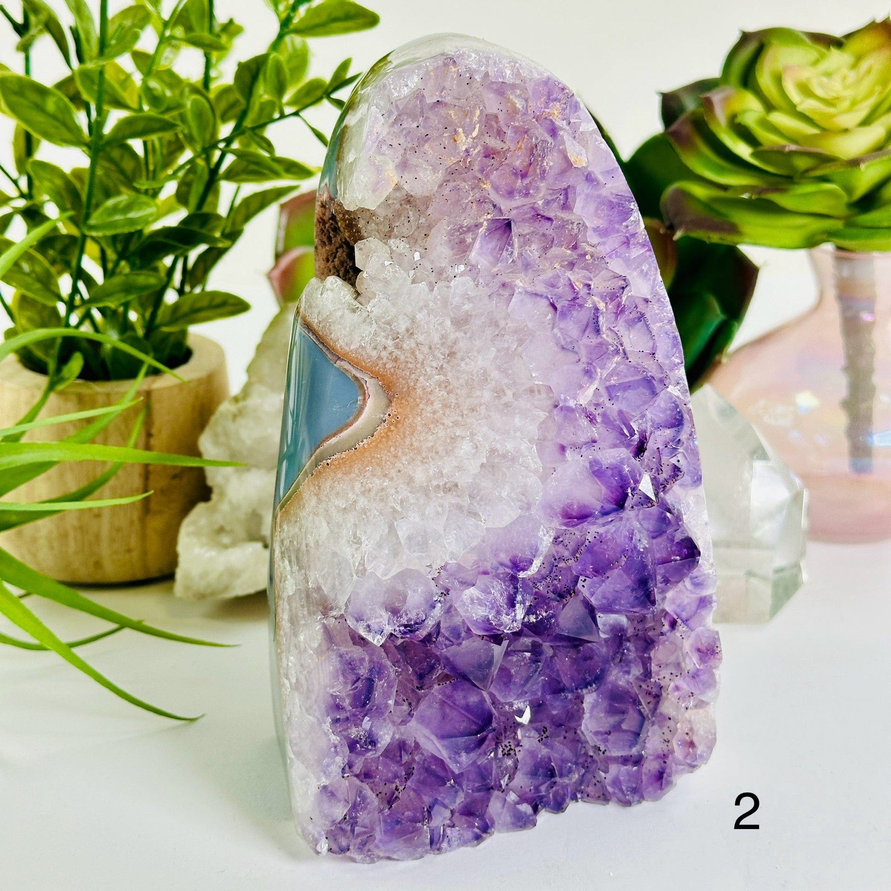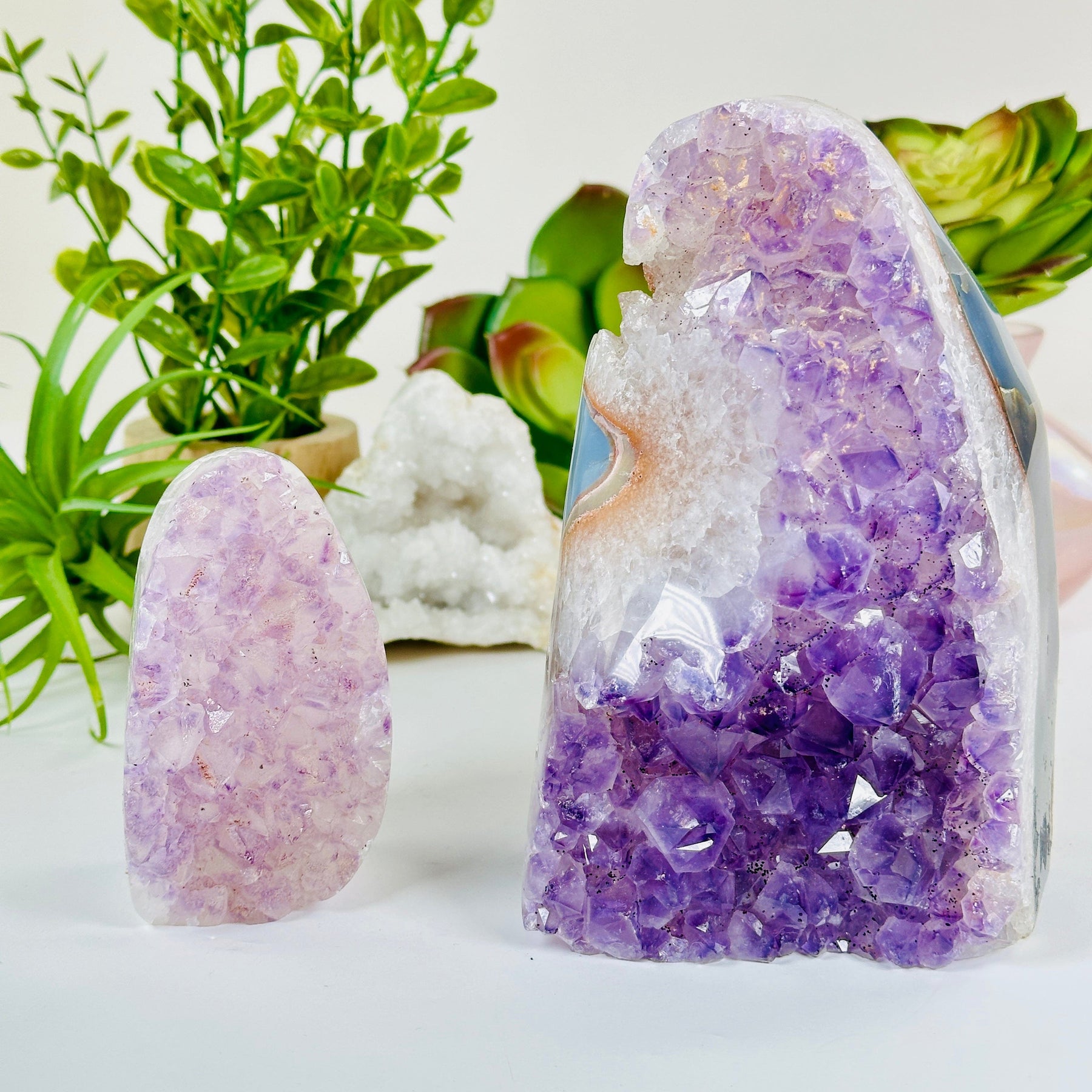 Amethyst Polished Crystal Cut Base - You Choose both variants front view with plants and props in the background