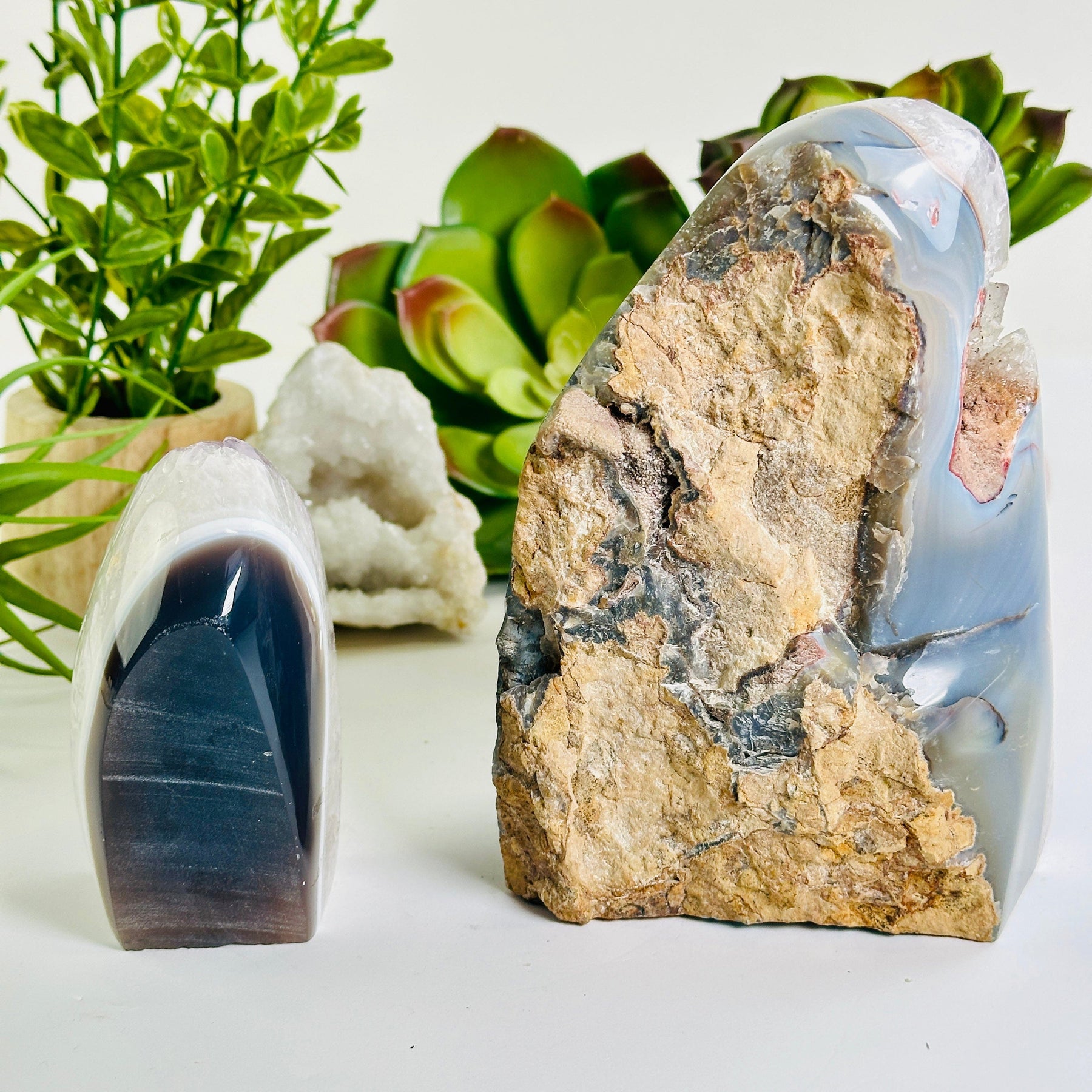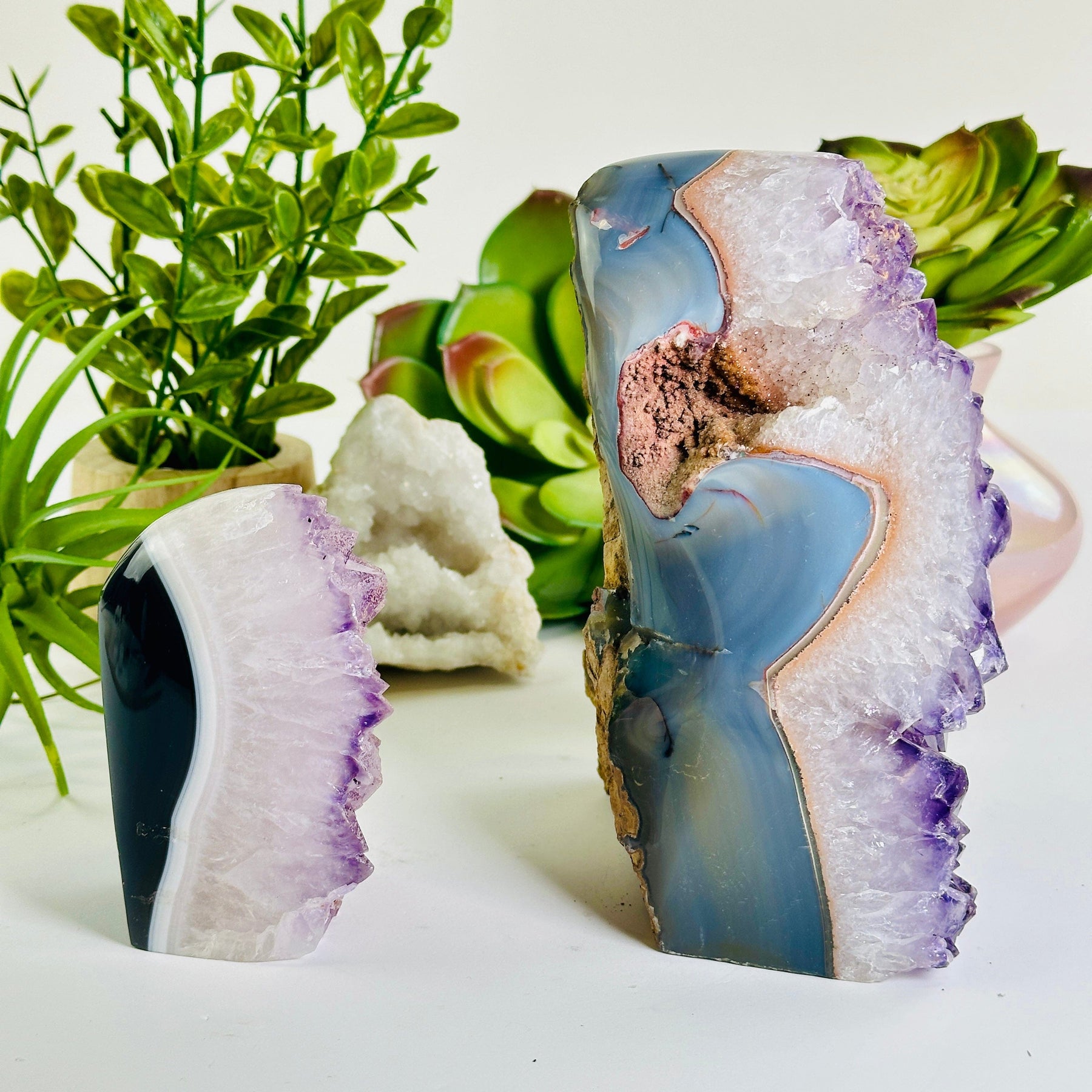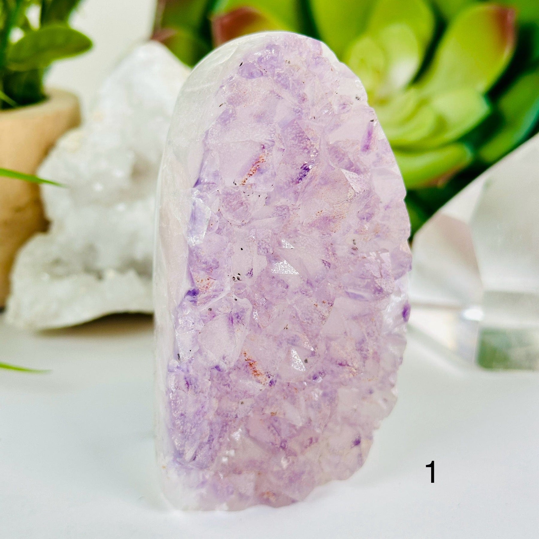 Amethyst Polished Crystal Cut Base - You Choose both variants front view with plants and props in the background