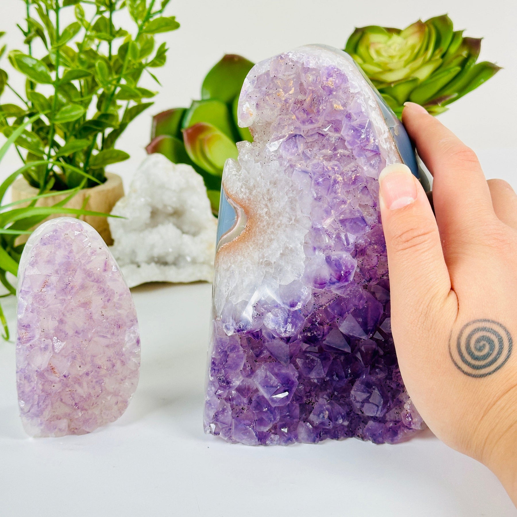 Amethyst Polished Crystal Cut Base - You Choose both variants with hand for size reference