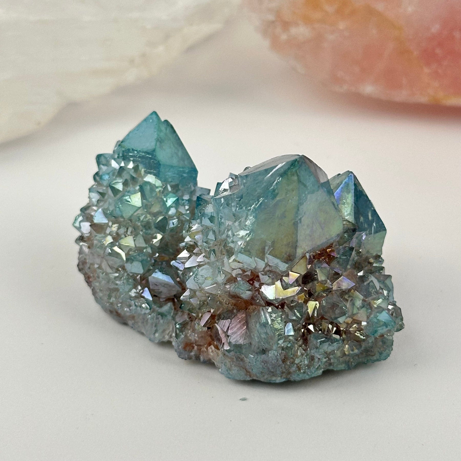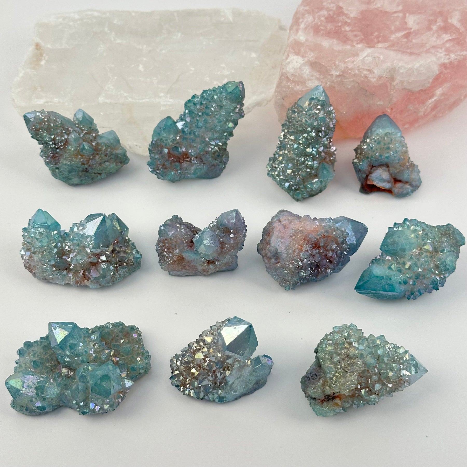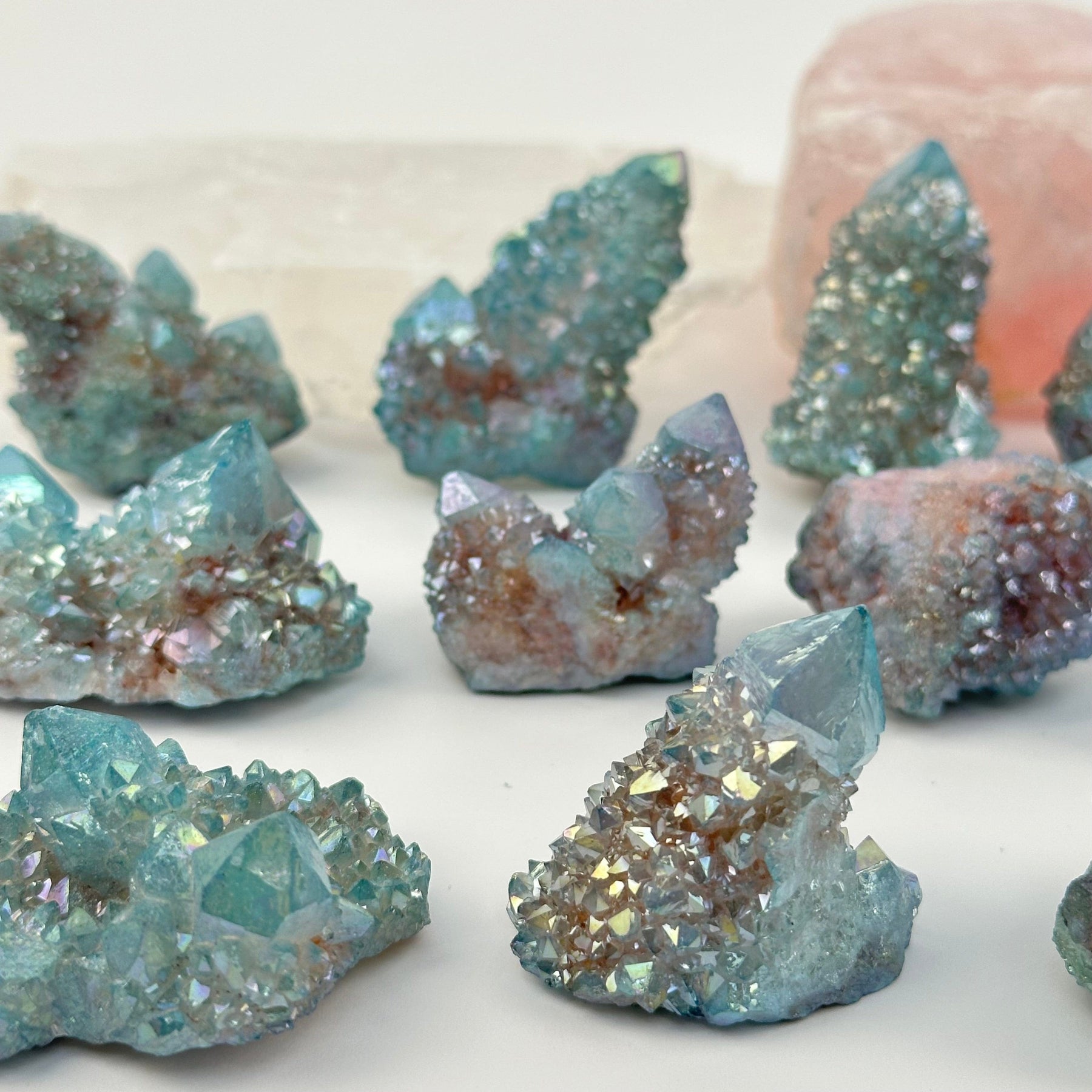 You’ll love these Aqua Cactus Quartz (Spirit Quartz) points for their sparkling crystal formations and vibrant aqua tones. Coated with aqua titanium, they have a stunning iridescent finish that enhances their natural beauty. The many tiny points create an uplifting, high-energy feel that makes each piece truly special.