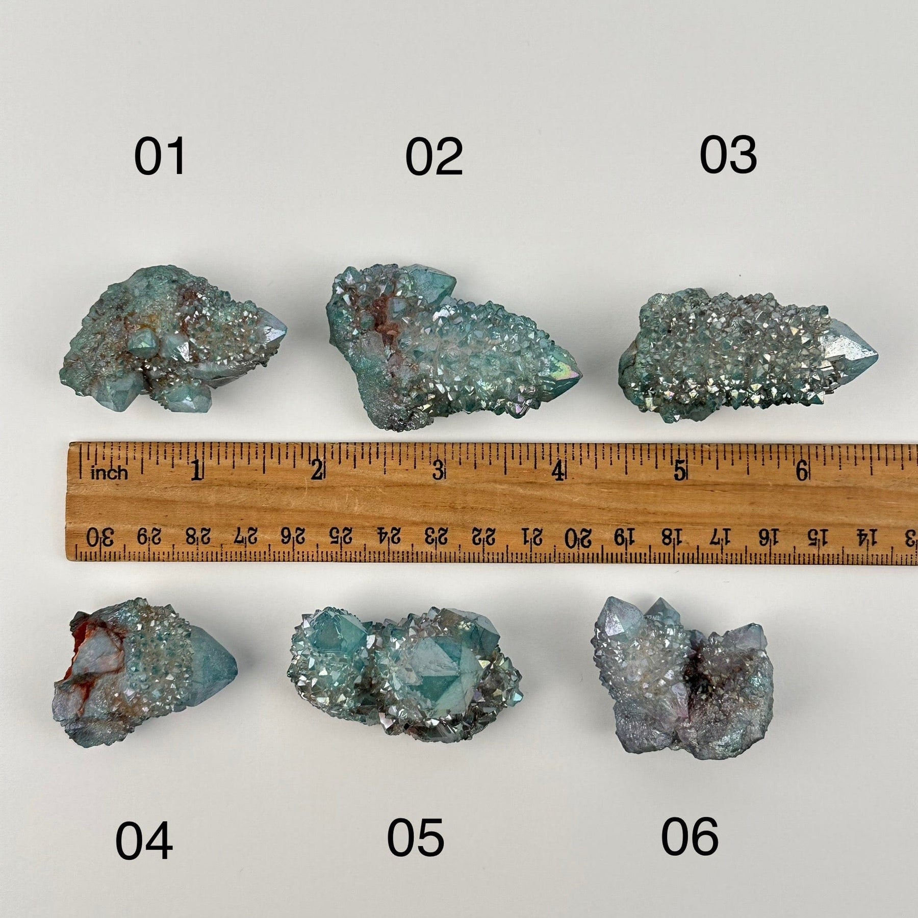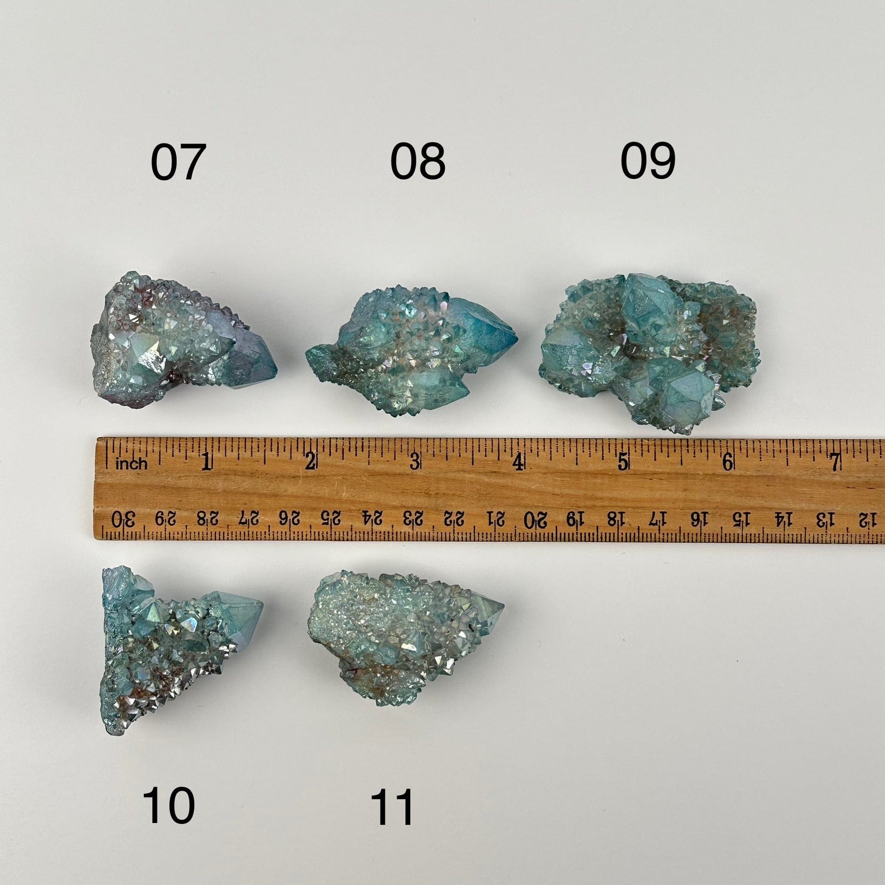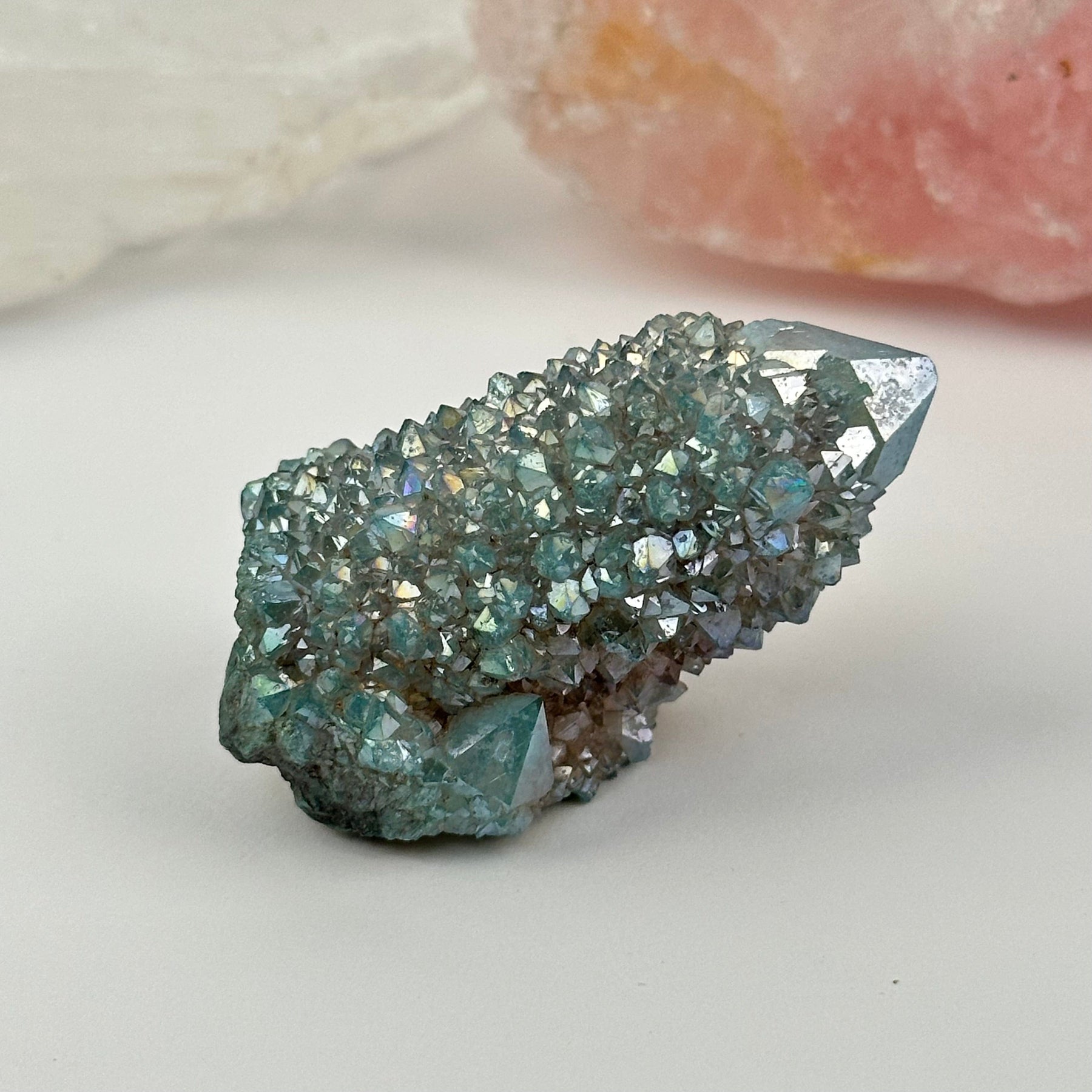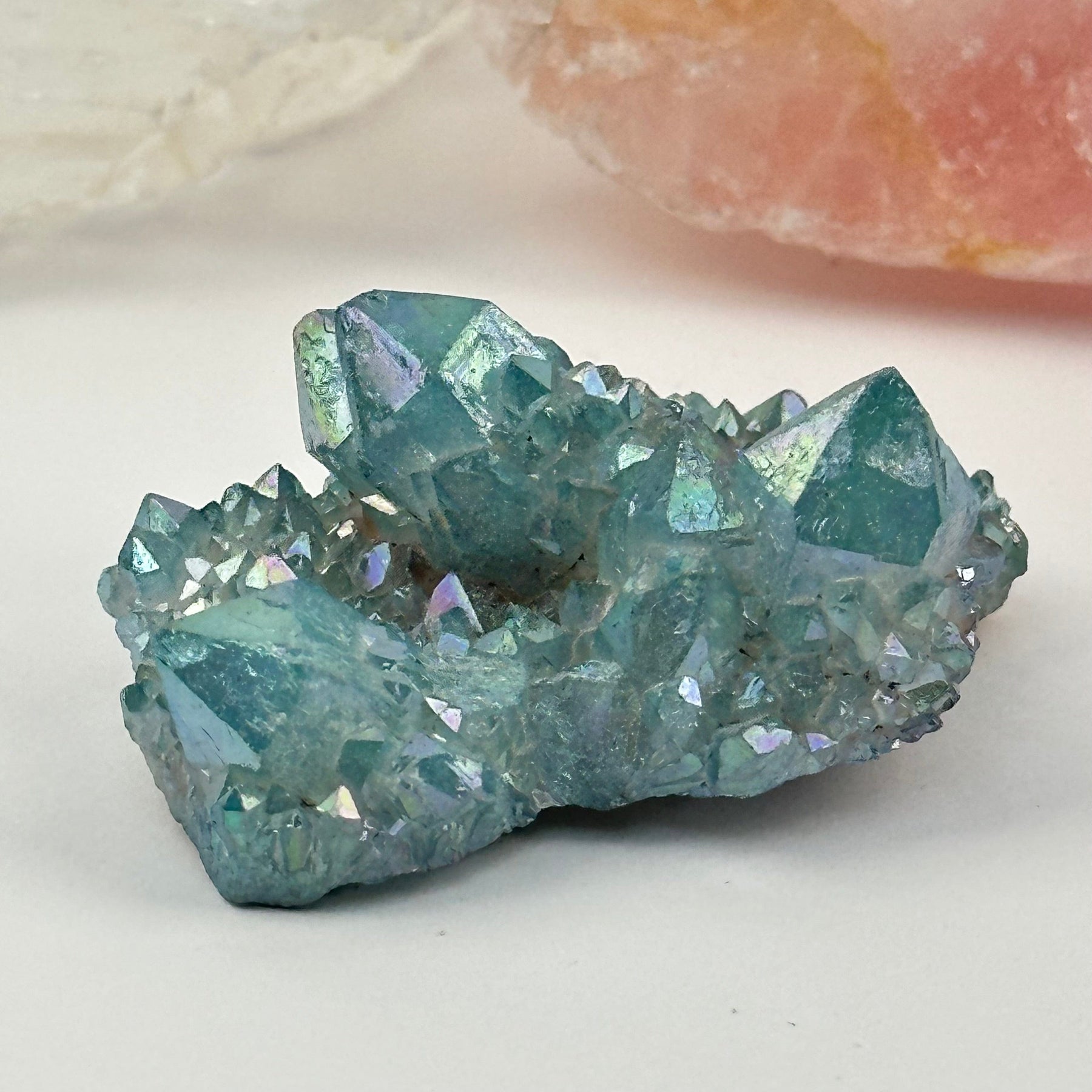 You’ll love these Aqua Cactus Quartz (Spirit Quartz) points for their sparkling crystal formations and vibrant aqua tones. Coated with aqua titanium, they have a stunning iridescent finish that enhances their natural beauty. The many tiny points create an uplifting, high-energy feel that makes each piece truly special.