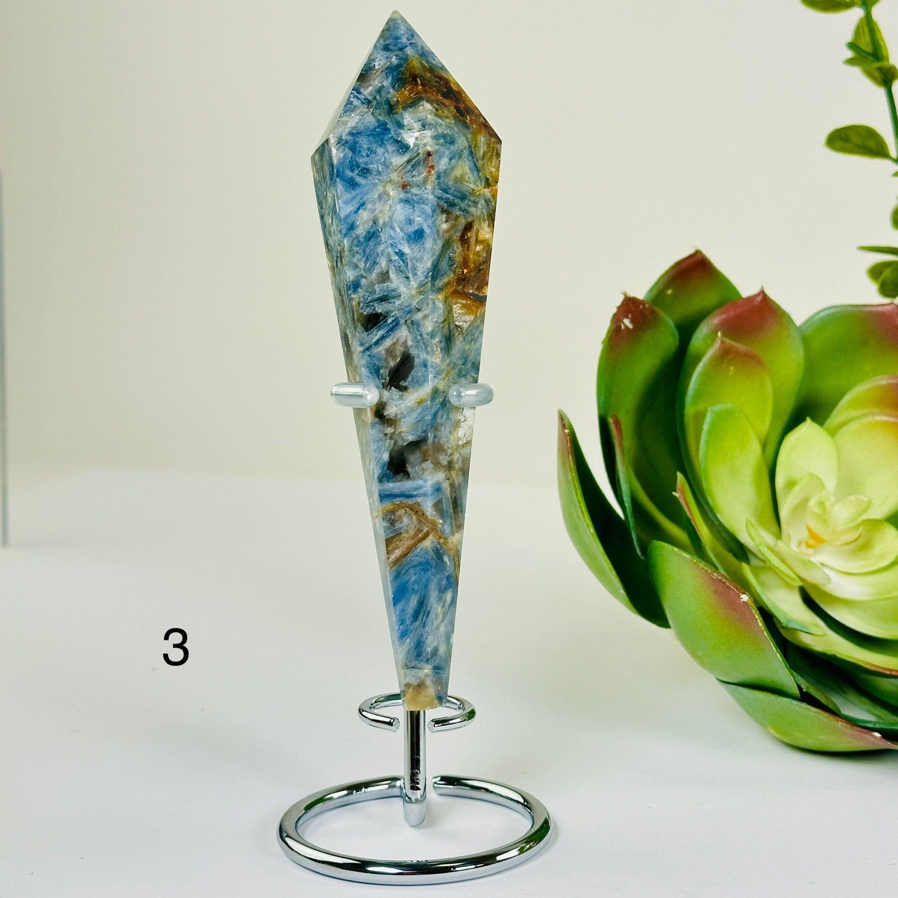 This listing is for ONE (1) Blue Kyanite Polished Crystal Wand on Stand. UOOAK-S4-200
