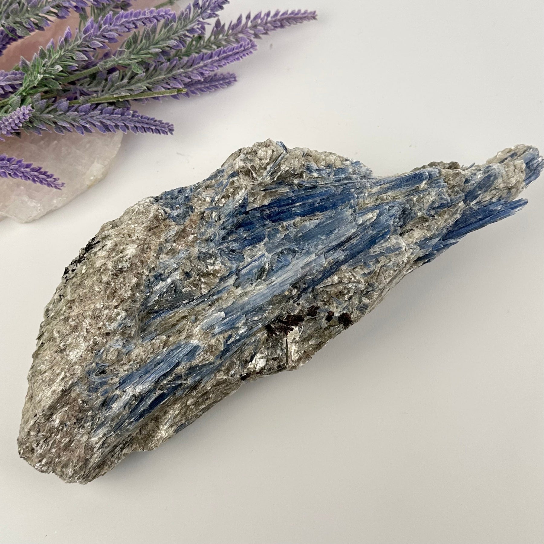 Natural blue kyanite crystal in its rough form, naturally attached to matrix. Known for its striking blue blades and raw texture, each piece showcases unique crystal growth and natural variations. Blue kyanite is commonly associated with communication, clarity, and energetic balance. It is believed to help align the chakras, encourage honest expression, and promote calm, focused energy.