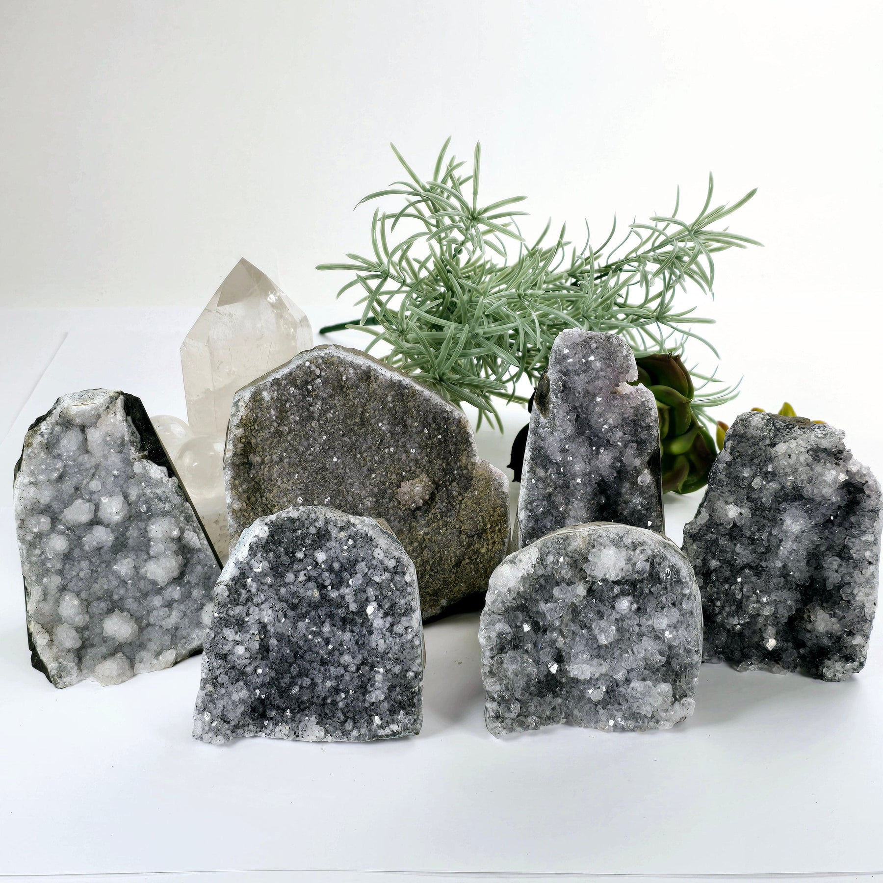 These gray amethyst crystal clusters have been shaped into crystal cut bases with raw edges.