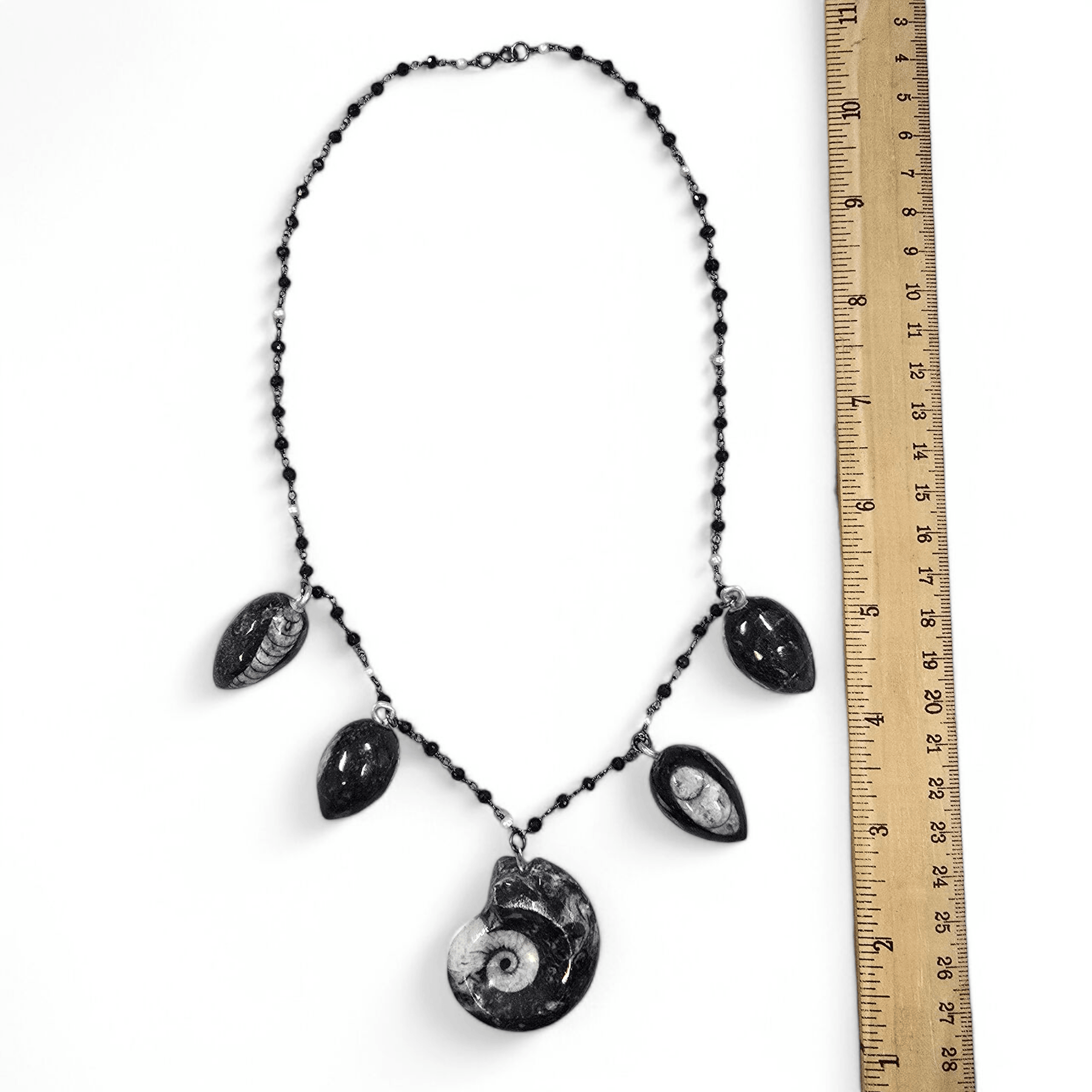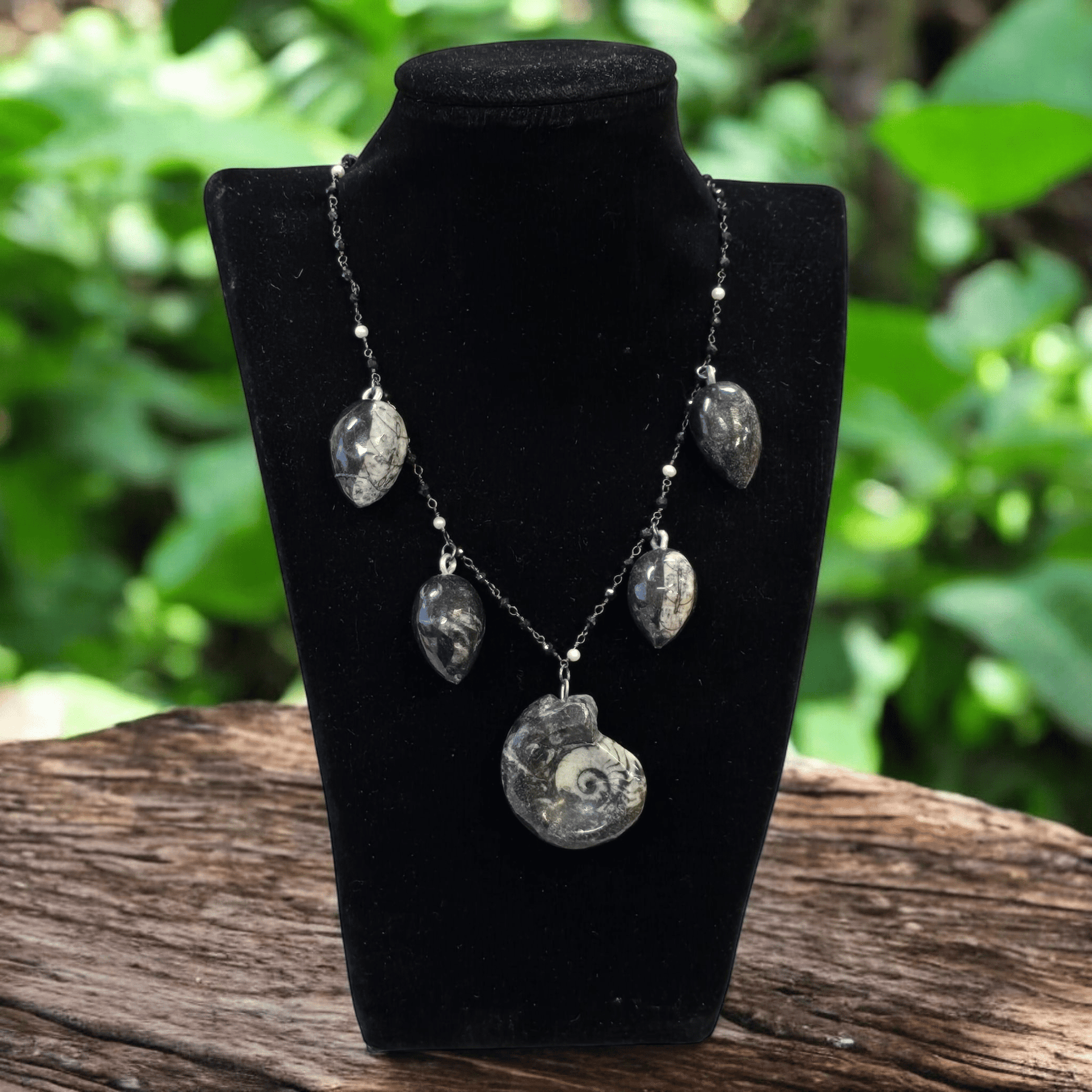 Ammonite and Orthoceras Fossil Charm Necklace with Black Spinel and Pearl Oxidized Sterling Silver Chain - Handmade