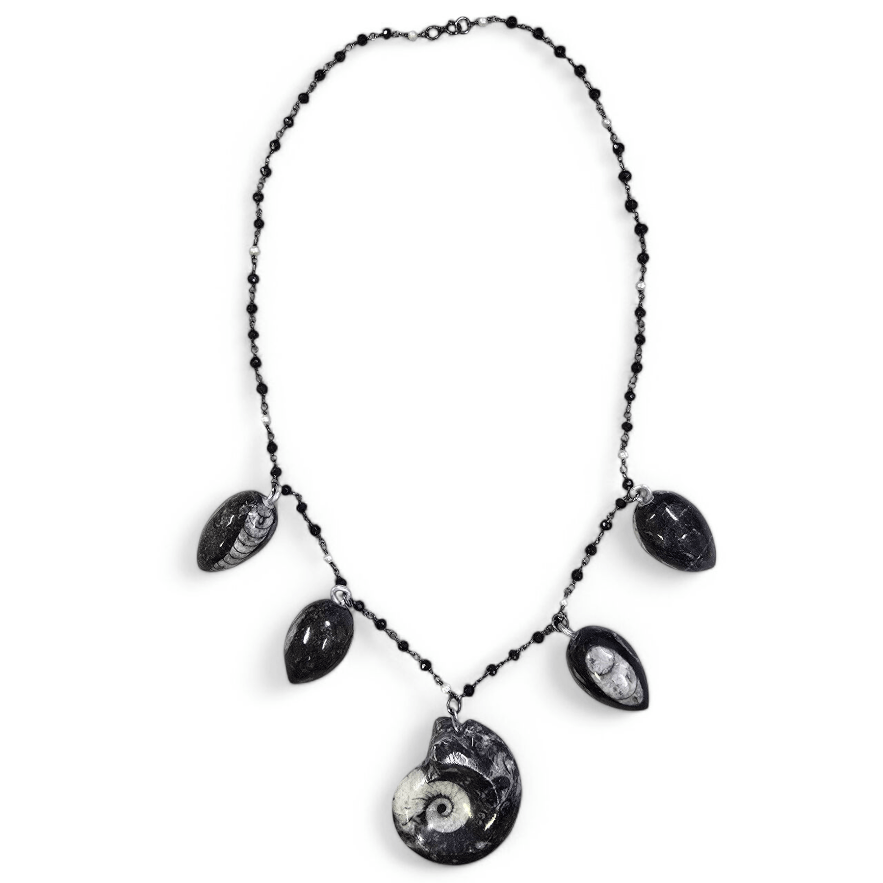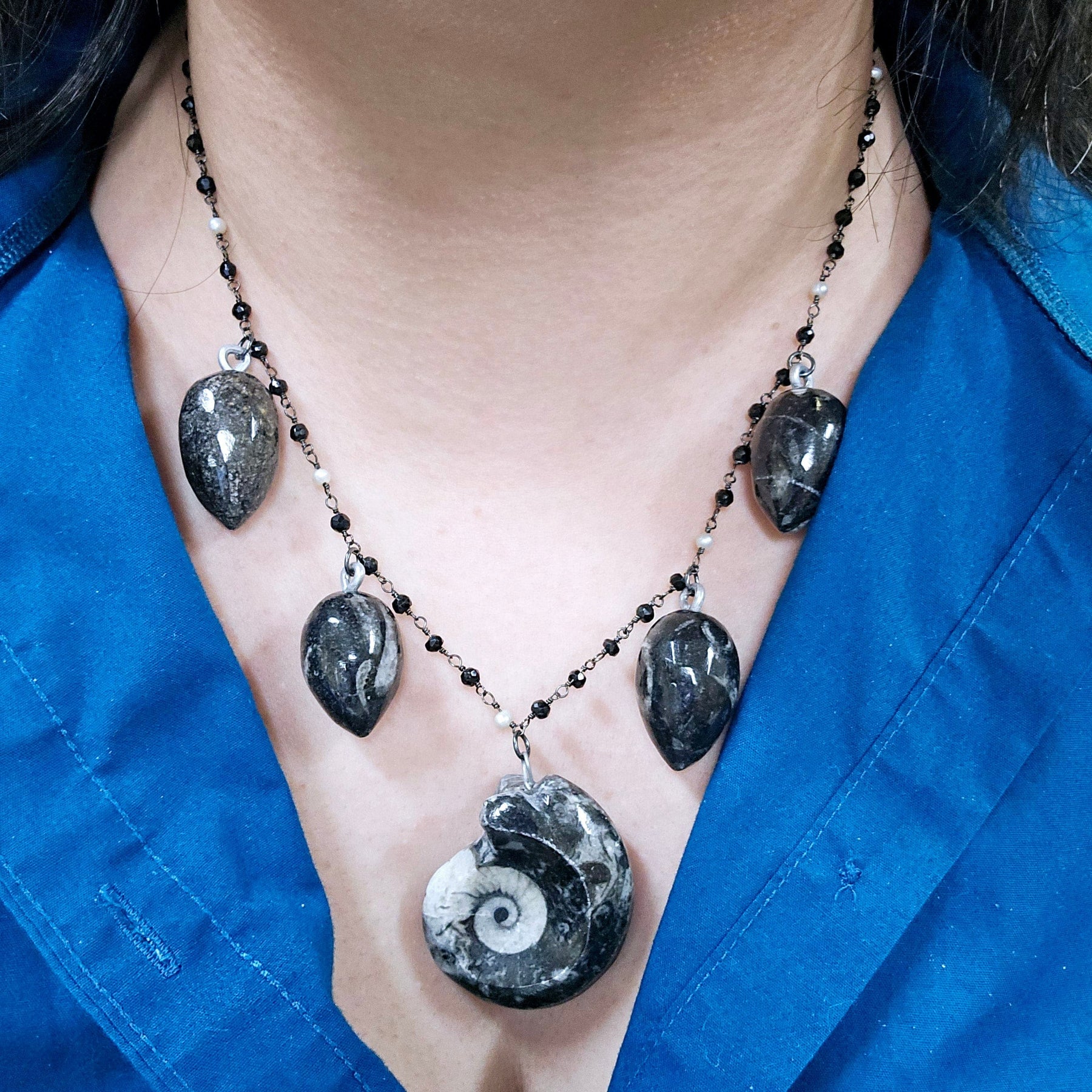 This listing is for ONE (1) Ammonite and Orthoceras Fossil Necklace with Black Spinel and Pearl Oxidized Sterling Silver Chain - Handmade. HE-SMOF-36