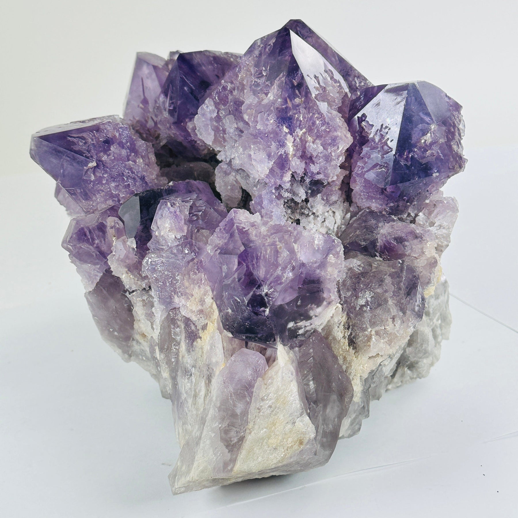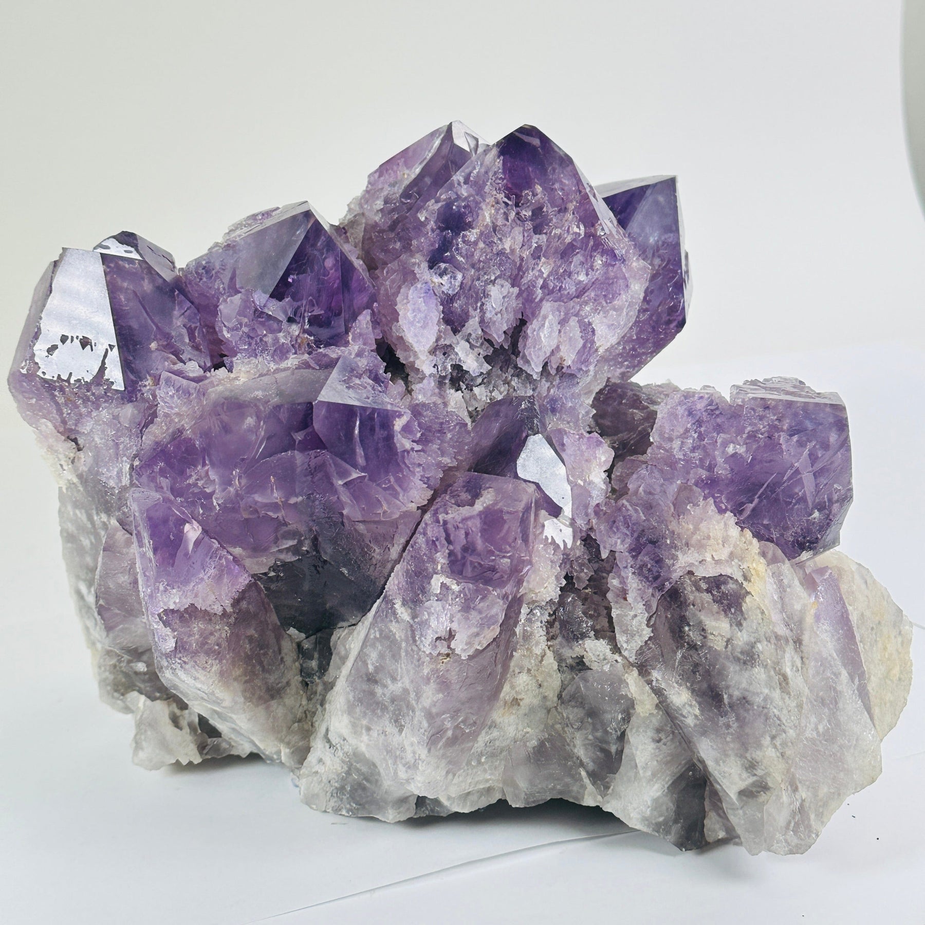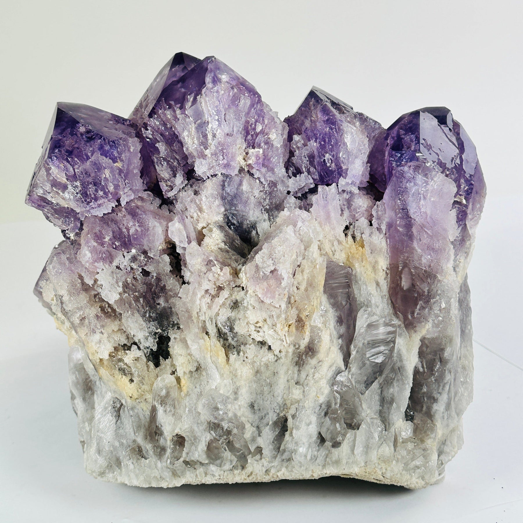 This grand elestial amethyst cluster makes the ultimate high-vibrational addition to an impressive crystal collection. It was mined in the Bahai region of Brazil, known for its spectacular high-quality amethyst.