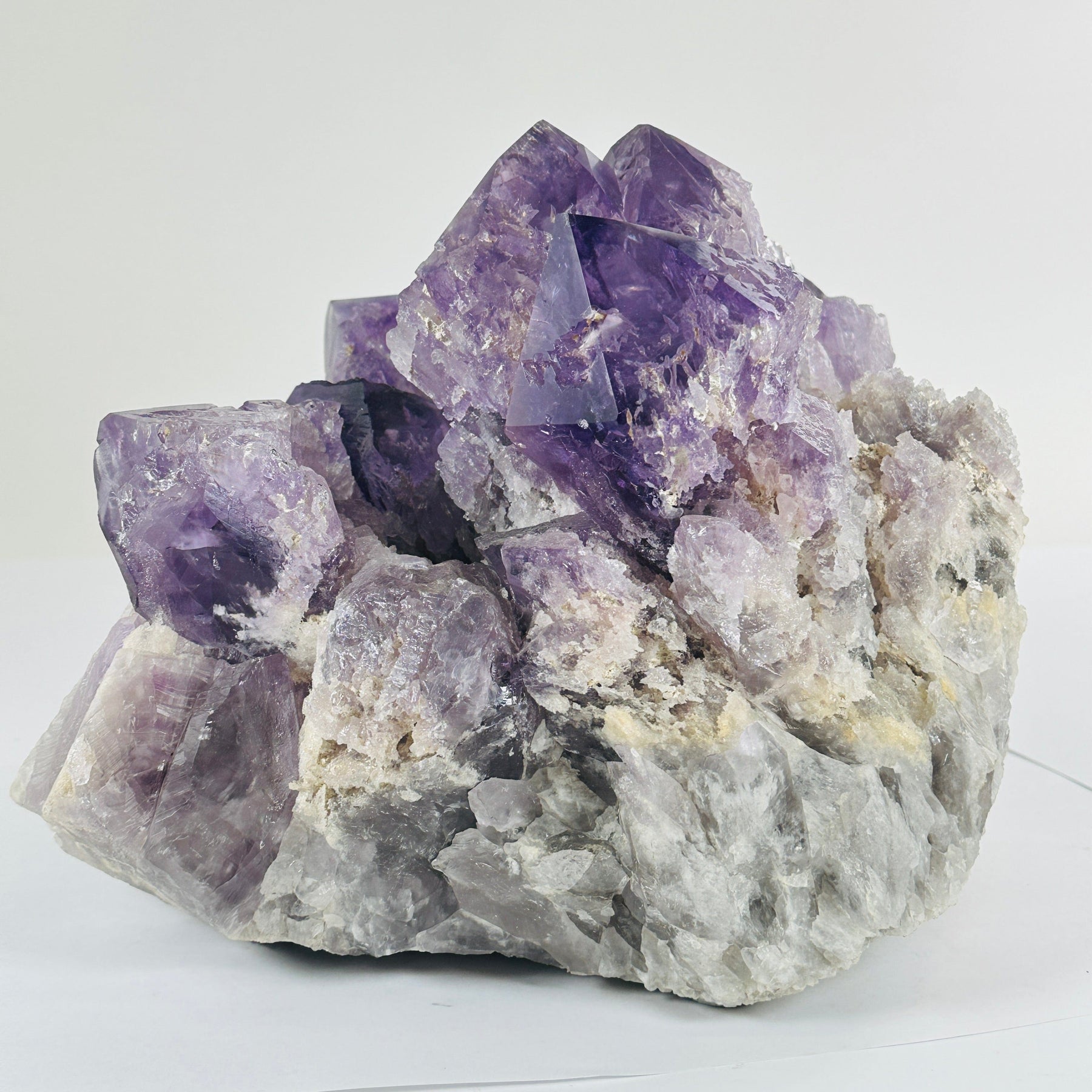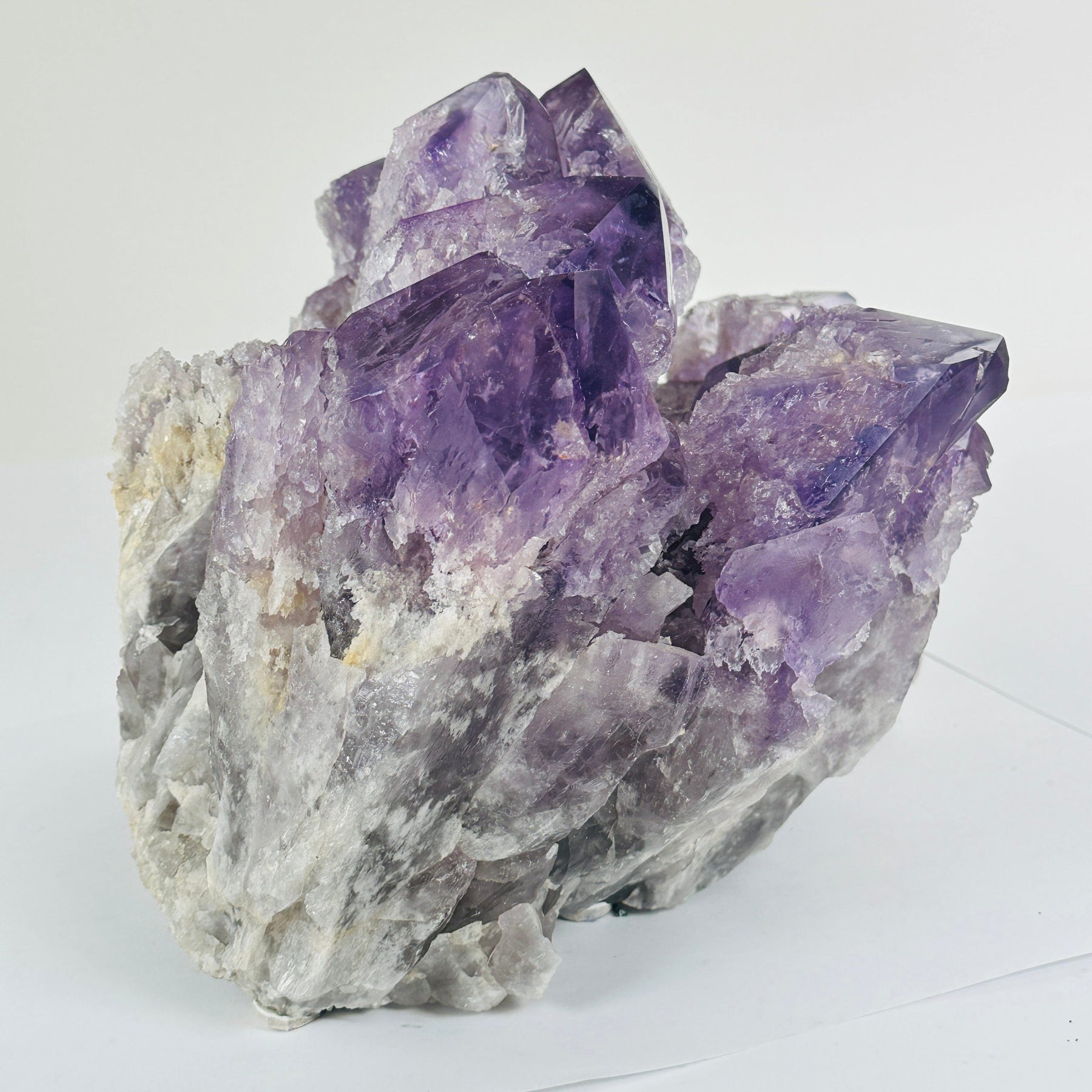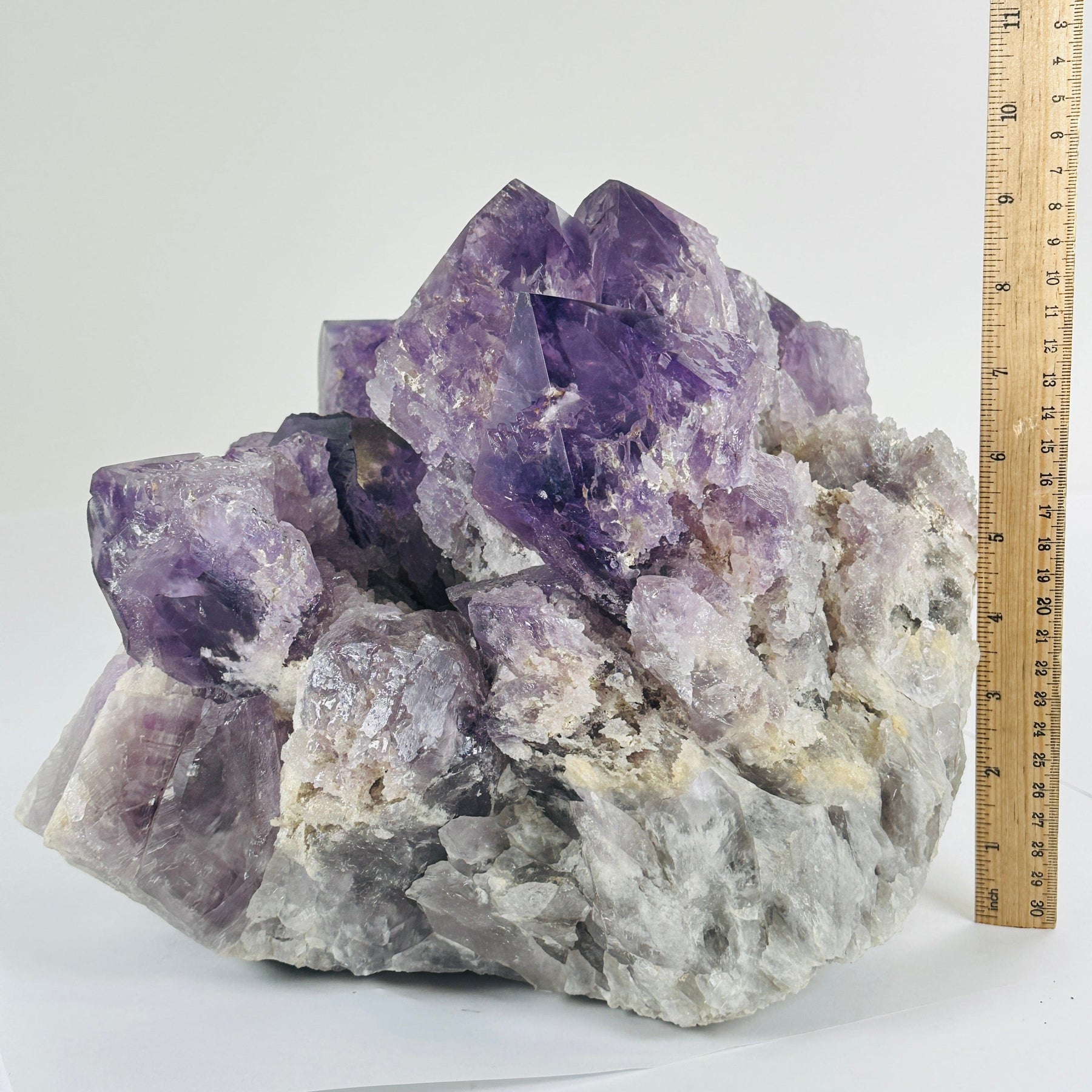 This grand elestial amethyst cluster makes the ultimate high-vibrational addition to an impressive crystal collection. It was mined in the Bahai region of Brazil, known for its spectacular high-quality amethyst.