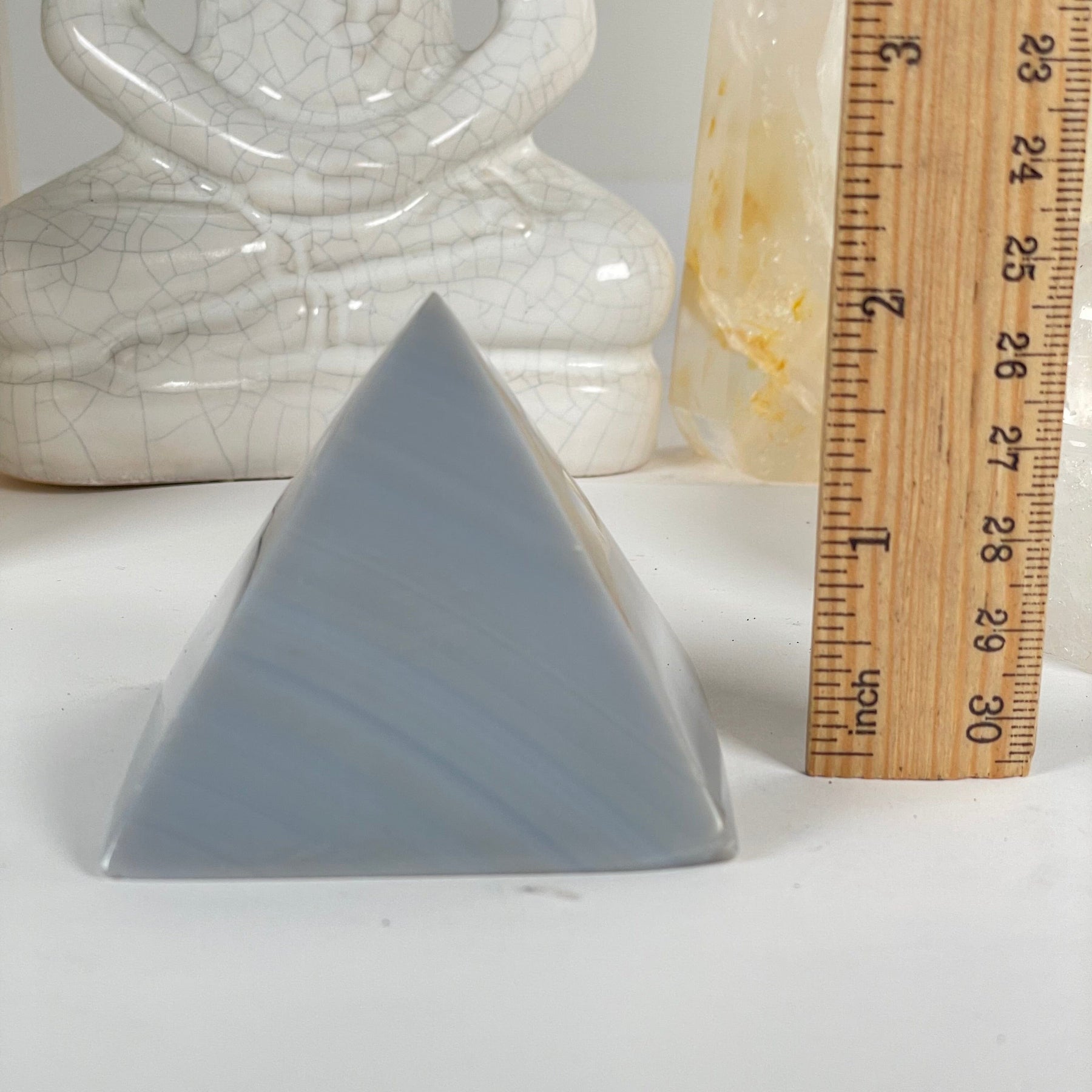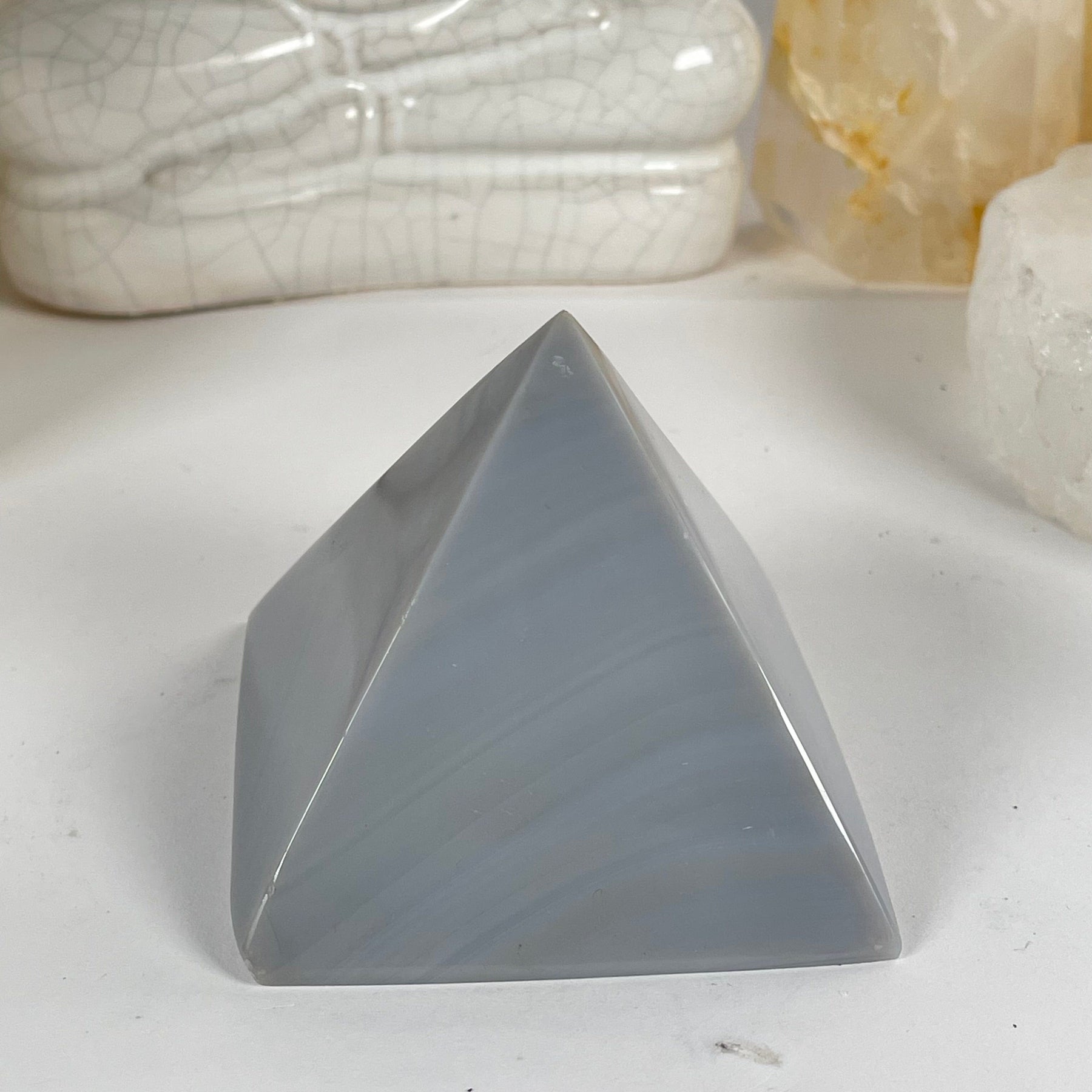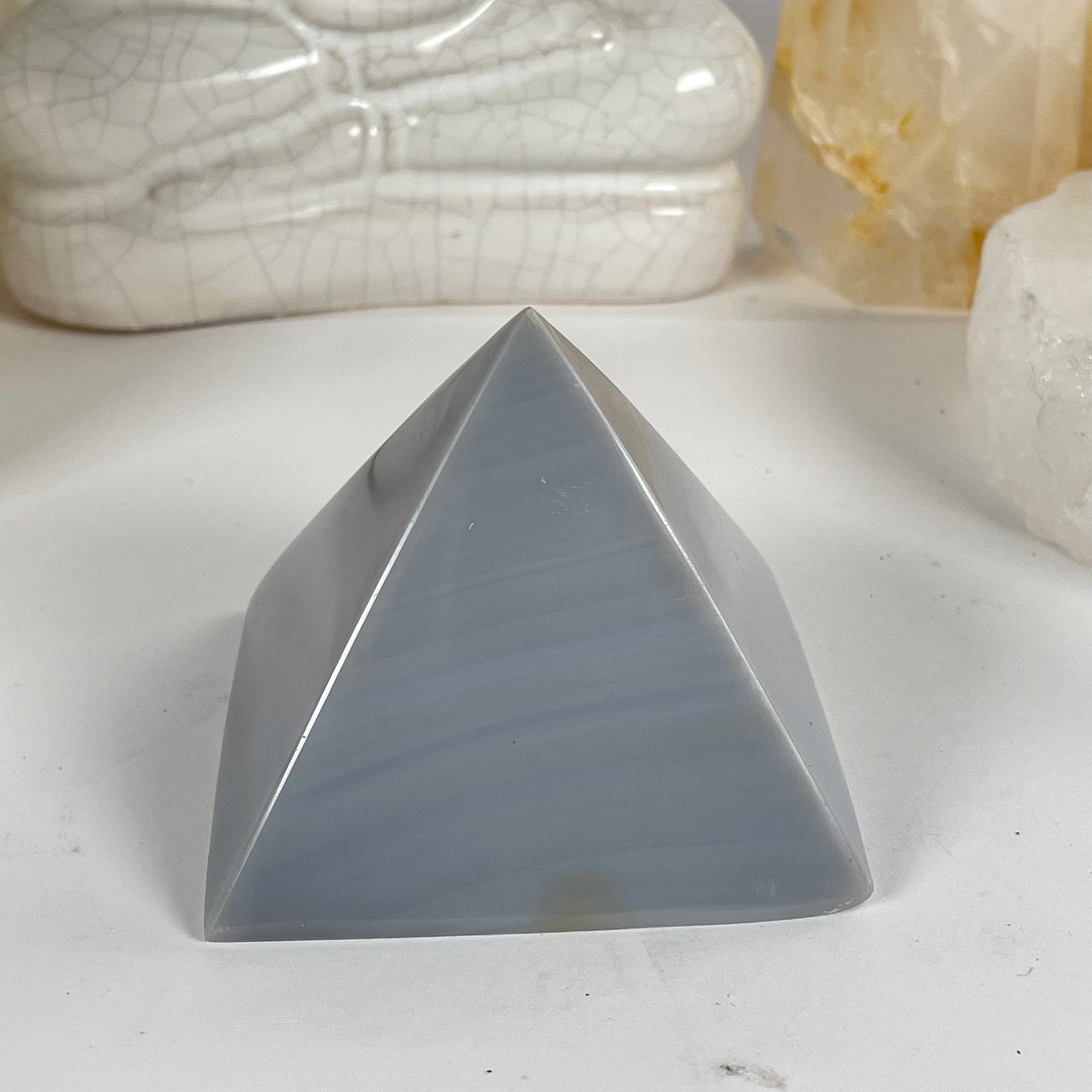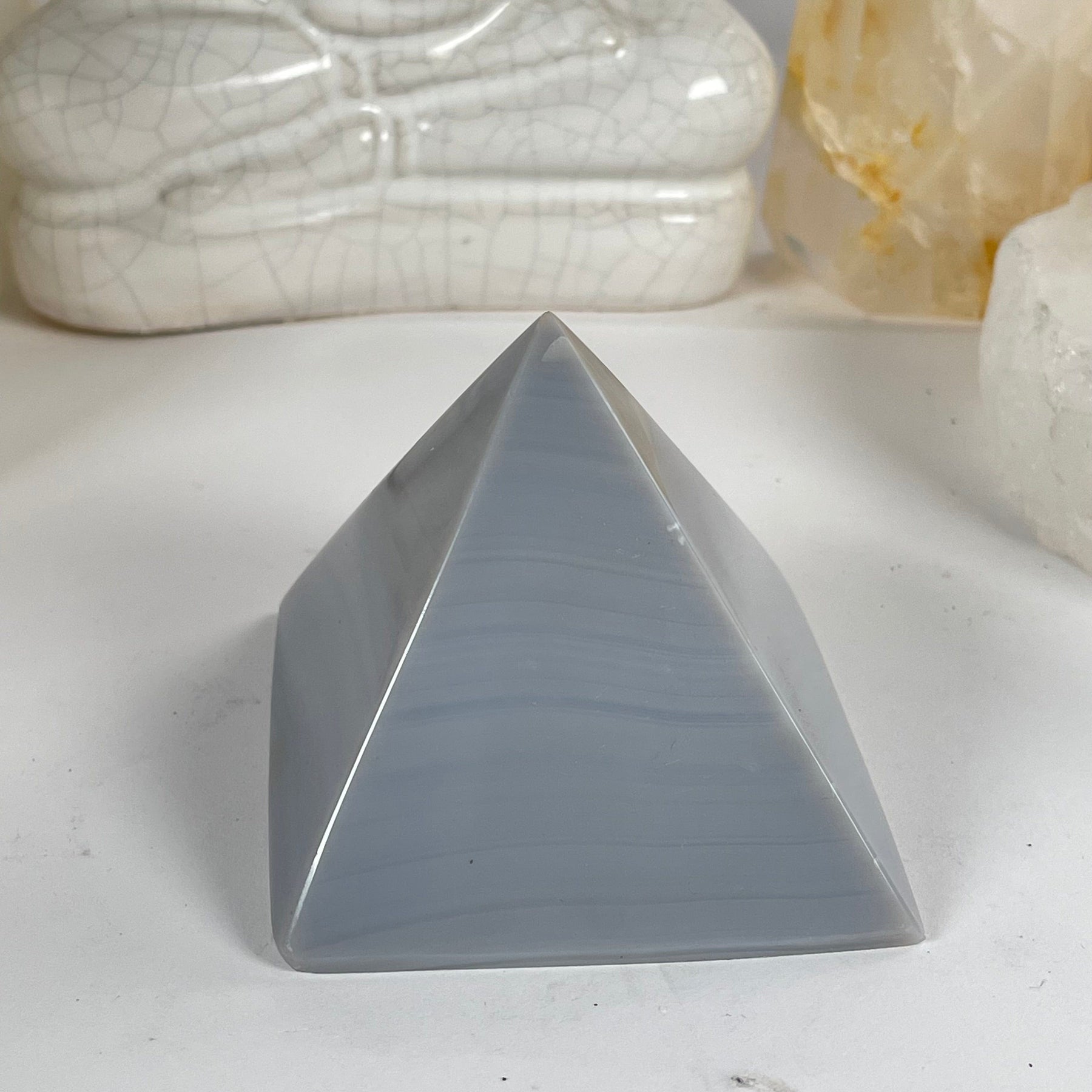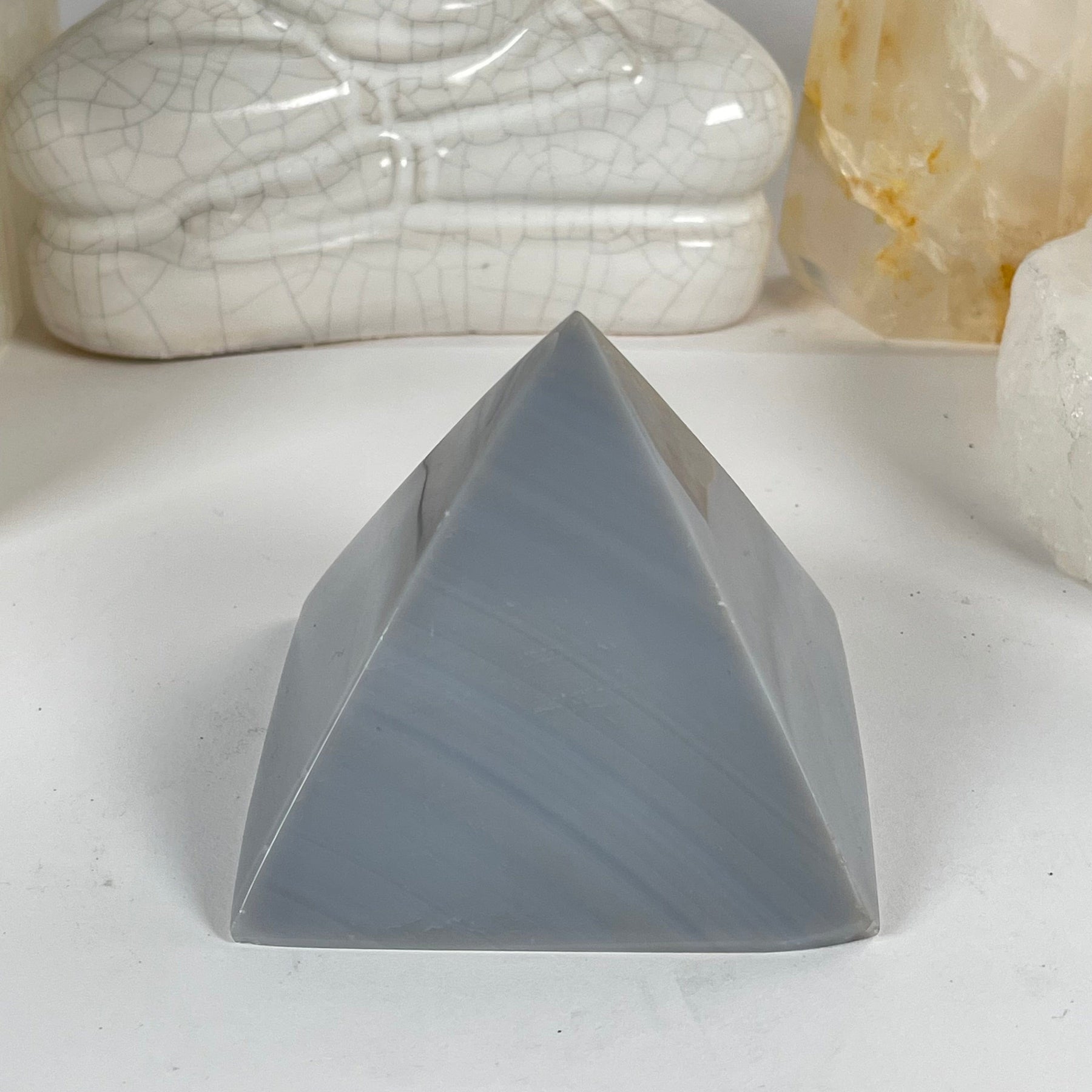 This beautiful blue agate has been carved into a faceted polished pyramid with a flat base for easy display and use.
