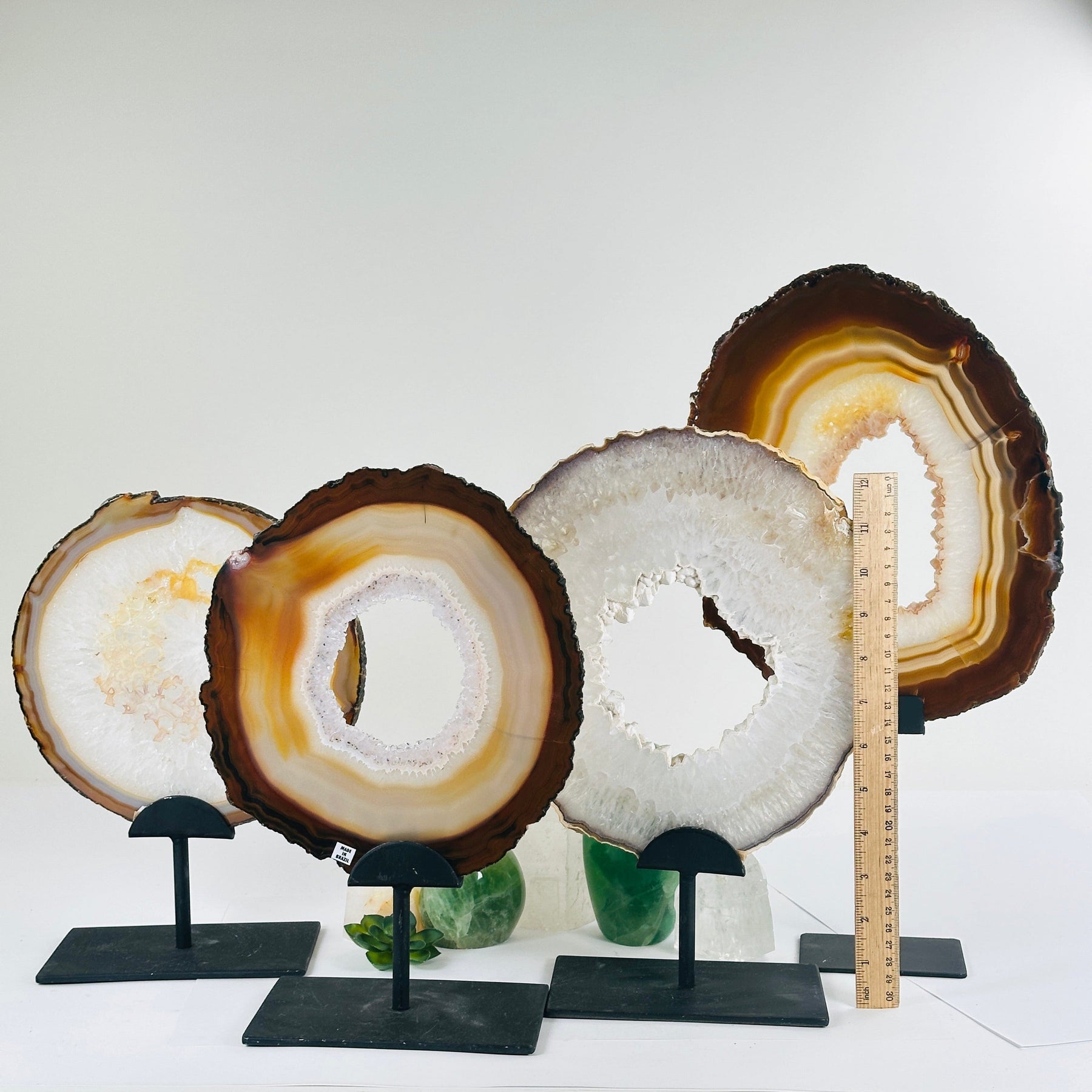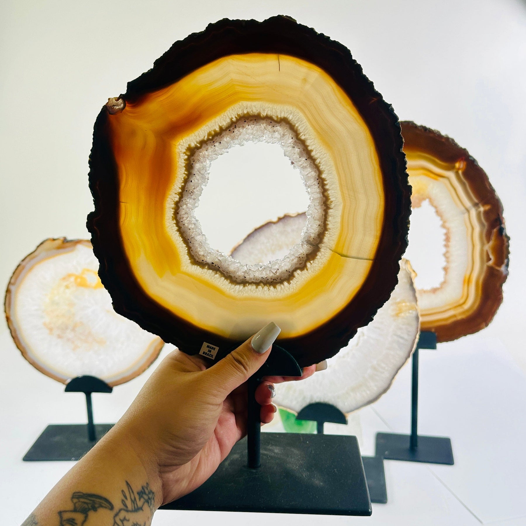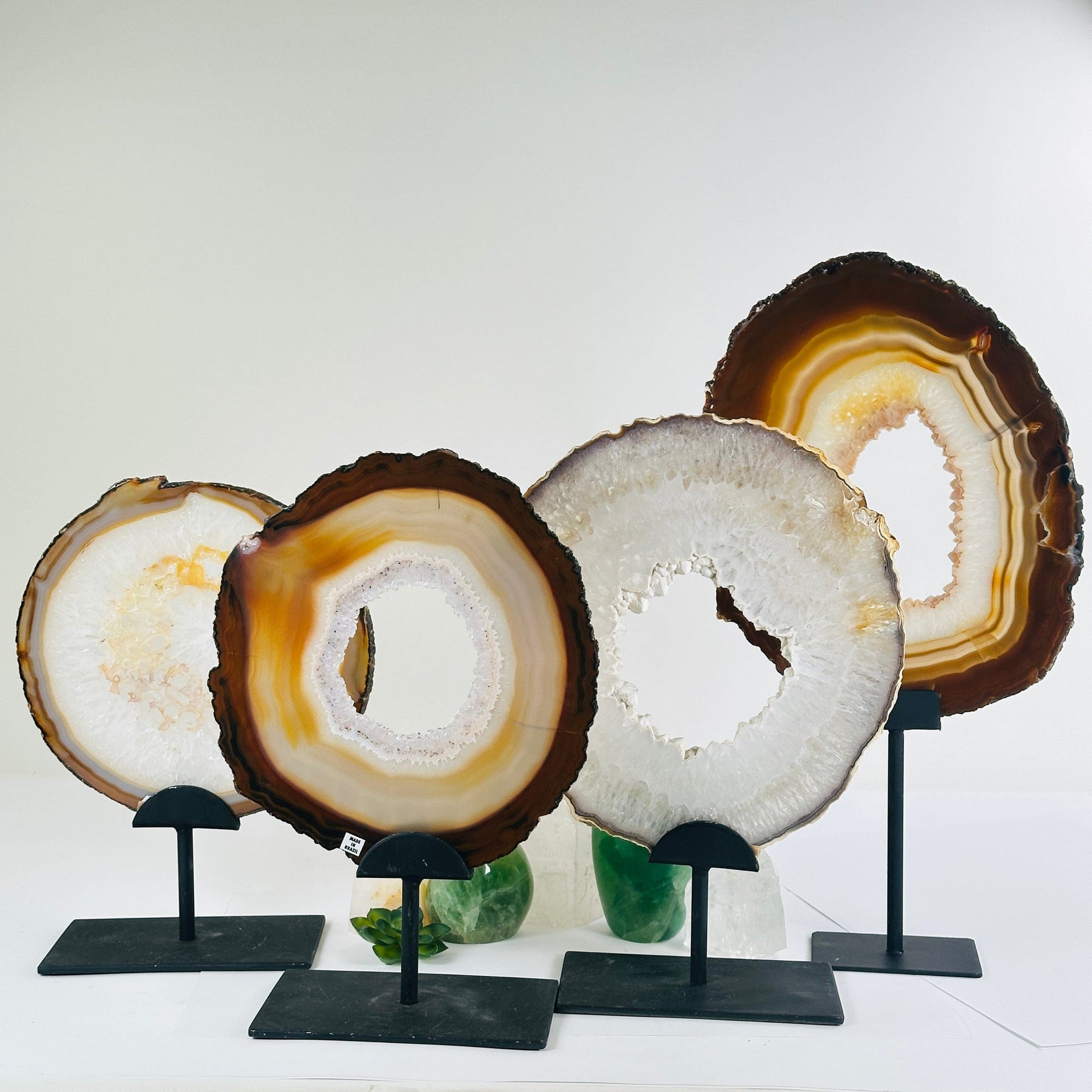 Natural agate slices display beautiful translucent crystals and have been placed on a metal stand.