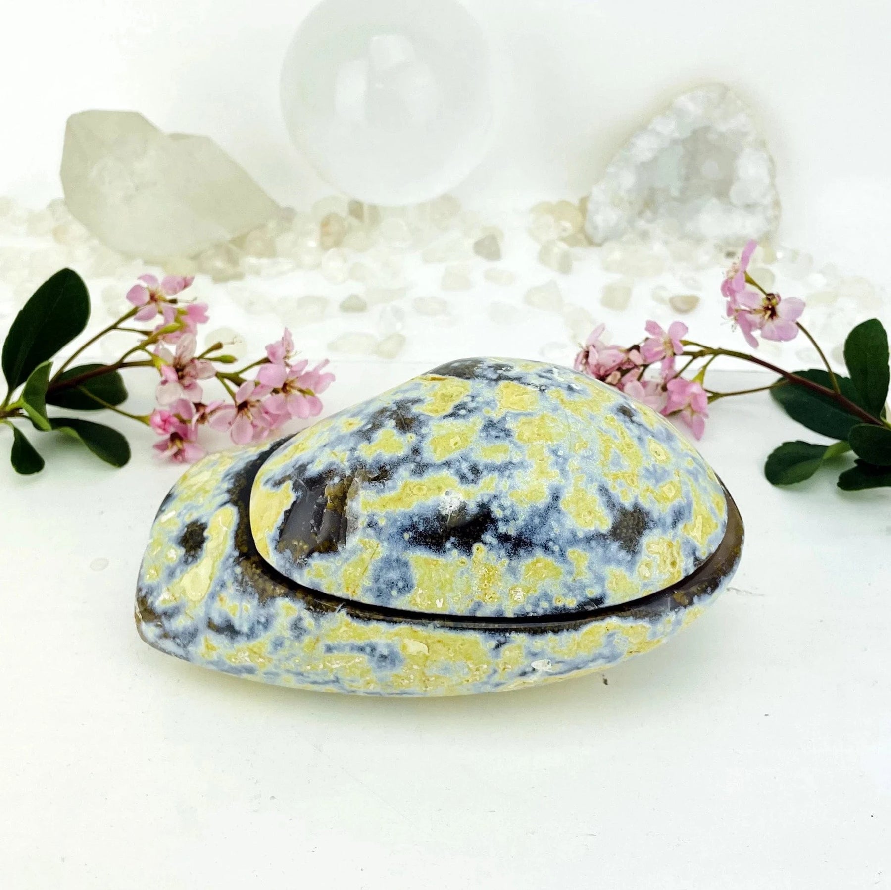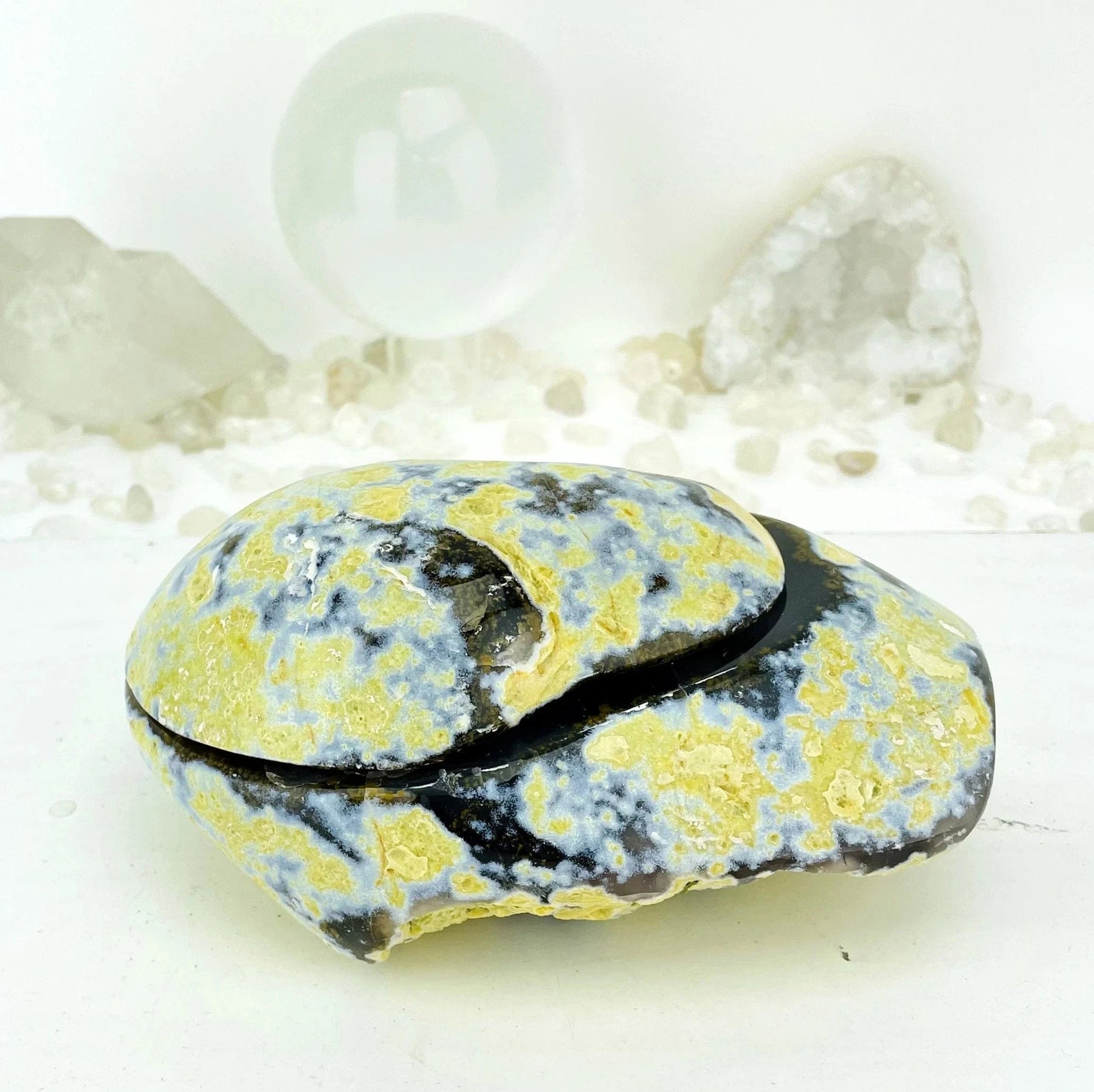 This Geode druzy box is natural and rough on the bottom while the rest of it is polished to a smooth finish. It has one cut line that makes the lid and allows you to see into the geode stone exposing its druzy shimmer within. Beautiful piece to display in your home or sacred space.