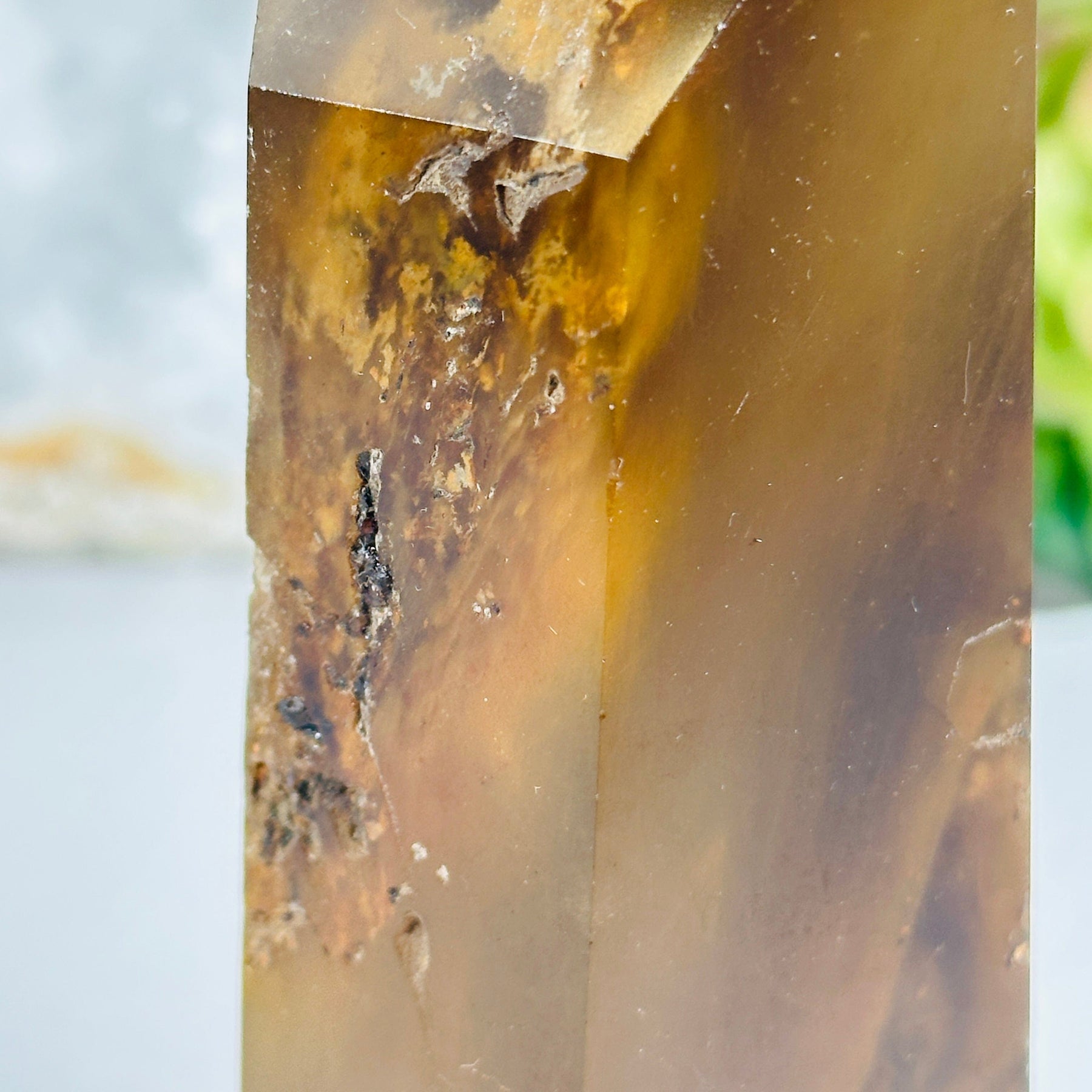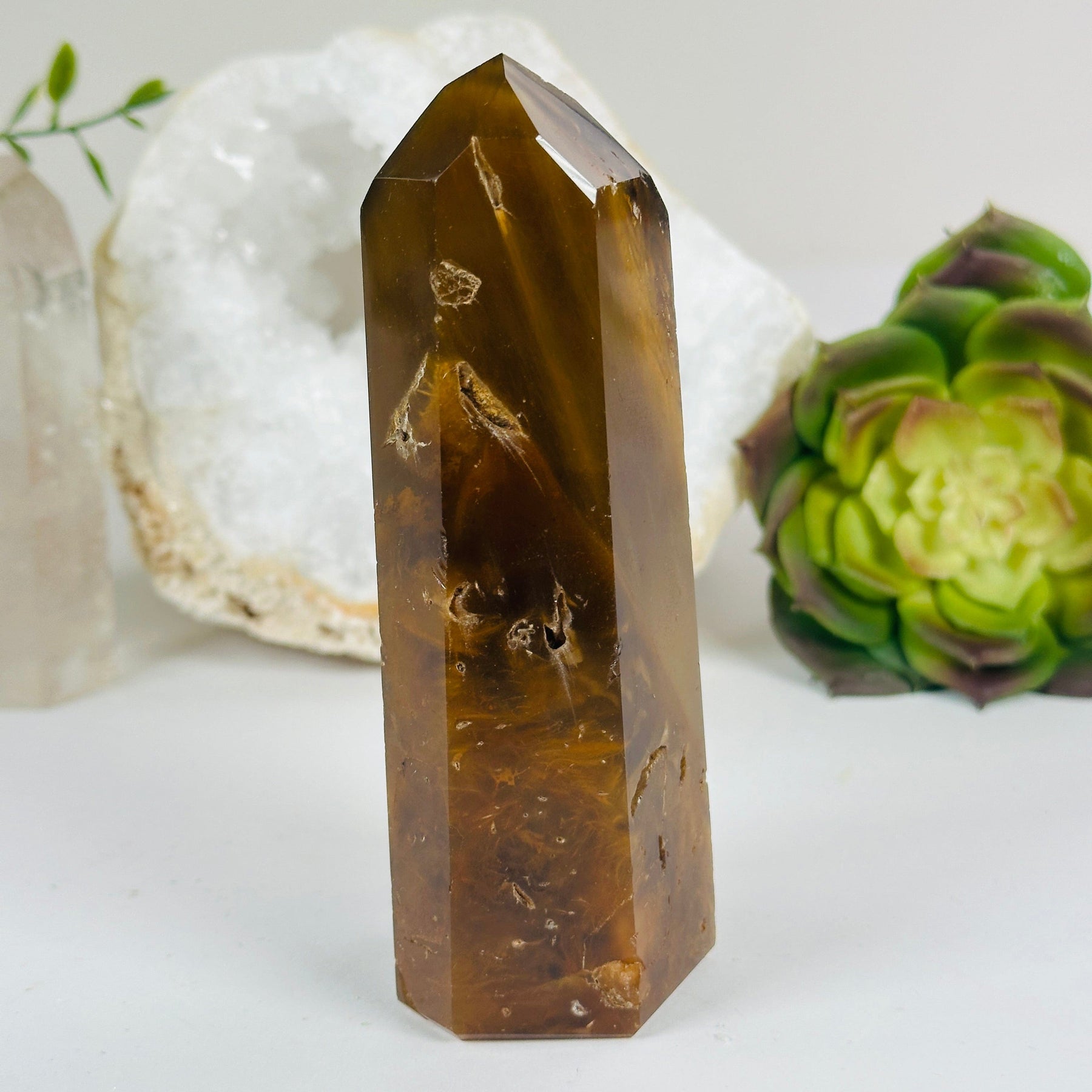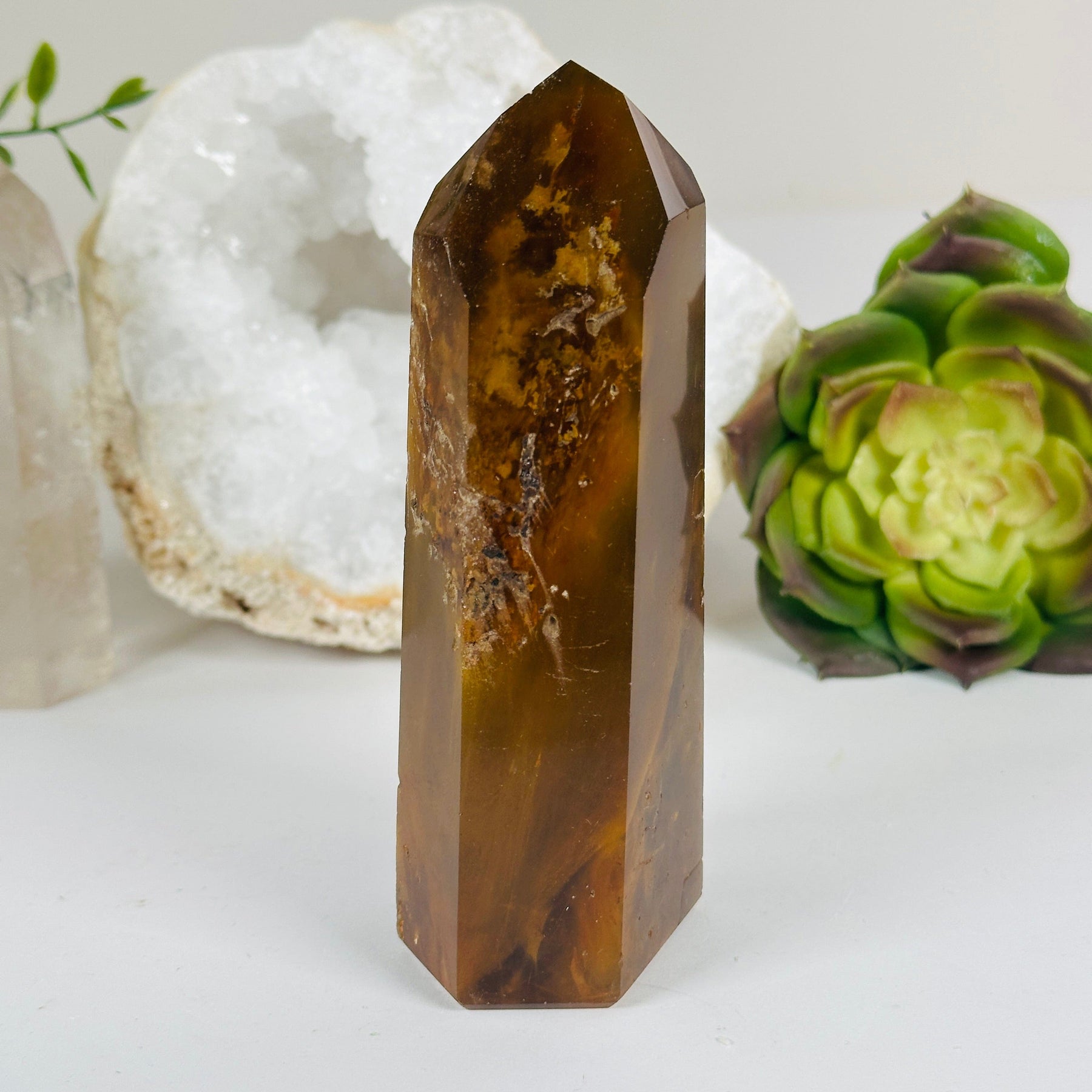 Amphibole Quartz Polished Crystal Point - One-of-a-Kind front view with props and plants in the background
