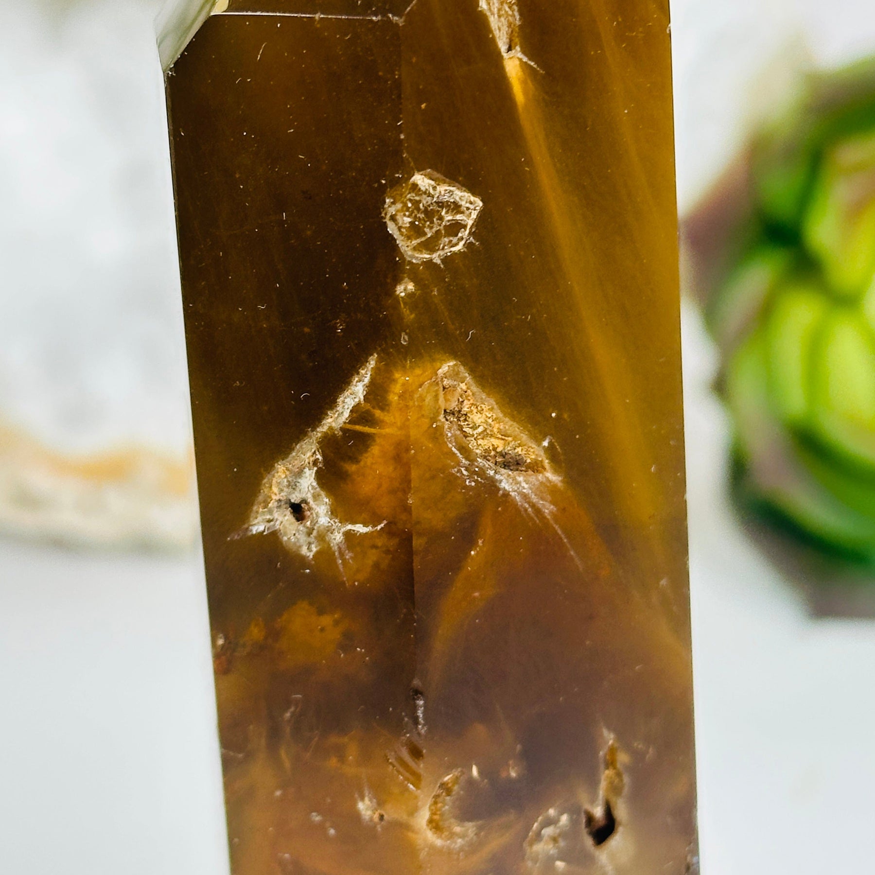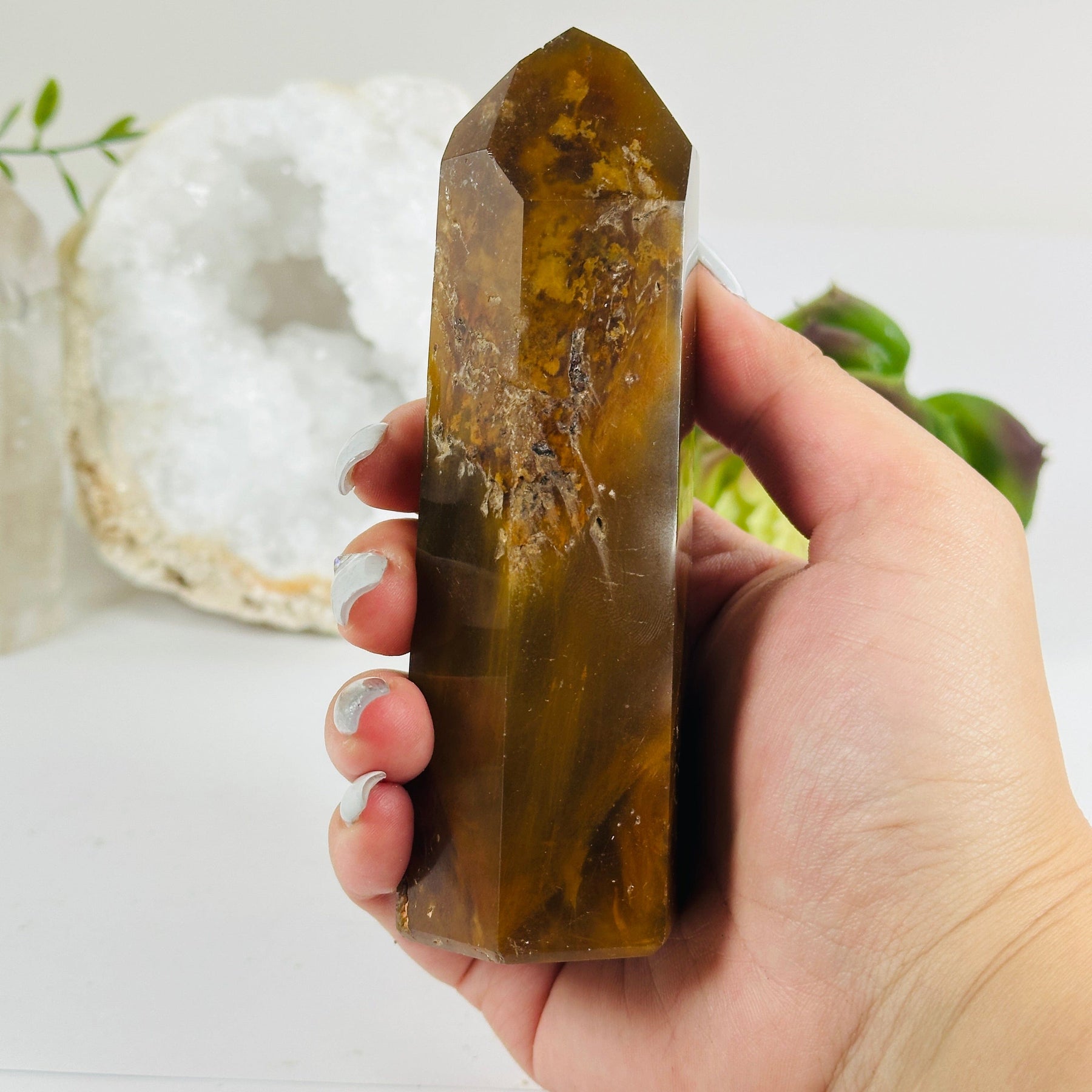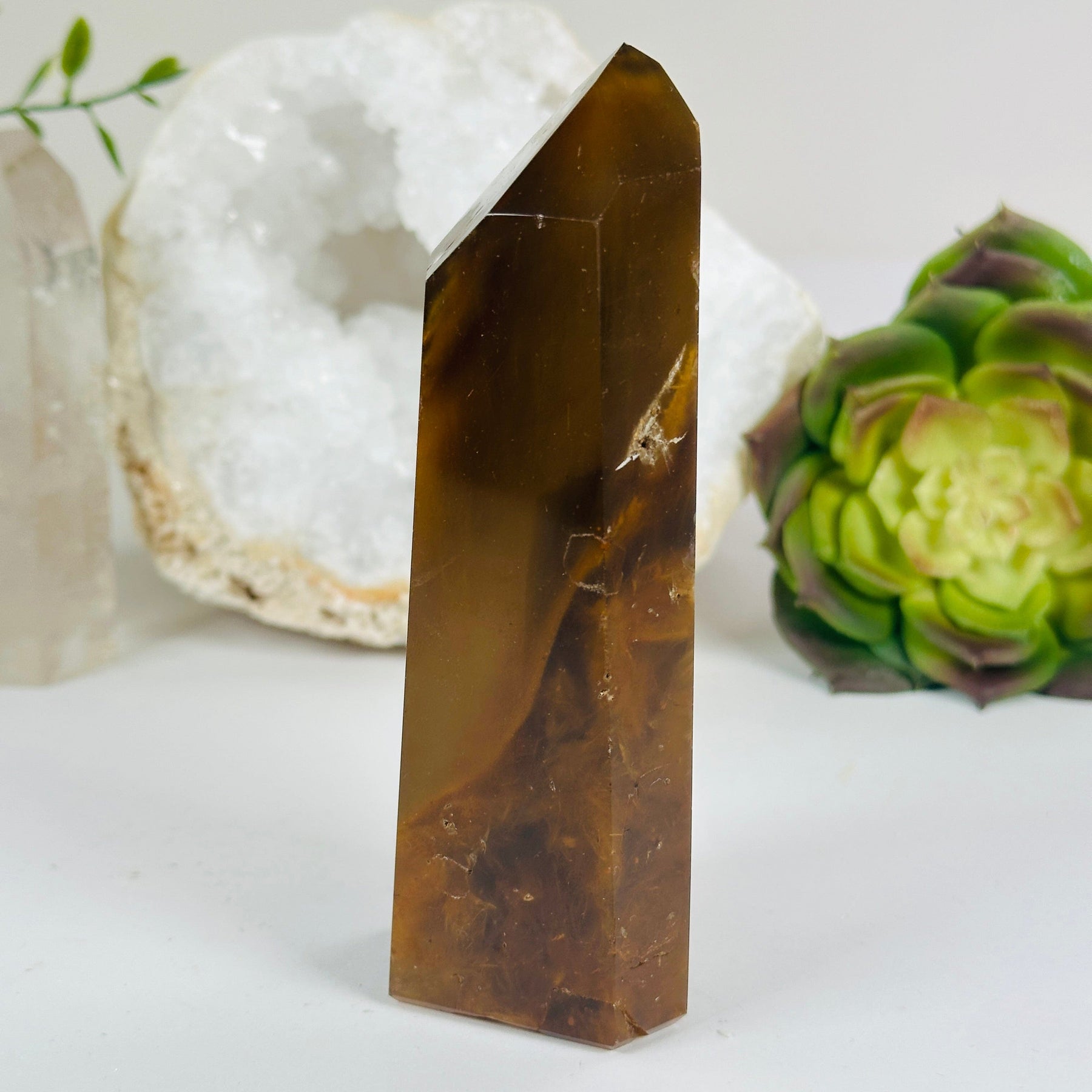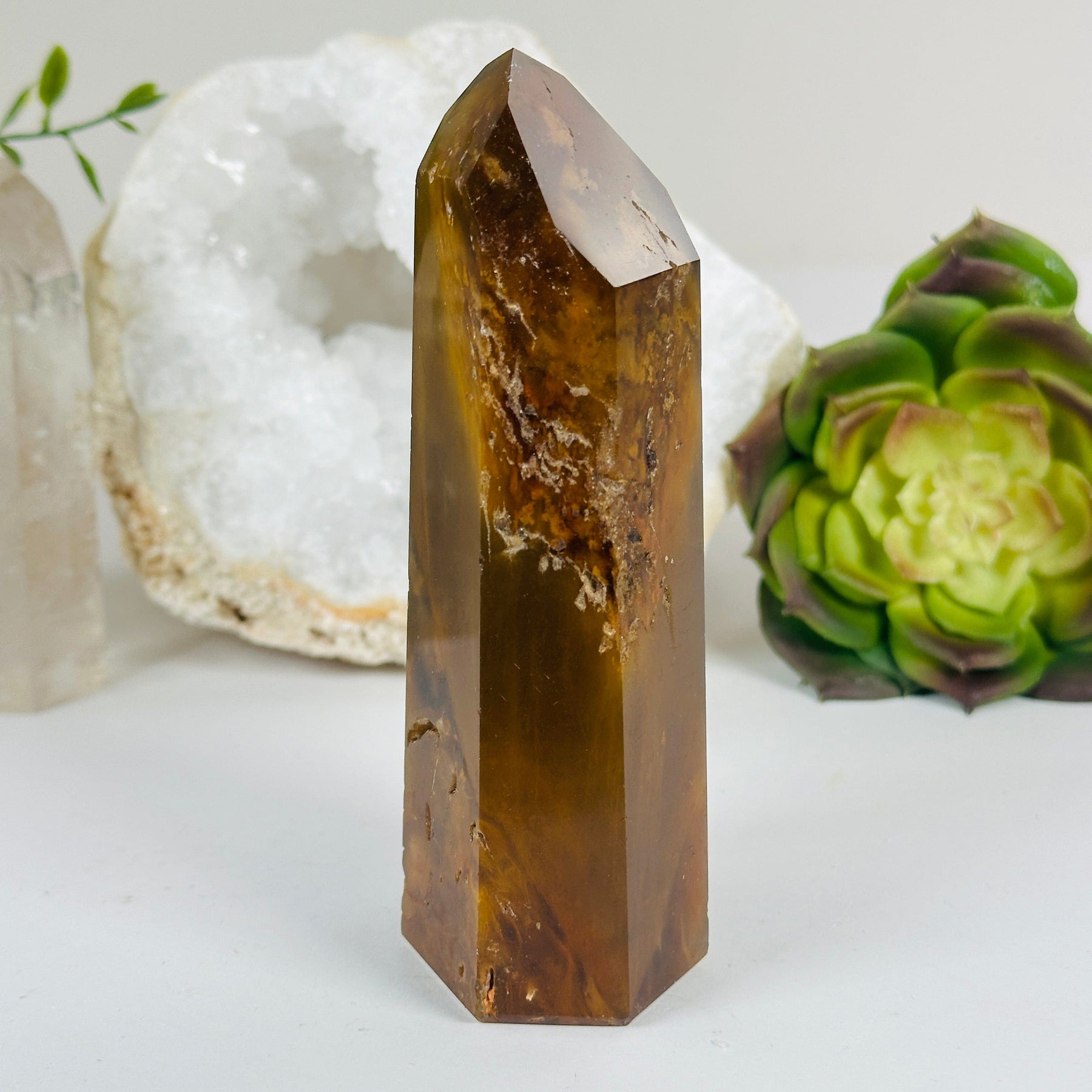 Amphibole Quartz Polished Crystal Point - One-of-a-Kind front view with props and plants in the background