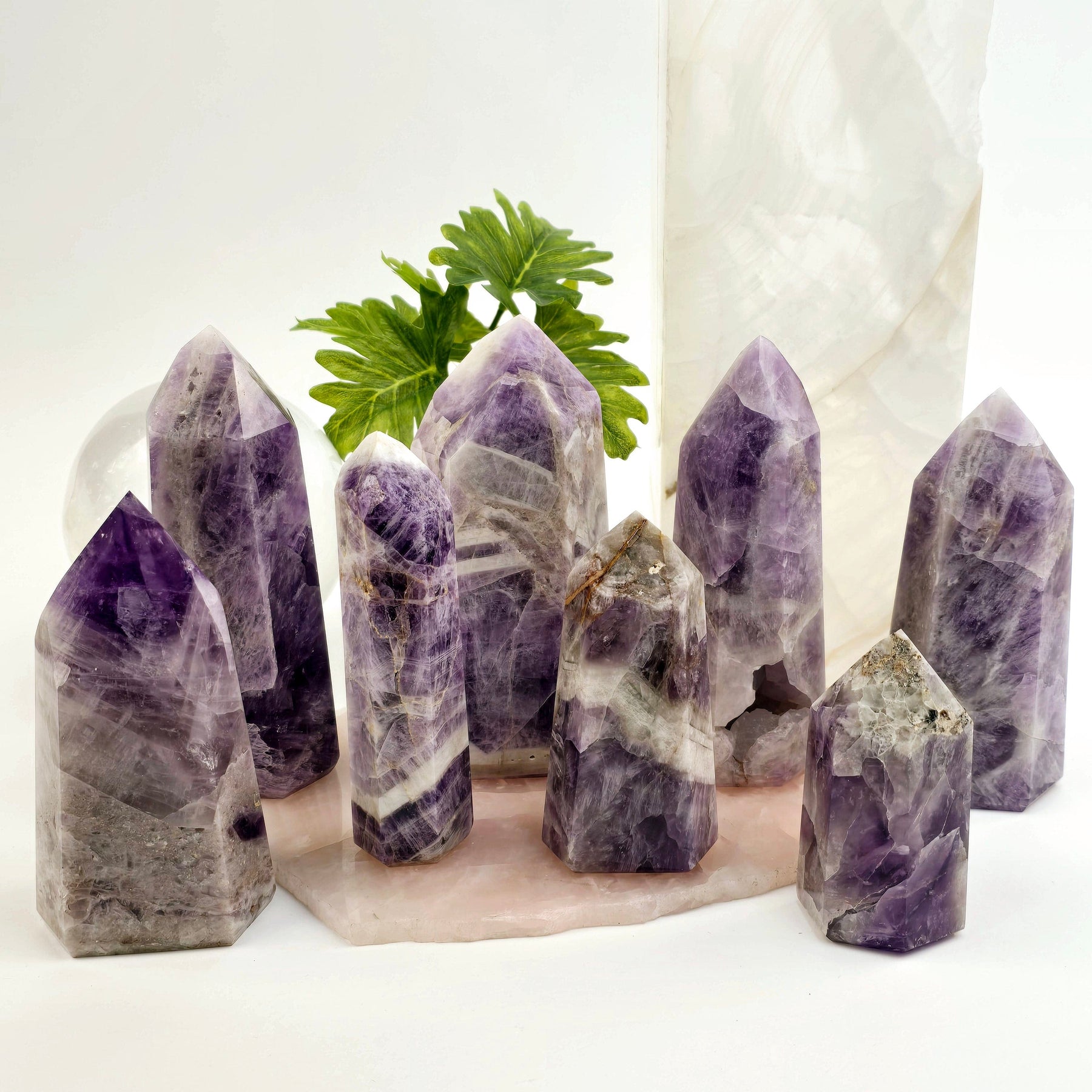 These amethyst crystal points are a beautiful shade of purple and white. All are chevron amethyst and one has a geode. The crystal can help bring positive energy into any room while also being a beautiful decoration.