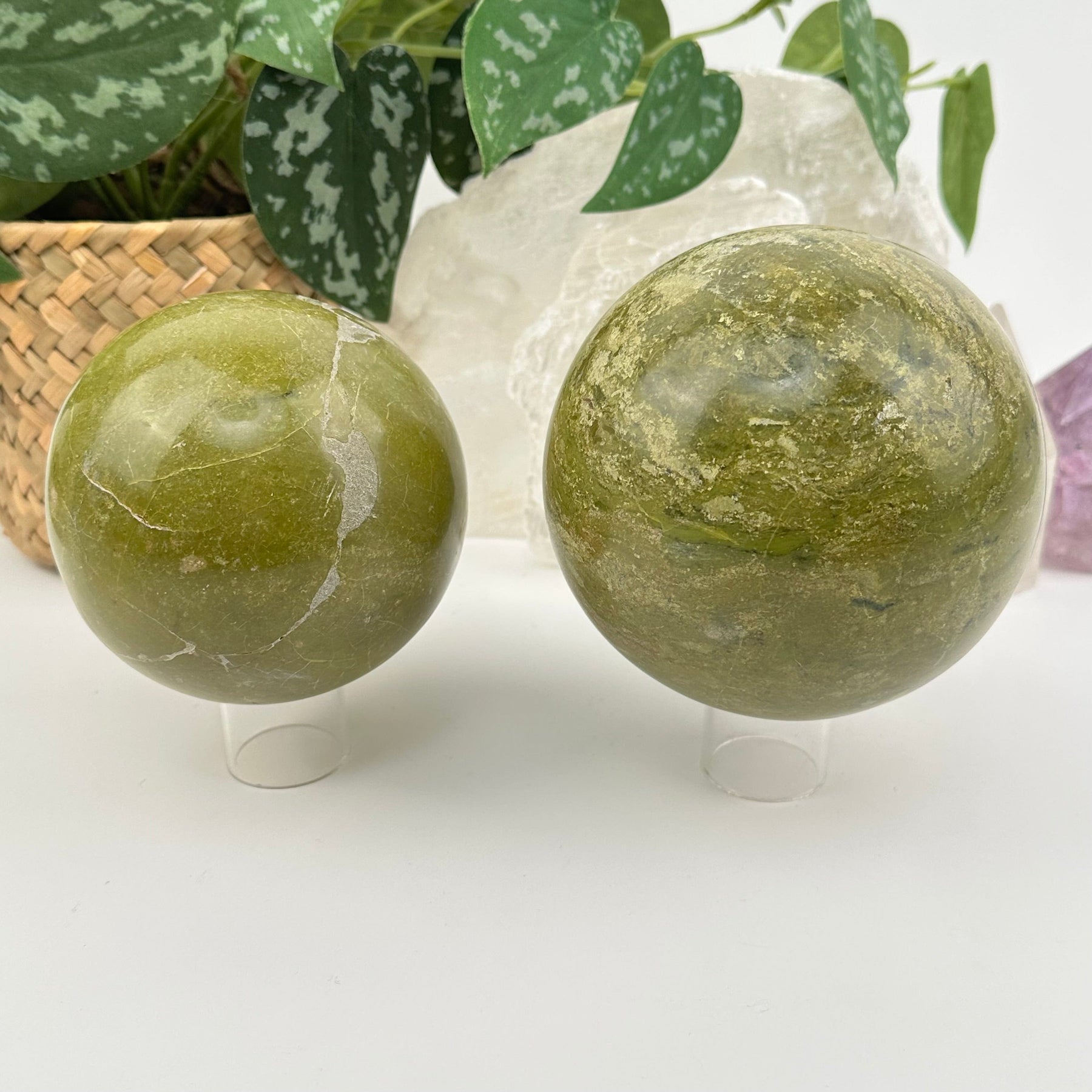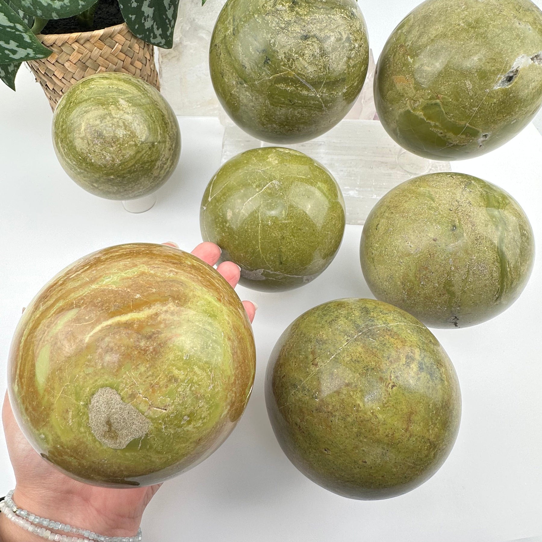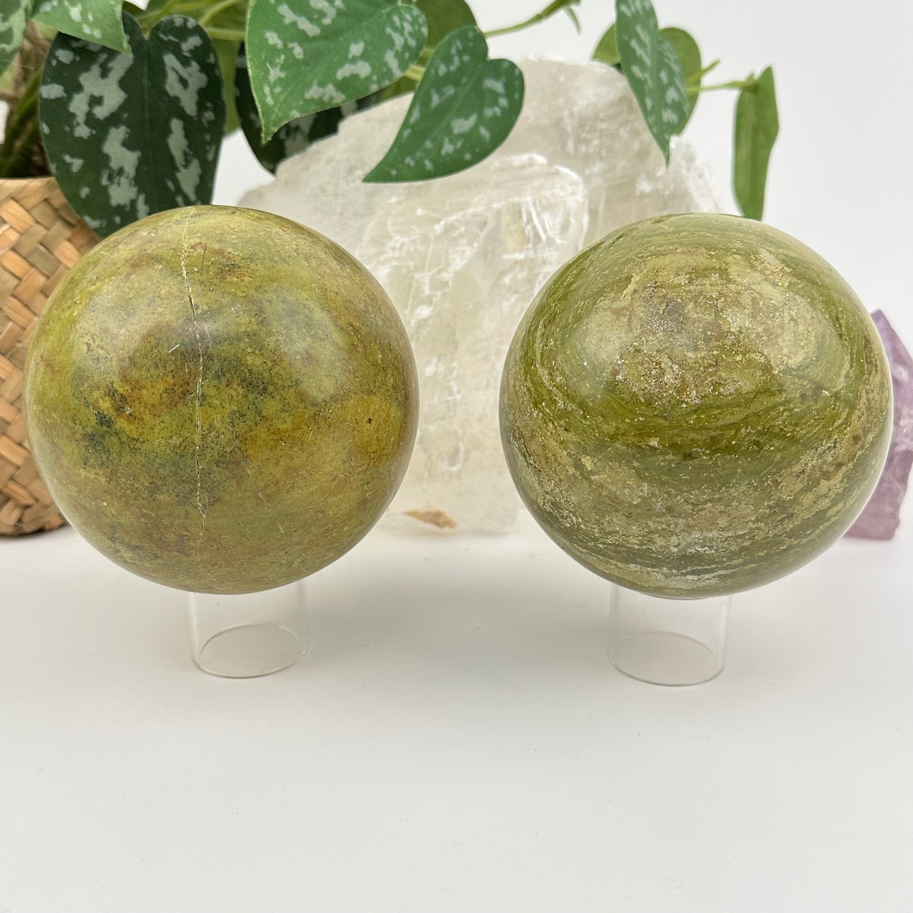 These Green Opal spheres feature soft green tones and a smooth polished finish that make them beautiful for décor, meditation, or everyday calm. Green Opal is known for its gentle, heart-soothing energy and uplifting feel.