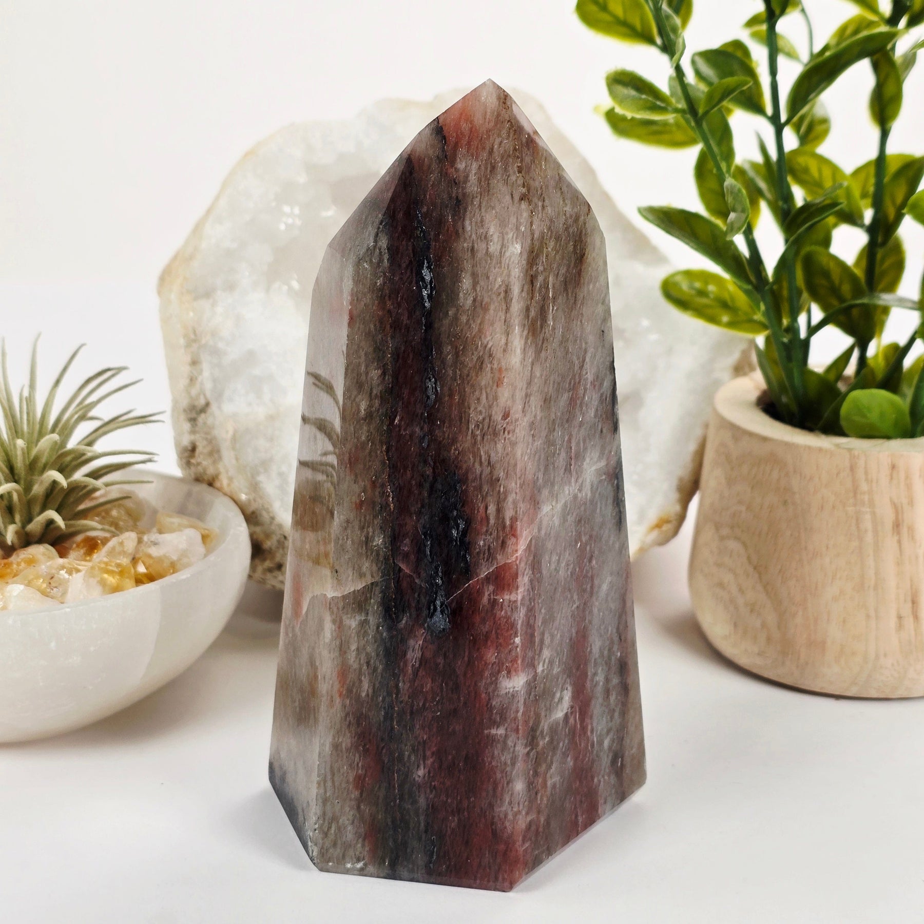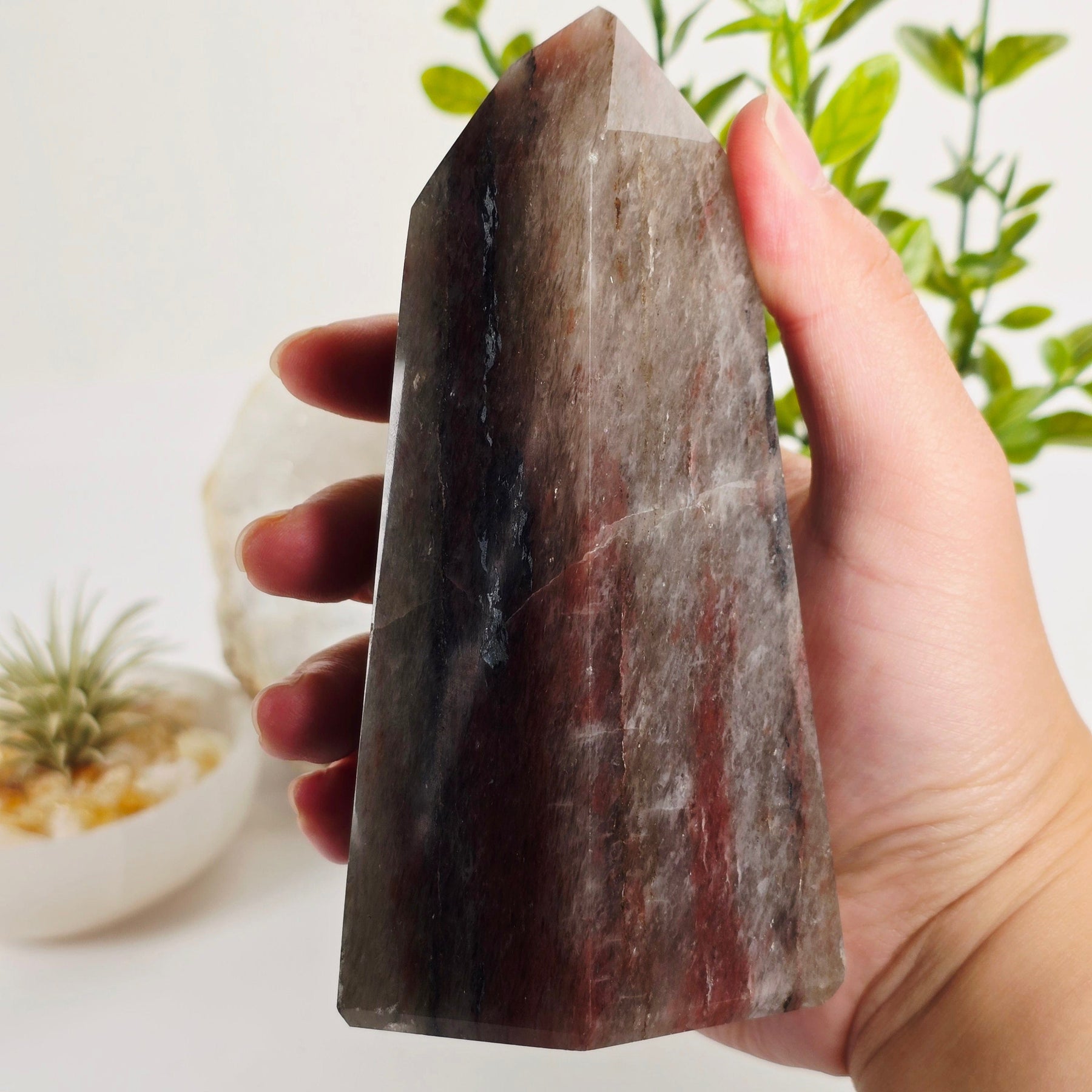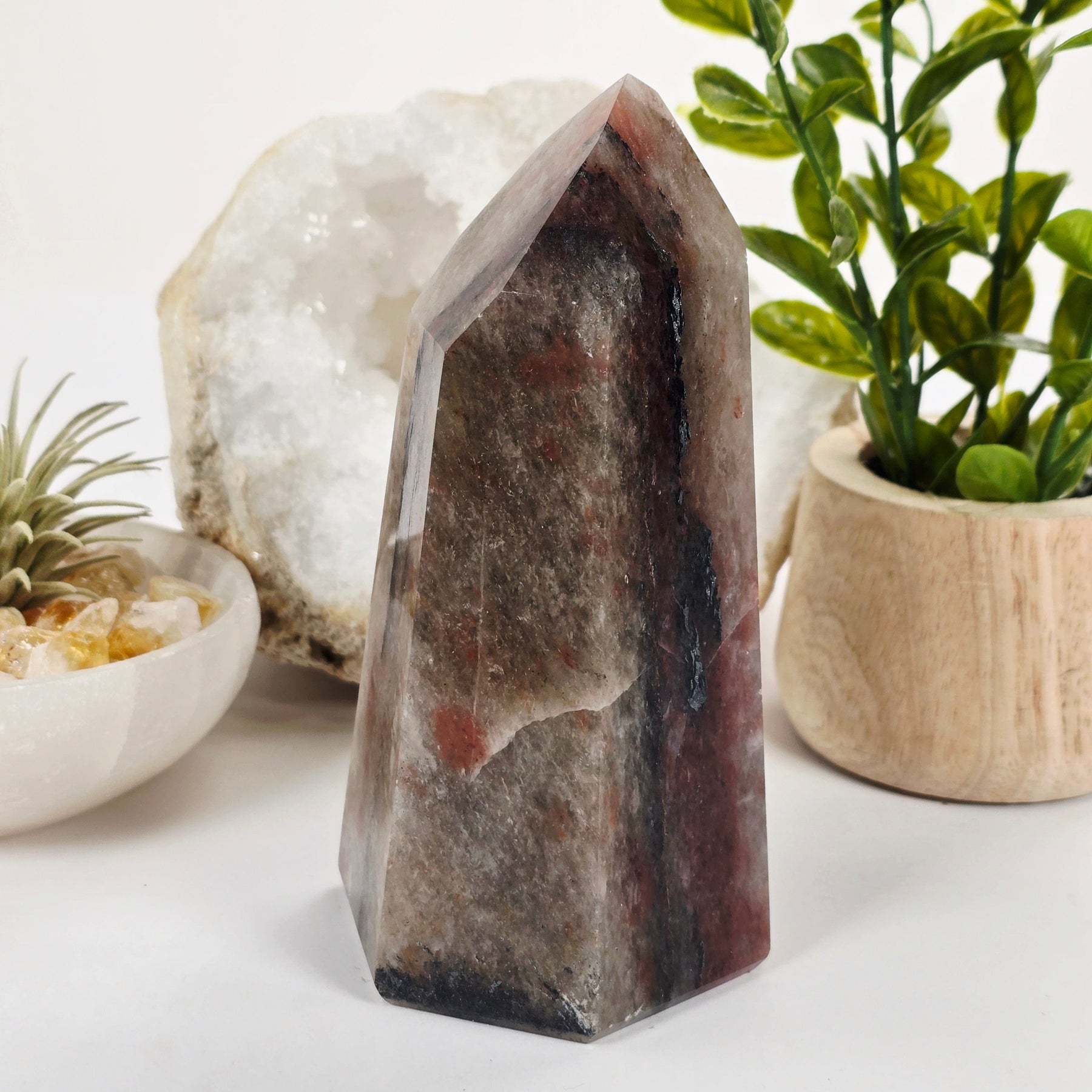 This Hematoid Quartz Polished Crystal Point features a captivating blend of deep red and brown hues.
