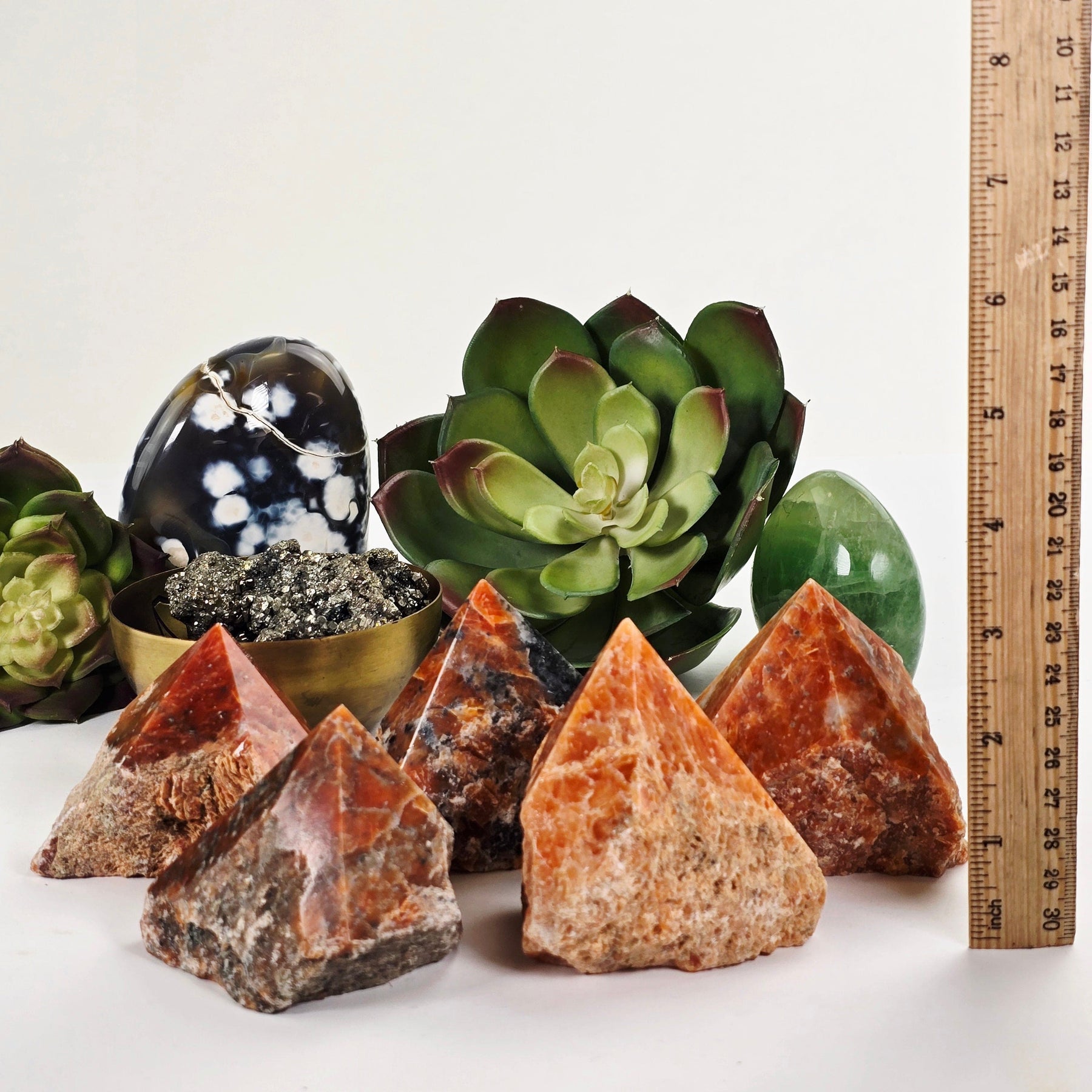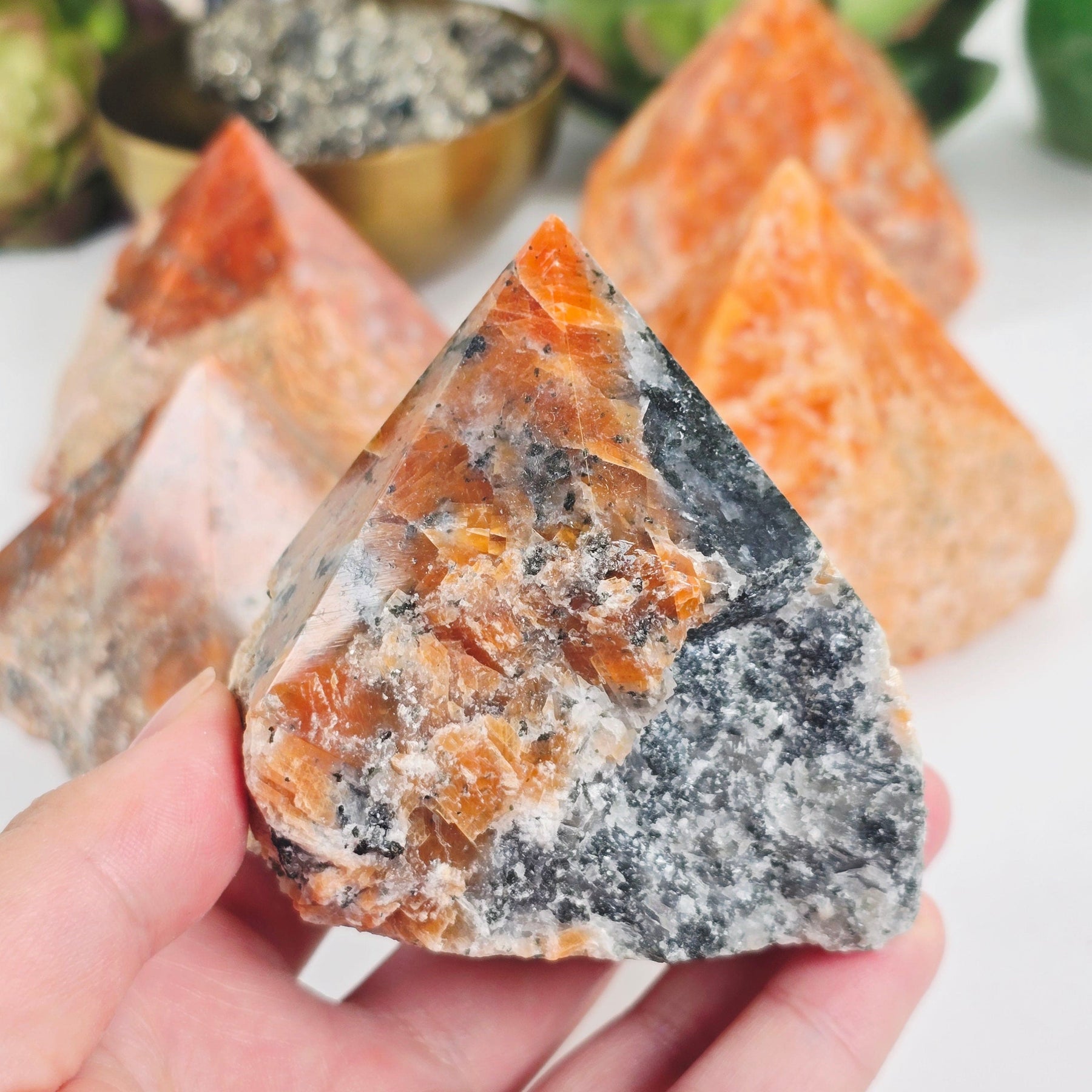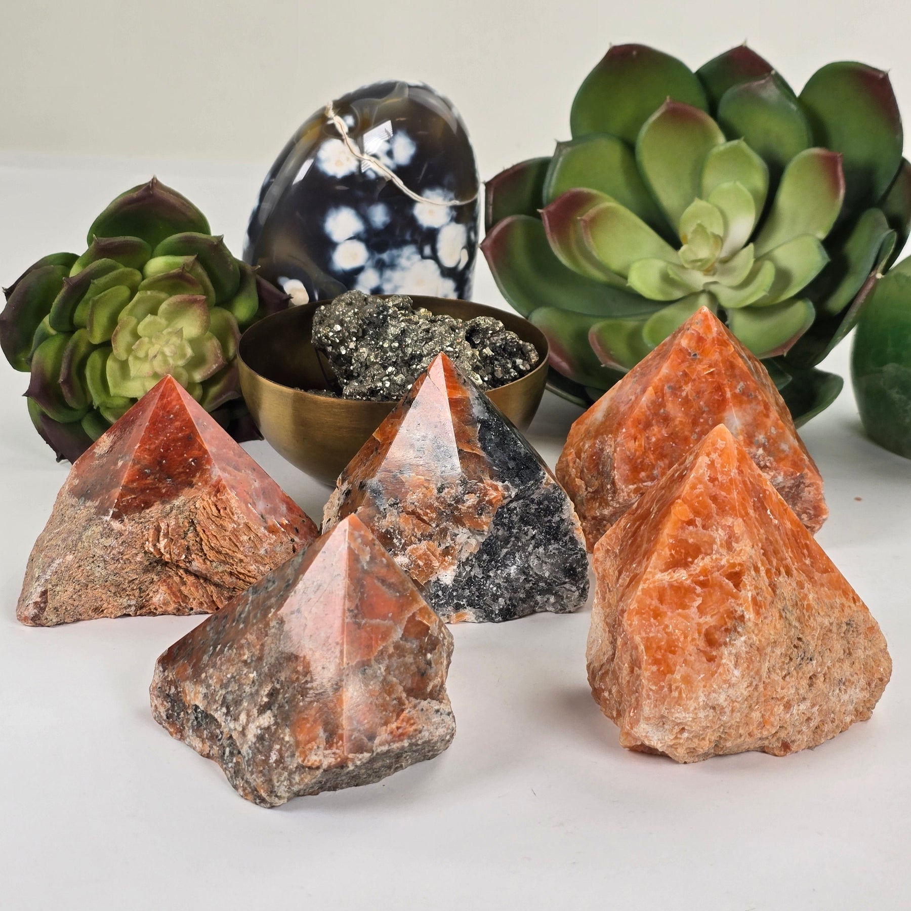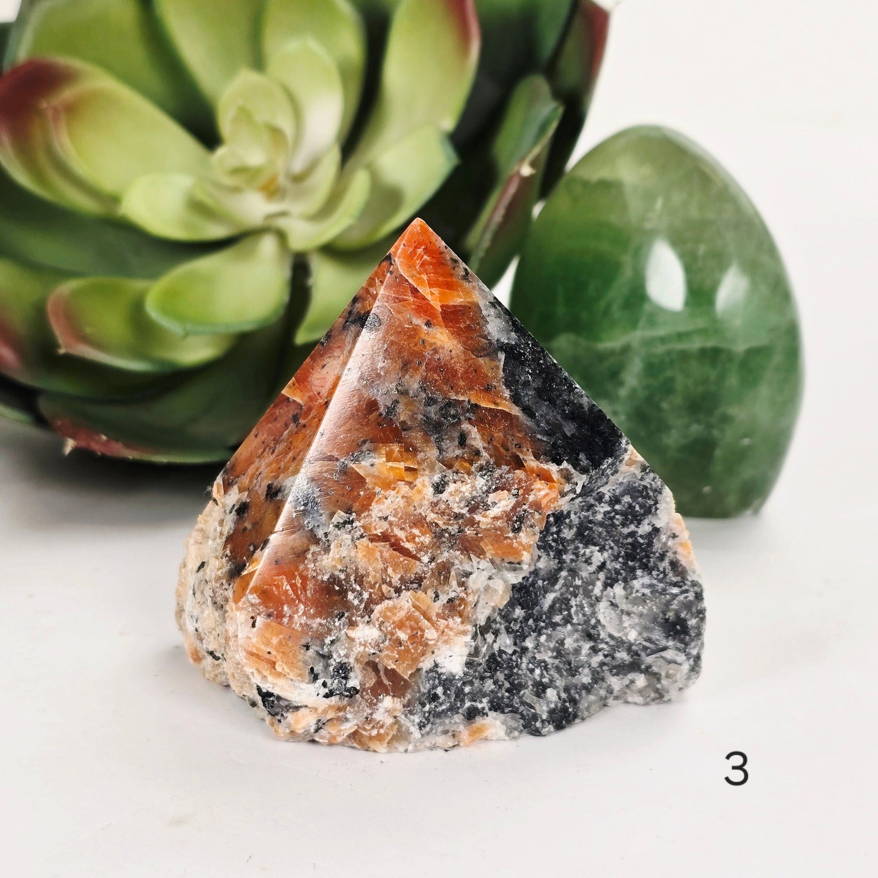 These orchid calcite semi polished points feature deep red-orange colors with brown veins and white inclusions. They have polished points with rough sides and flat base for ease of display. Use as a beautiful addition to any interior with a warm color scheme or for a pop of orange color.