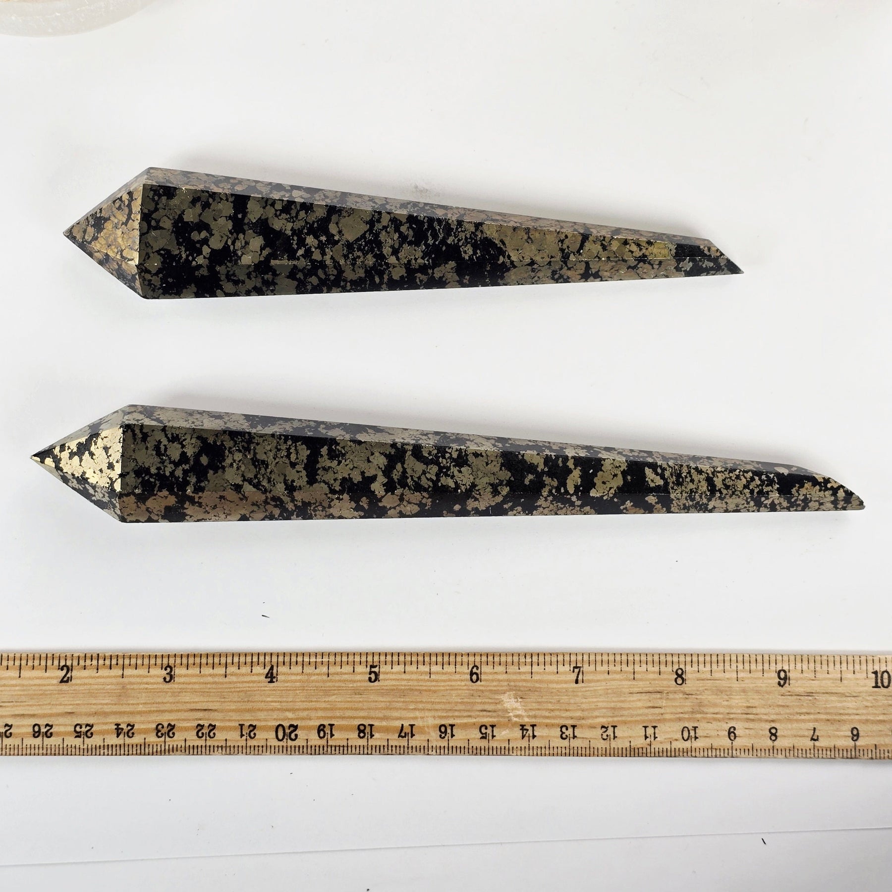 Stunning pyrite wands featuring natural basalt inclusions. They have a hypnotic pattern and beautiful luster. Wonderful for rituals and home decor.