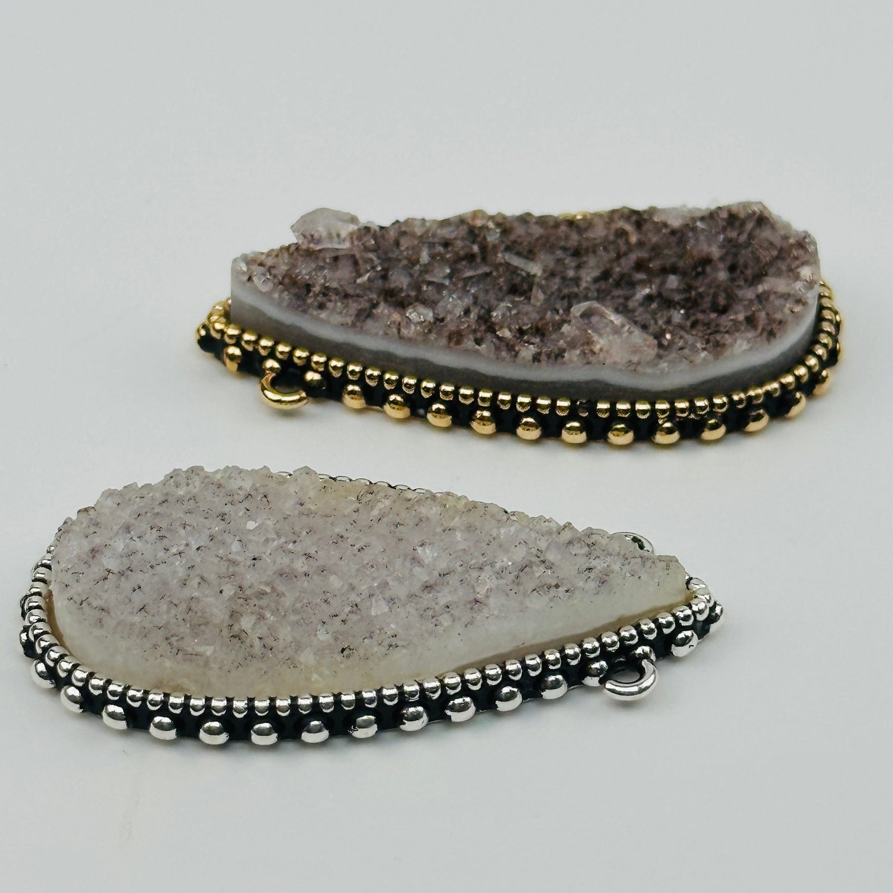 Each teardrop-shaped druzy pendant is edged in gold or silver electroplate, creating a stunning contrast that enhances the raw crystal texture. The double bails give you creative freedom—perfect for designing symmetrical necklaces, layered looks, or centerpiece statement pieces. Whether you're drawn to the soft lavender shimmer or the icy white sparkle, these pendants bring a touch of earthy elegance and modern glam to any jewelry collection.
