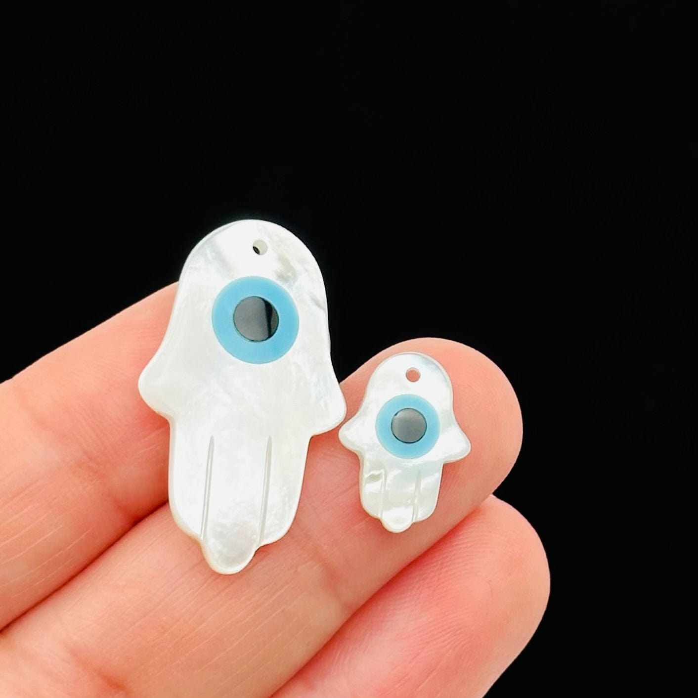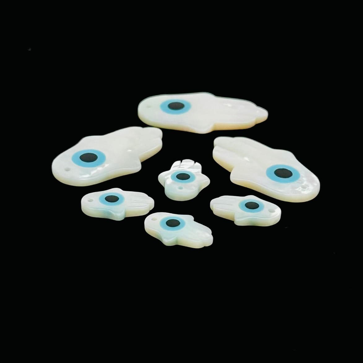 miltiple Mother of Pearl Hamsa Hand Eye Drilled Charms displayed to show the differences in the sizes