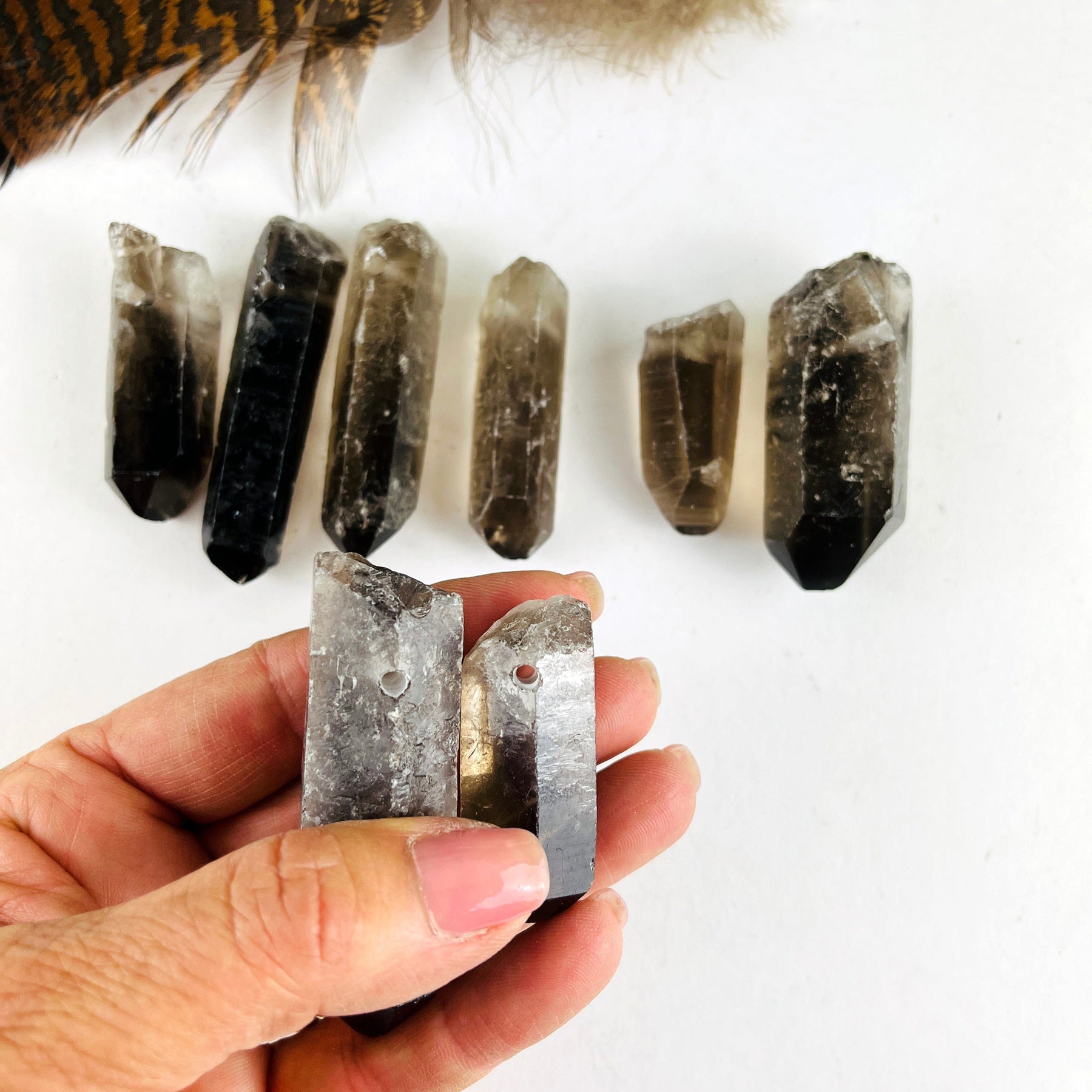 These natural Smoky Quartz point pendants are raw, unpolished, and drilled—ready to be worn or used in custom jewelry designs. Each piece showcases earthy tones and grounding energy straight from nature.