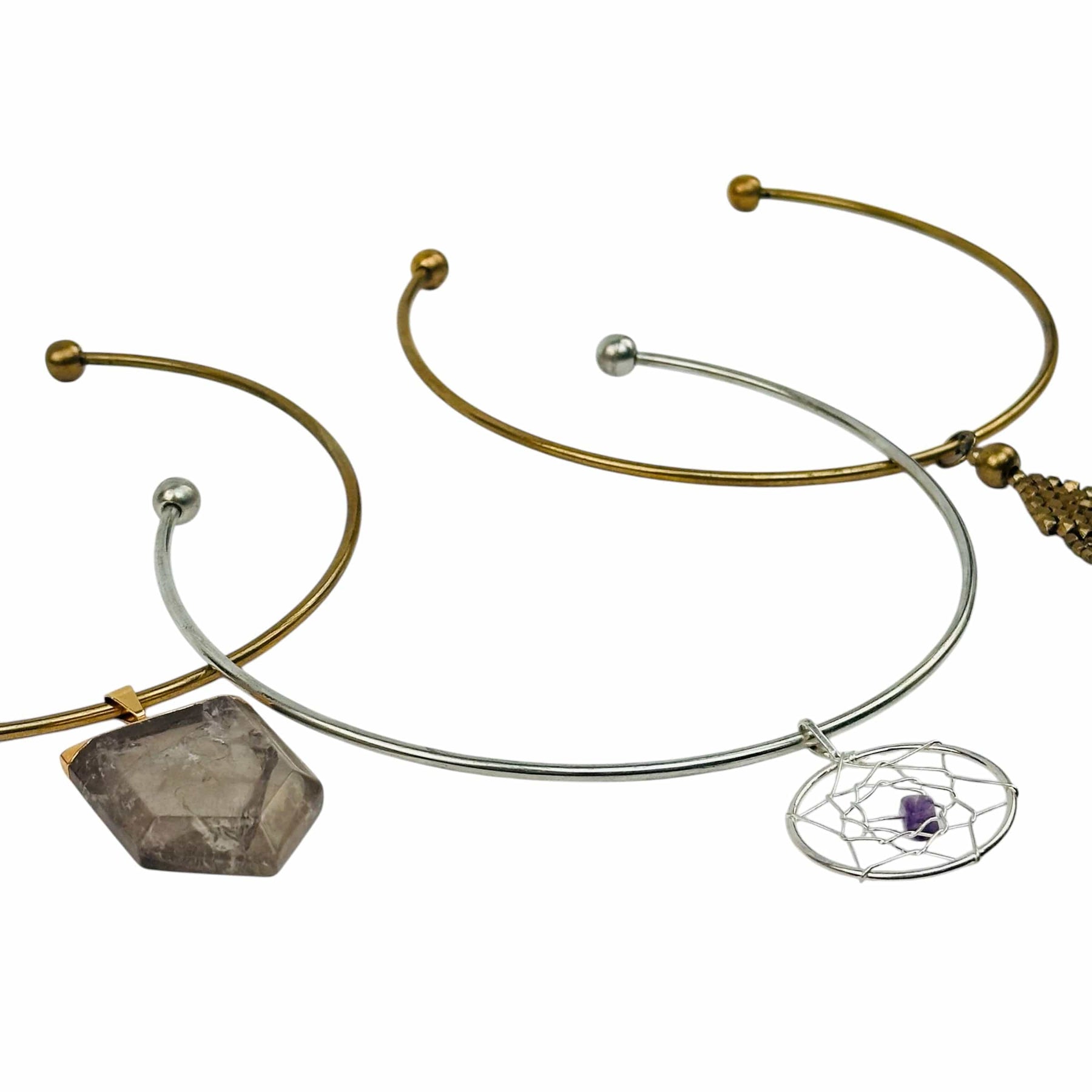 With their clean, open hoop shape and polished brass finish, these chokers are effortlessly cool. Easy to pair with any outfit—whether you're layering or wearing them solo. The end of these chokers have a twist ball that comes off and allows you to add your favorite pendant or charm!