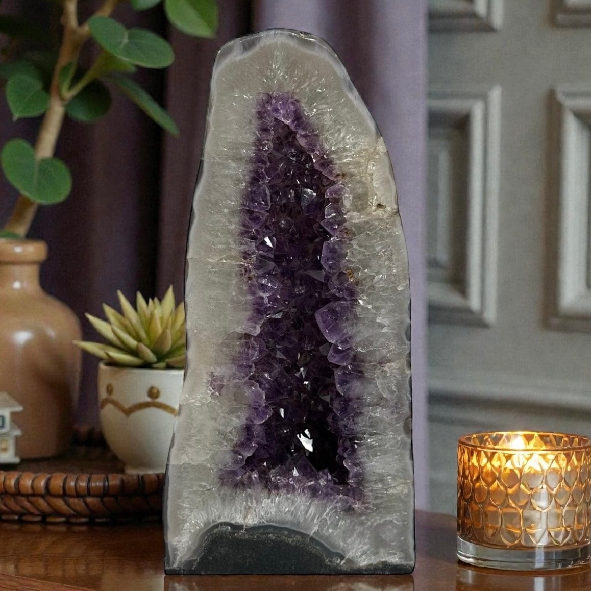 This stunning Amethyst crystal cathedral features rich purple tones and a natural stone back, highlighting its raw beauty. Often associated with calm, clarity, and spiritual balance, it makes a powerful statement piece for any space.