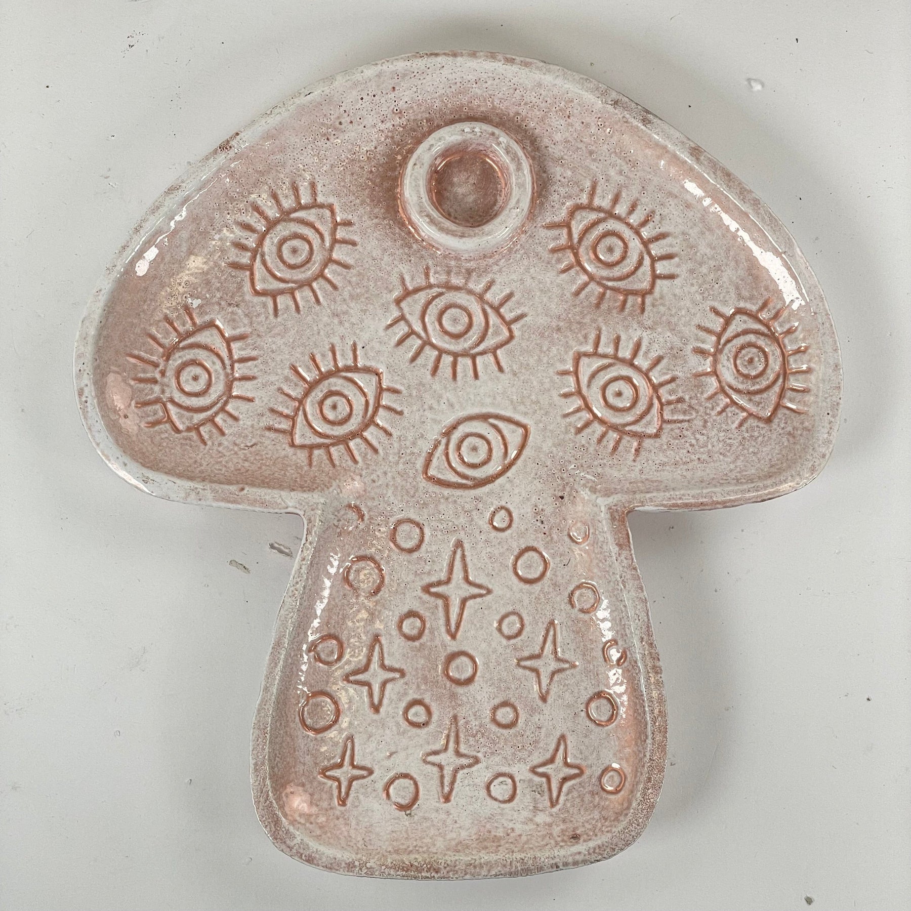 This mushroom tray features a unique design with evil eyes and sparkles. It has a space to hold cone incense on the top.
