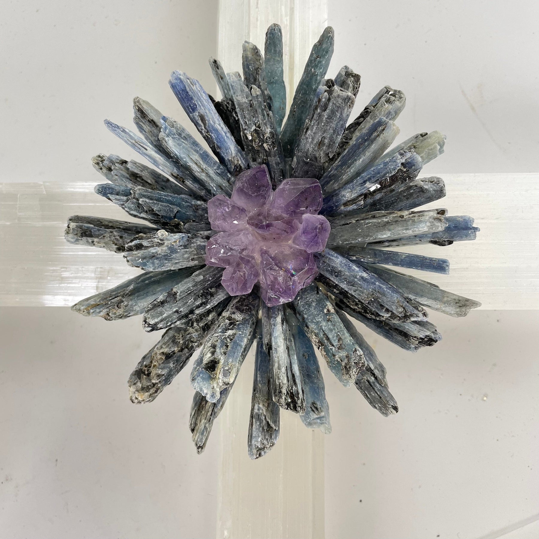 These stunning crystal crosses are made of selenite with a blue kyanite and amethyst flower accent.