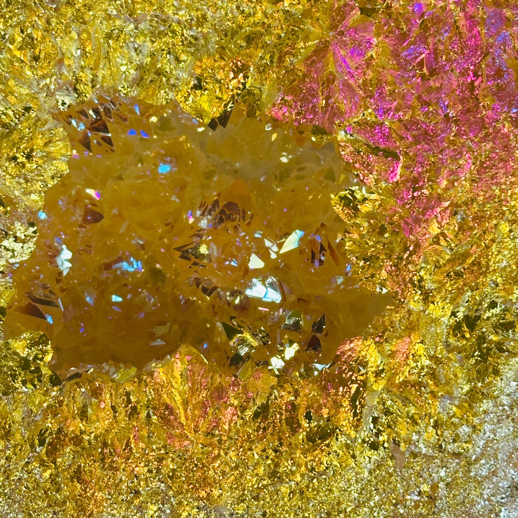 Sunshine aura quartz geodes are a brilliant mix of bright yellow, pink, orange and purple.