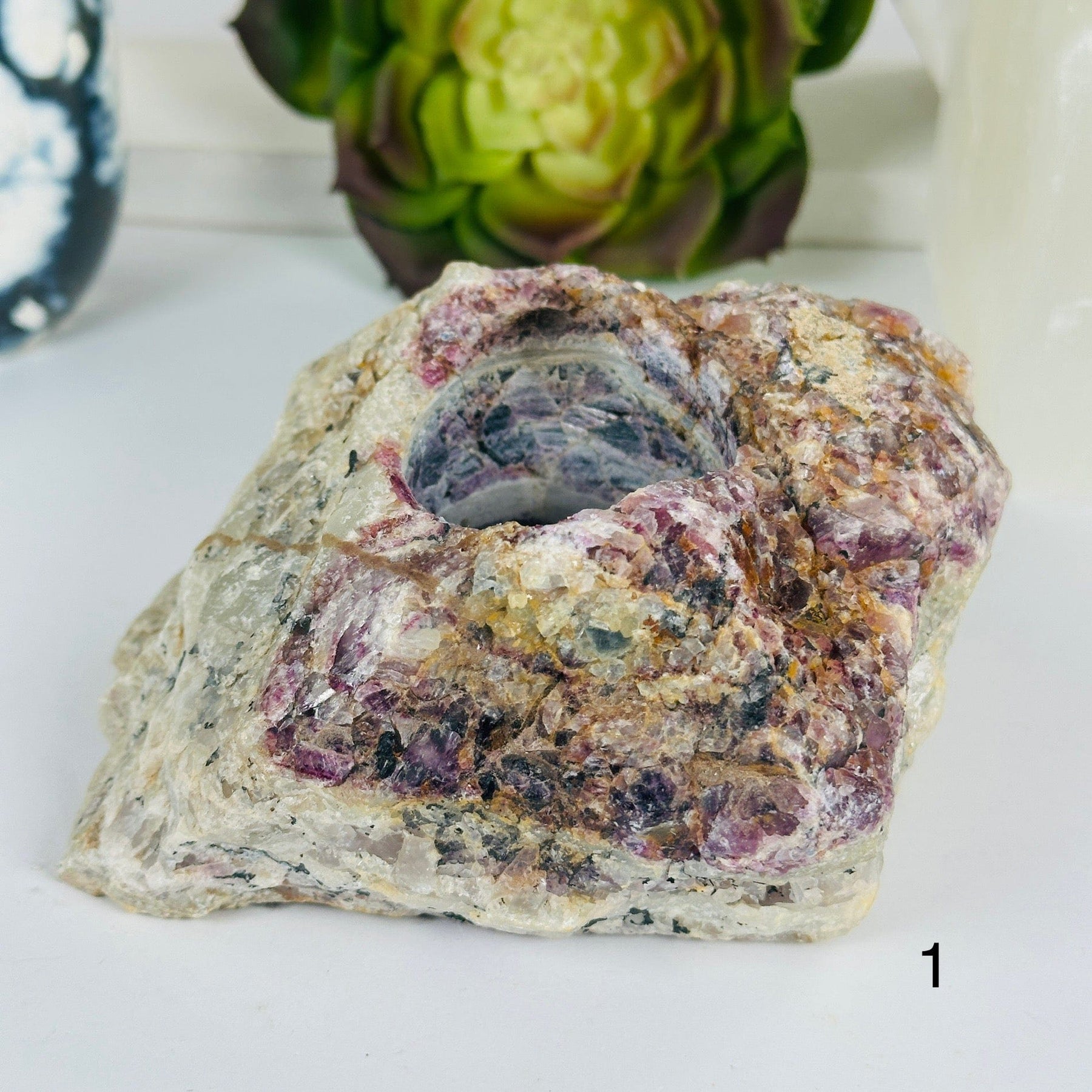 Functional Decor: The rough lepidolite candle holders act as functional decor when a candle is placed inside.