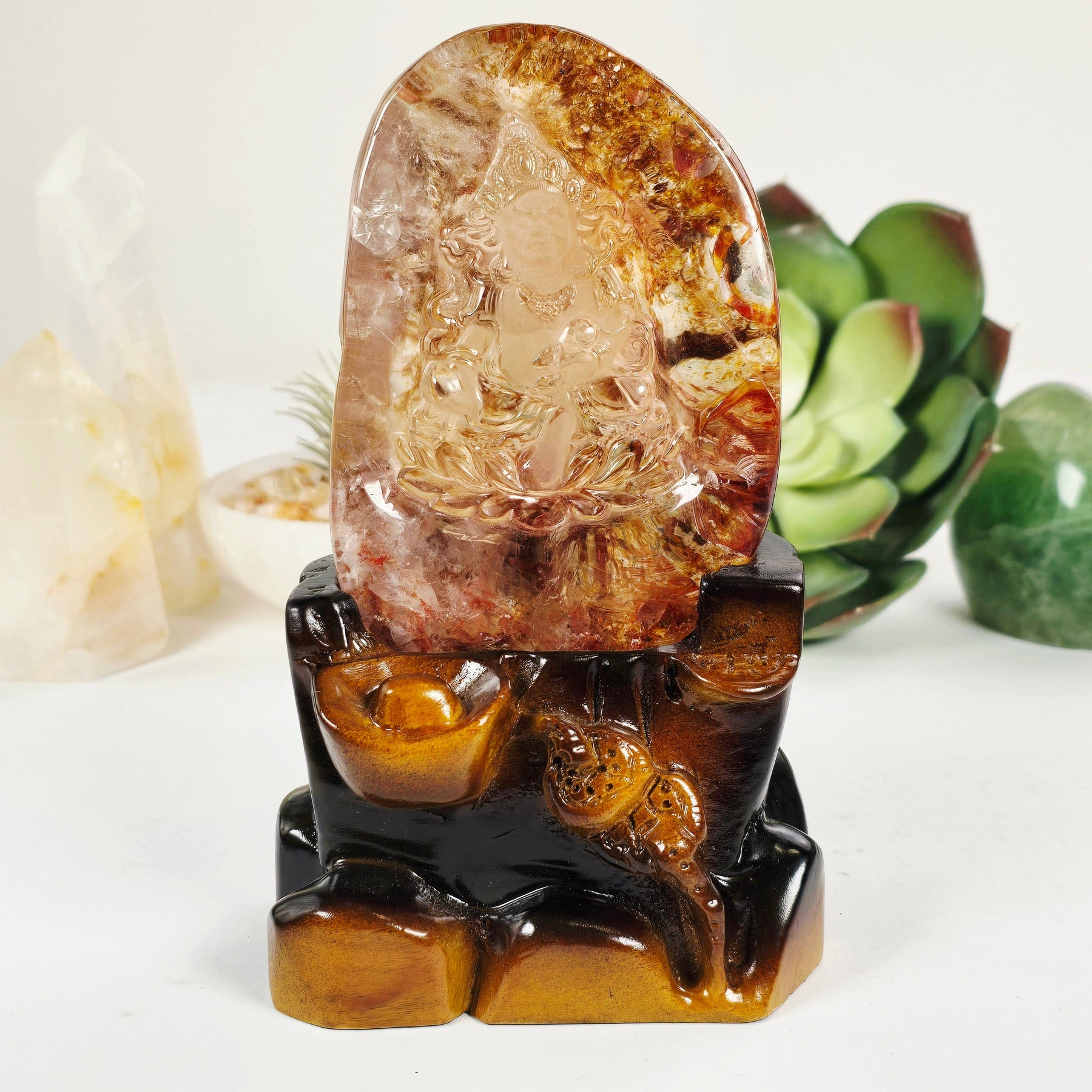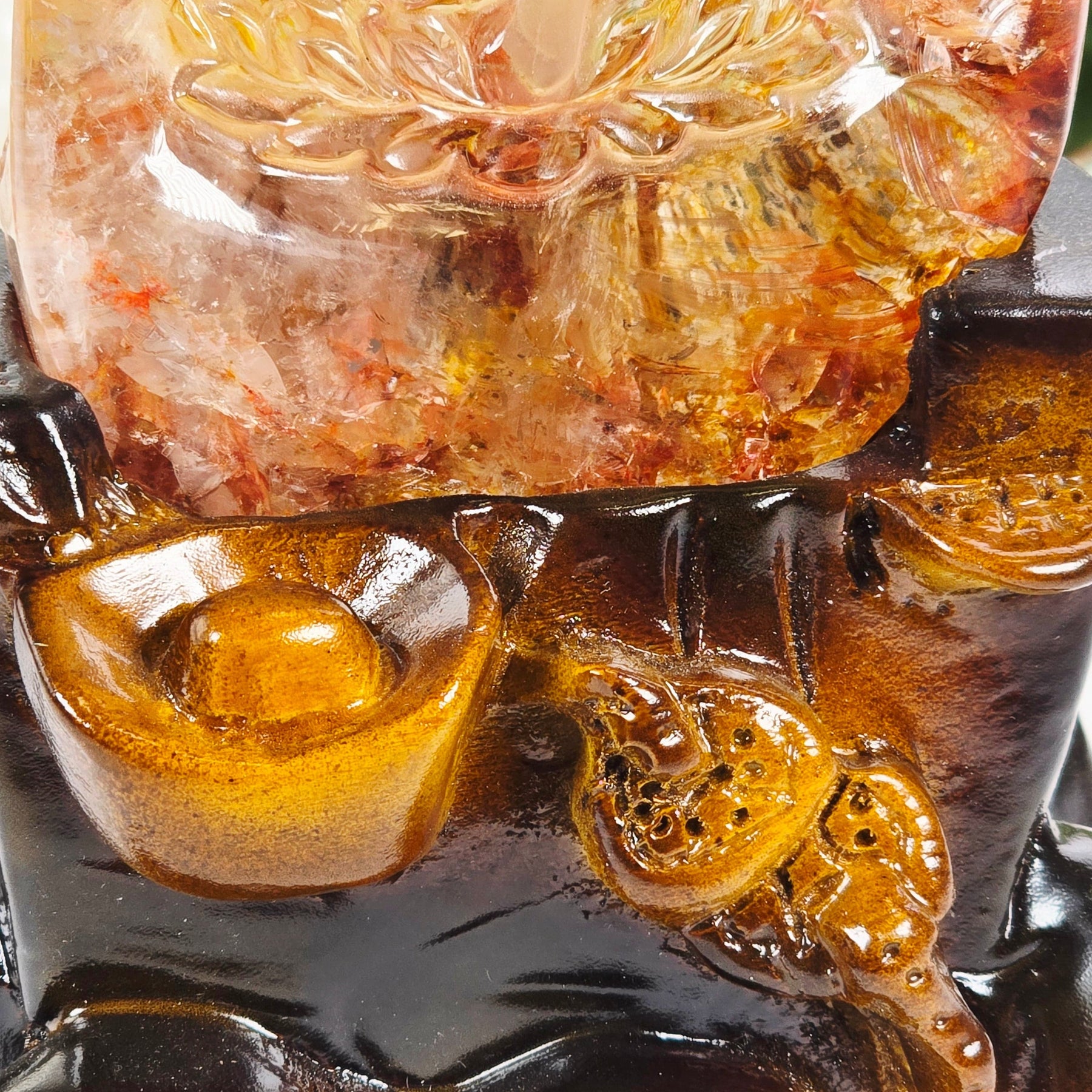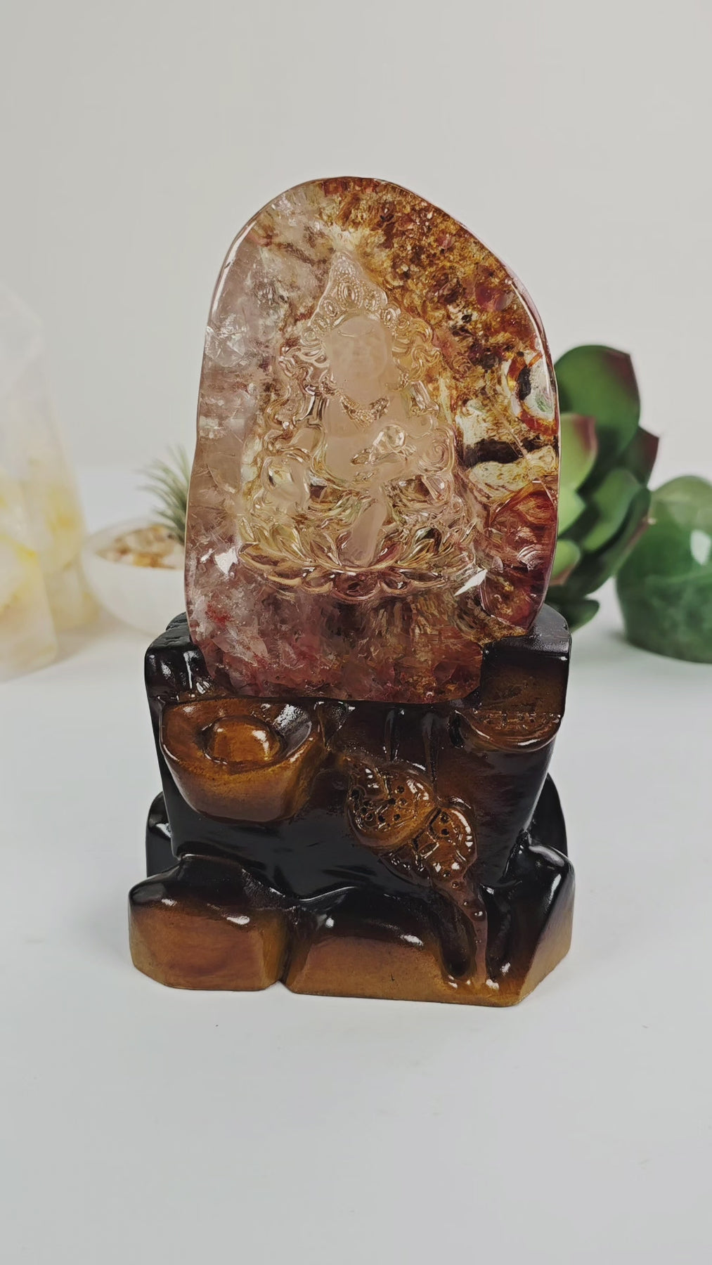 A magnificent Buddha has been carved into a polished garden quartz lodolite with red iron inclusions that radiate from the Buddha carving. It has been placed on an elaborately sculpted wooden base with Chinese symbols of good fortune that include a Yuanbao and lotus pods.