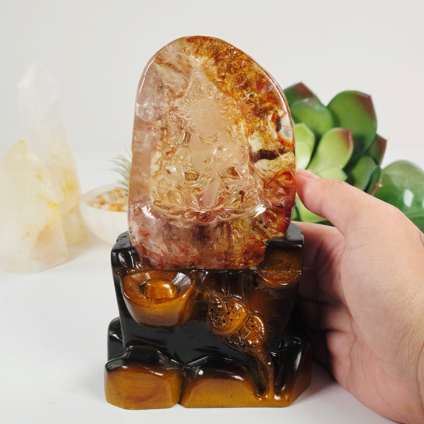 Lodalite Garden Quartz Buddha Crystal Sculpture on Carved Wooden Base from China - One-of-a-Kind with hand for size reference