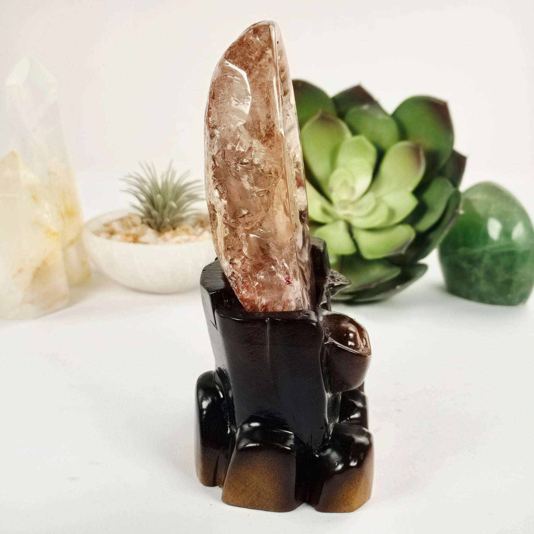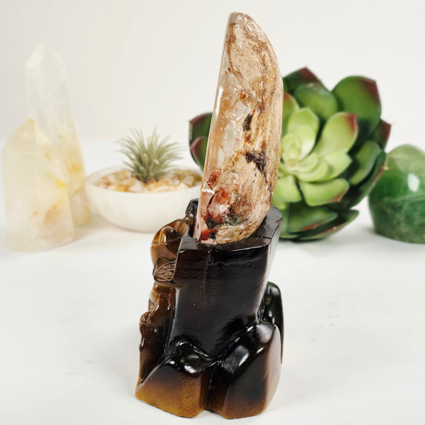 Lodolite Garden Quartz Buddha Crystal Sculpture on Carved Wooden Base from China - One-of-a-Kind