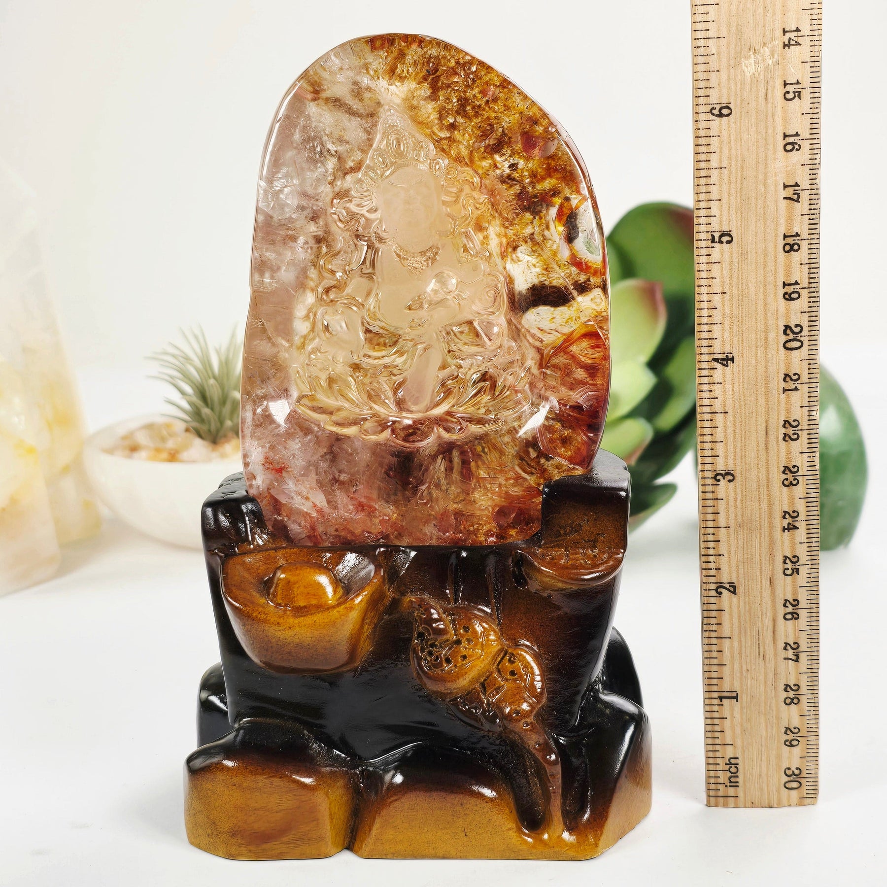 Lodalite Garden Quartz Buddha Crystal Sculpture on Carved Wooden Base from China - One-of-a-Kind with ruler for size reference