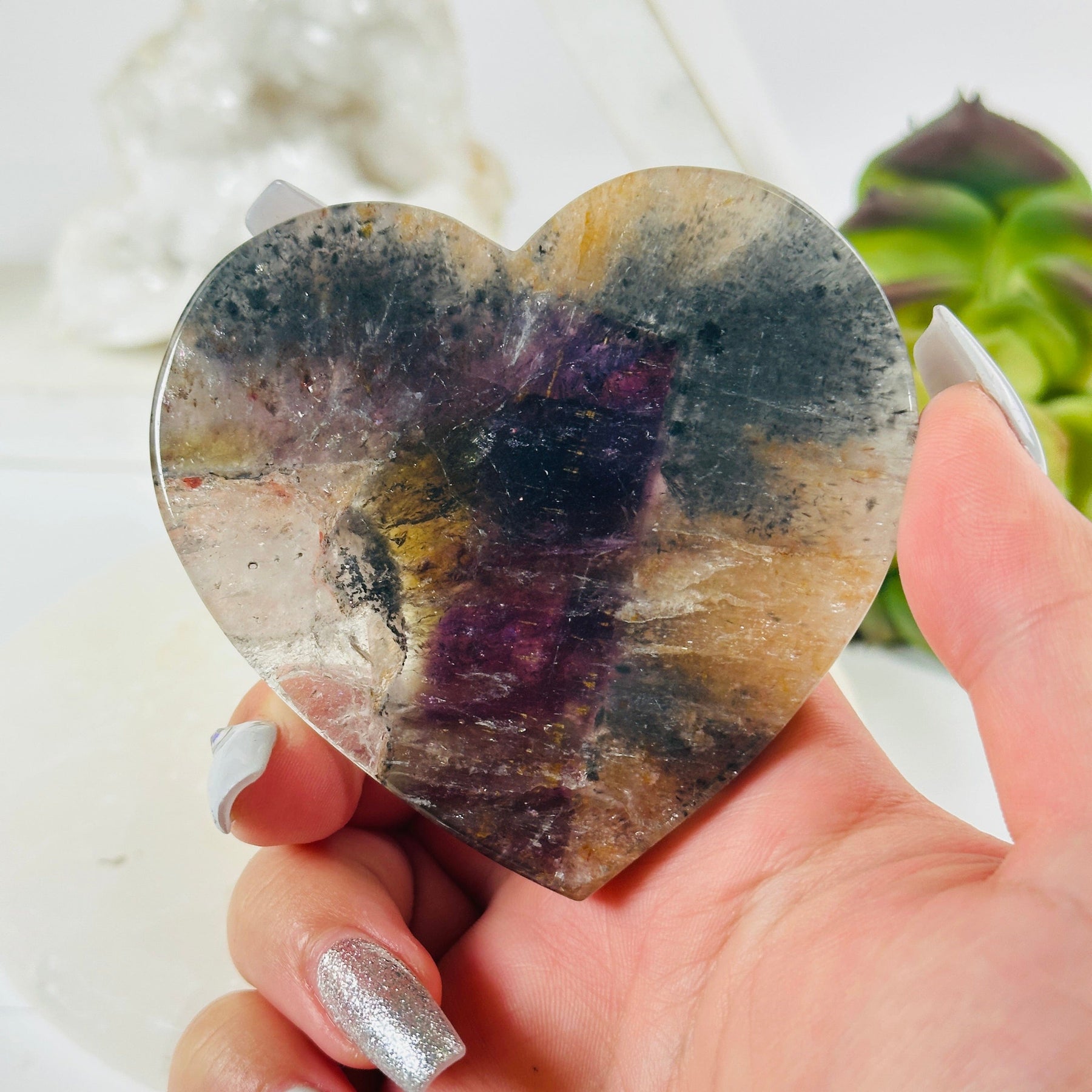 Super Seven is extremely rare and only found in Brazil. It consists of amethyst, cacoxenite, goethite, lepidocrocite, rutile, smokey quartz, and quartz. This Super Seven crystal has been hand cut and polished into a heart slice shape.