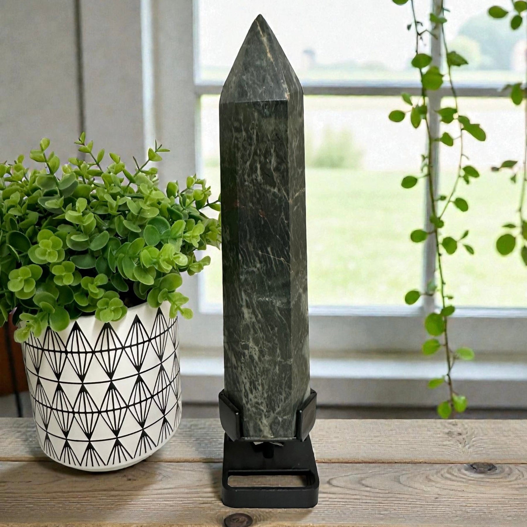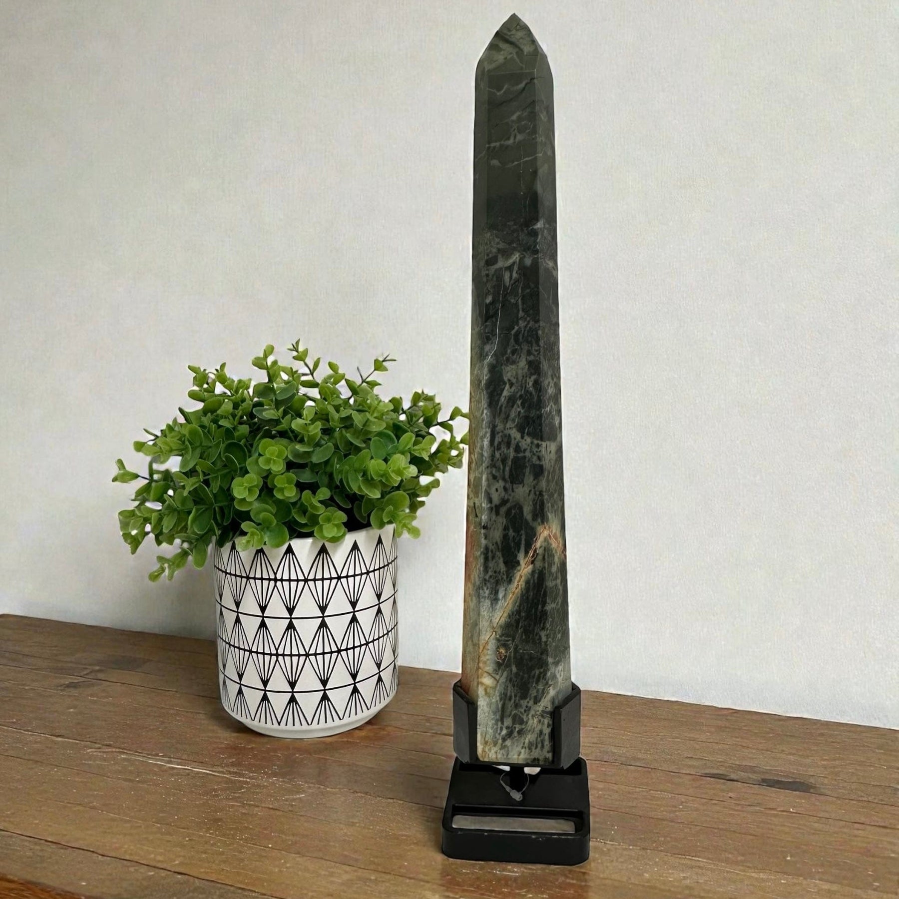 Bring grounded, earthy energy into your space with our Jasper Crystal Point on Stand. Jasper is known as the “Supreme Nurturer,” prized for its stabilizing and protective qualities. With rich natural patterns in shades of red, brown, gray or cream, every crystal point showcases the unique artistry of the Earth. Polished into a standing point and paired with a sleek display stand, this piece makes a striking décor accent while radiating calm, steady energy.
