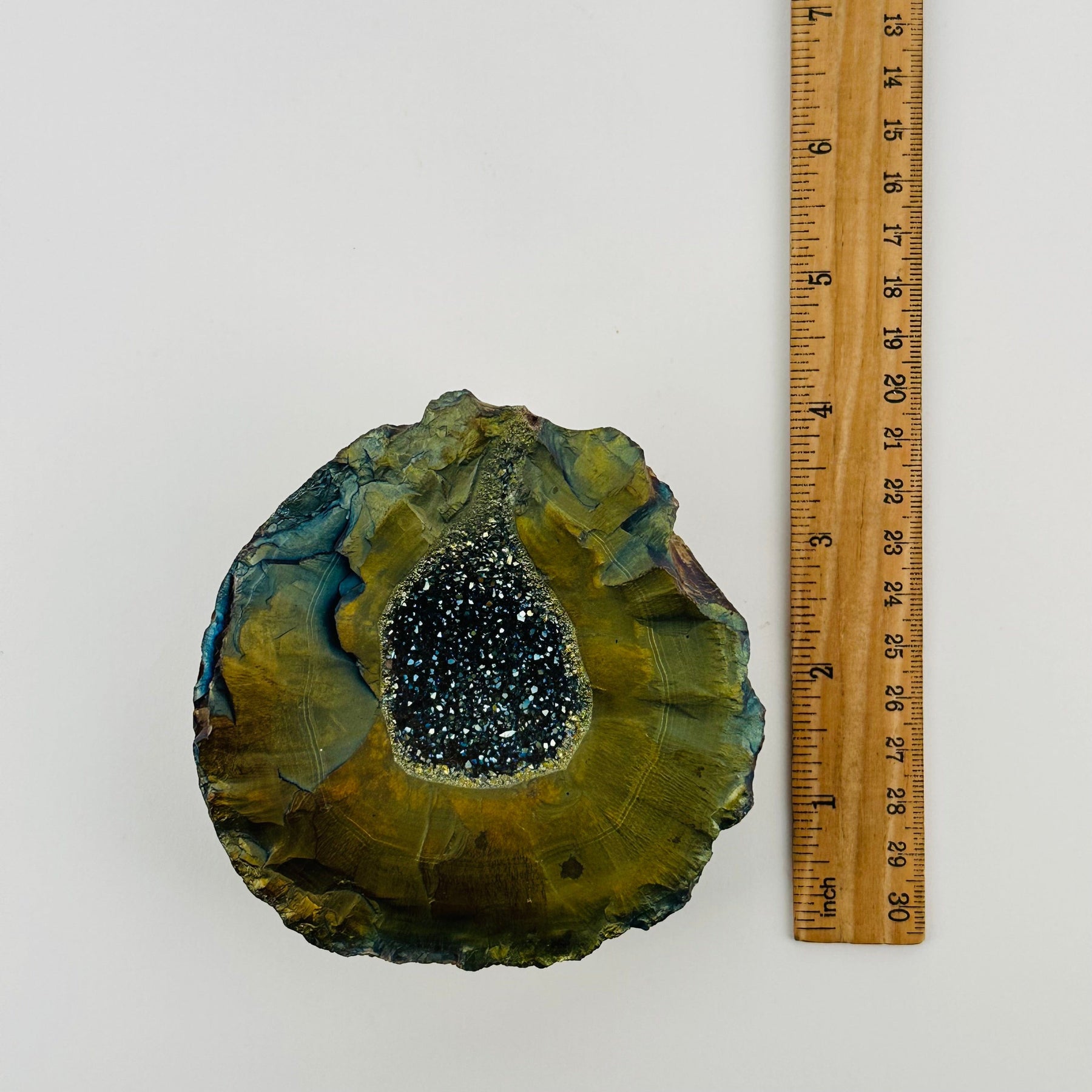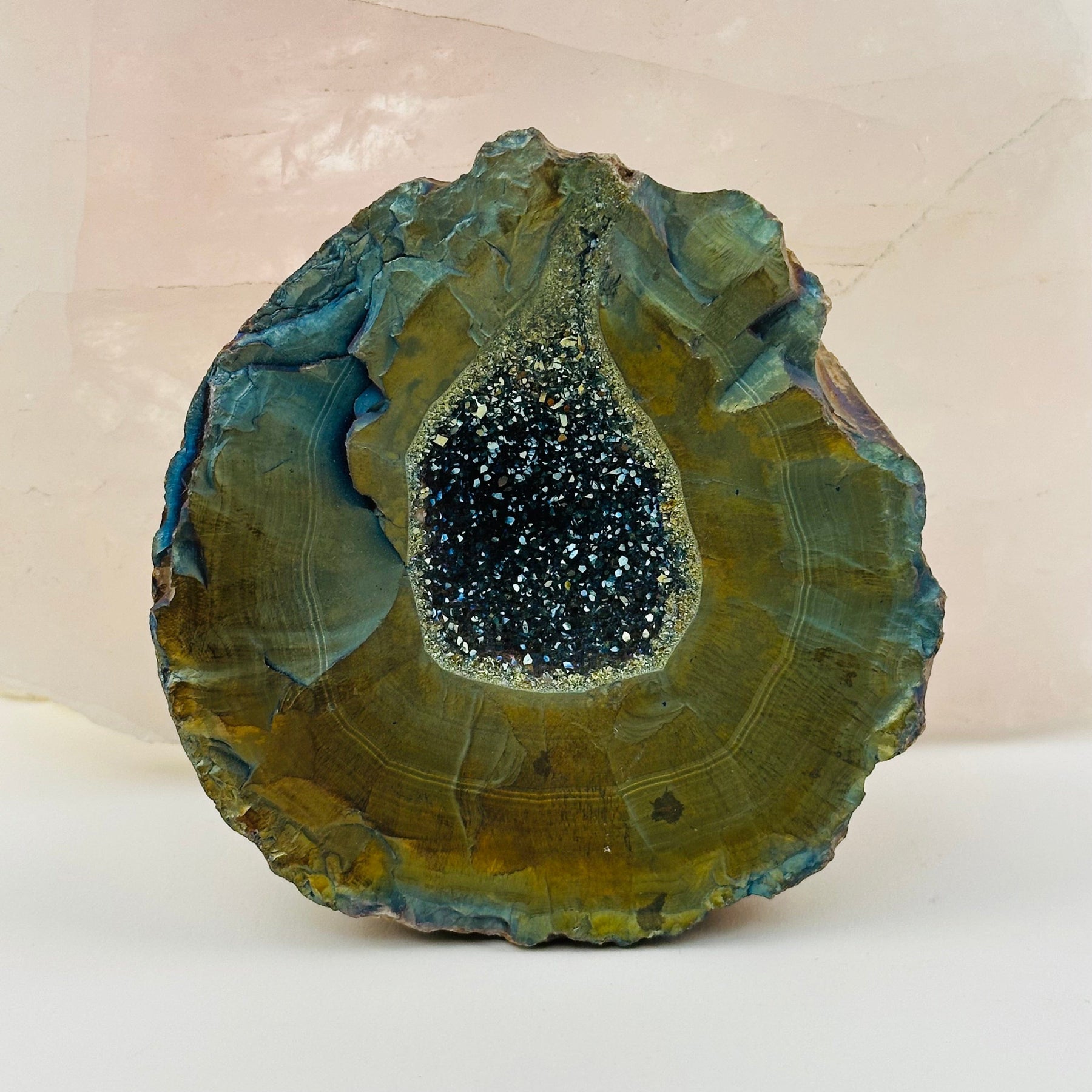 Unique Combination: This Rainbow Titanium Treated Crystal Geode with Druzy features an iridescent titanium coating fused with sparkling druzy crystals, creating a dazzling display of color, texture, and energetic power.